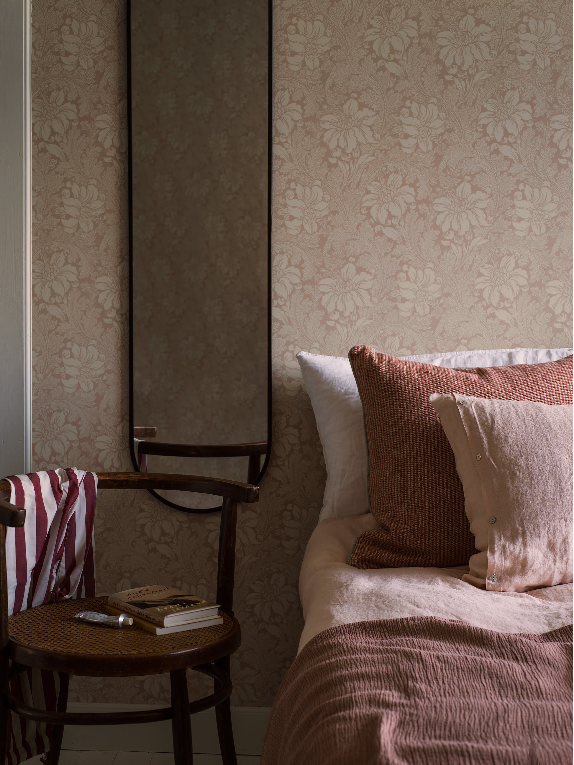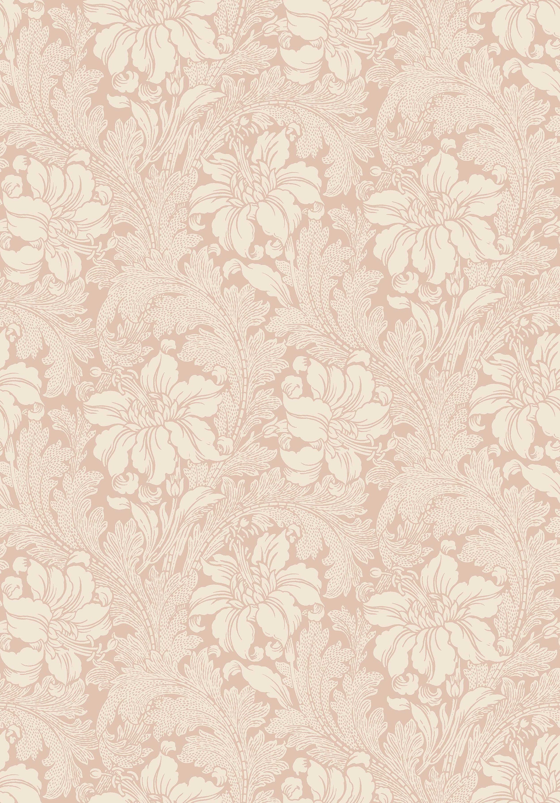 Suurikukkainen Acanthus-tapetti on saanut monia erilaisia muotoja vuosisatojen saatossa. Alkuperäismalli painettiin käsin päärynäpuusta kaiverretuilla lohkoilla jo 1840-luvulla. Koristekuvion mutkittelevat kukat on sittemmin painettu monin eri tavoin aina täyteläisistä sävyistä kirkkaisiin 1980-luvun pastelleihin. Mallistossamme Acanthus herää eloon liimapainettuna lempeillä pastellisävyillä, joihin yhdistyy ripaus mustaa. Pehmeä beige ja vaaleanpunainen versio sopii yhtä hyvin makuuhuoneeseen ja lastenhuoneeseen kuin olohuoneeseen.