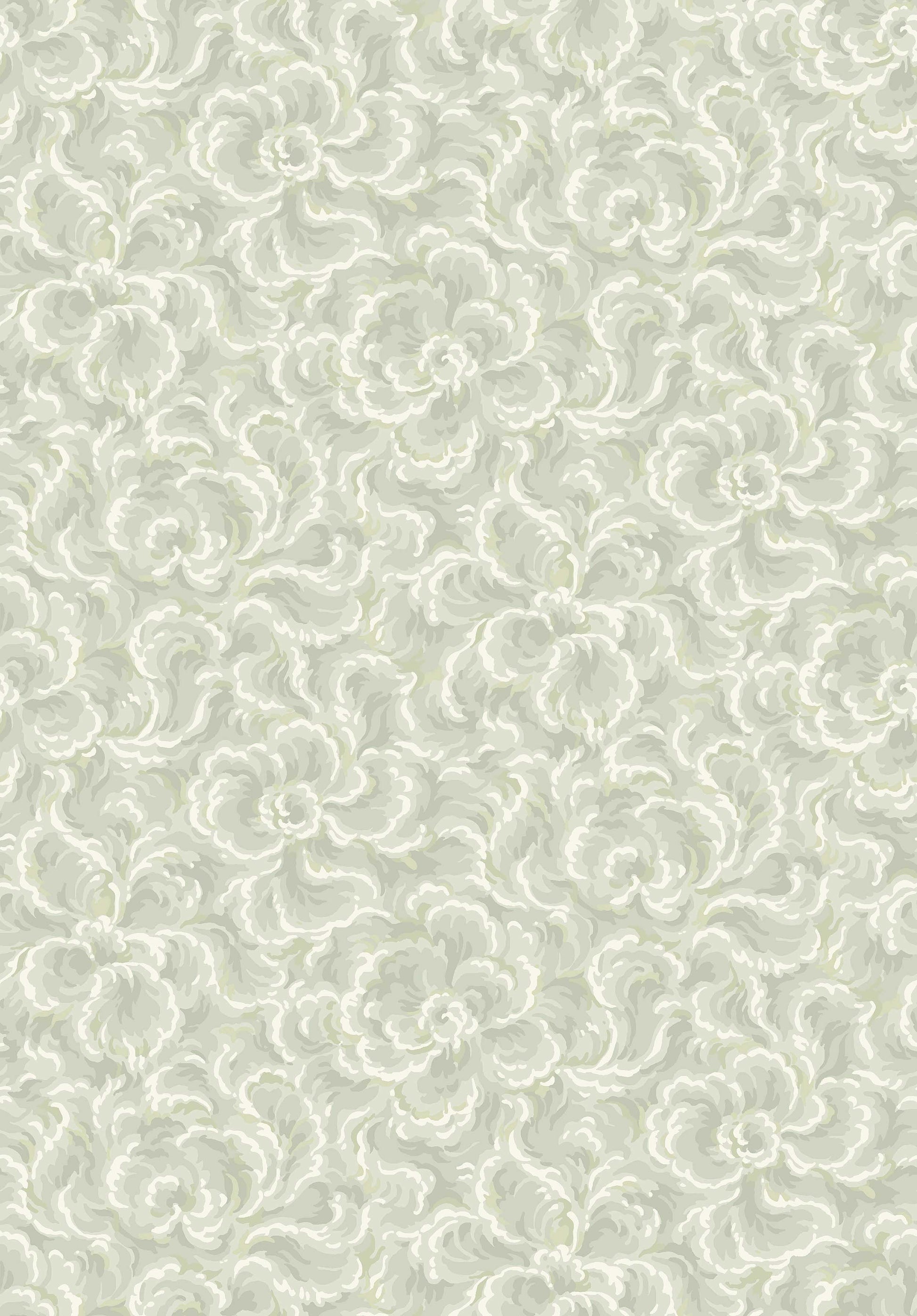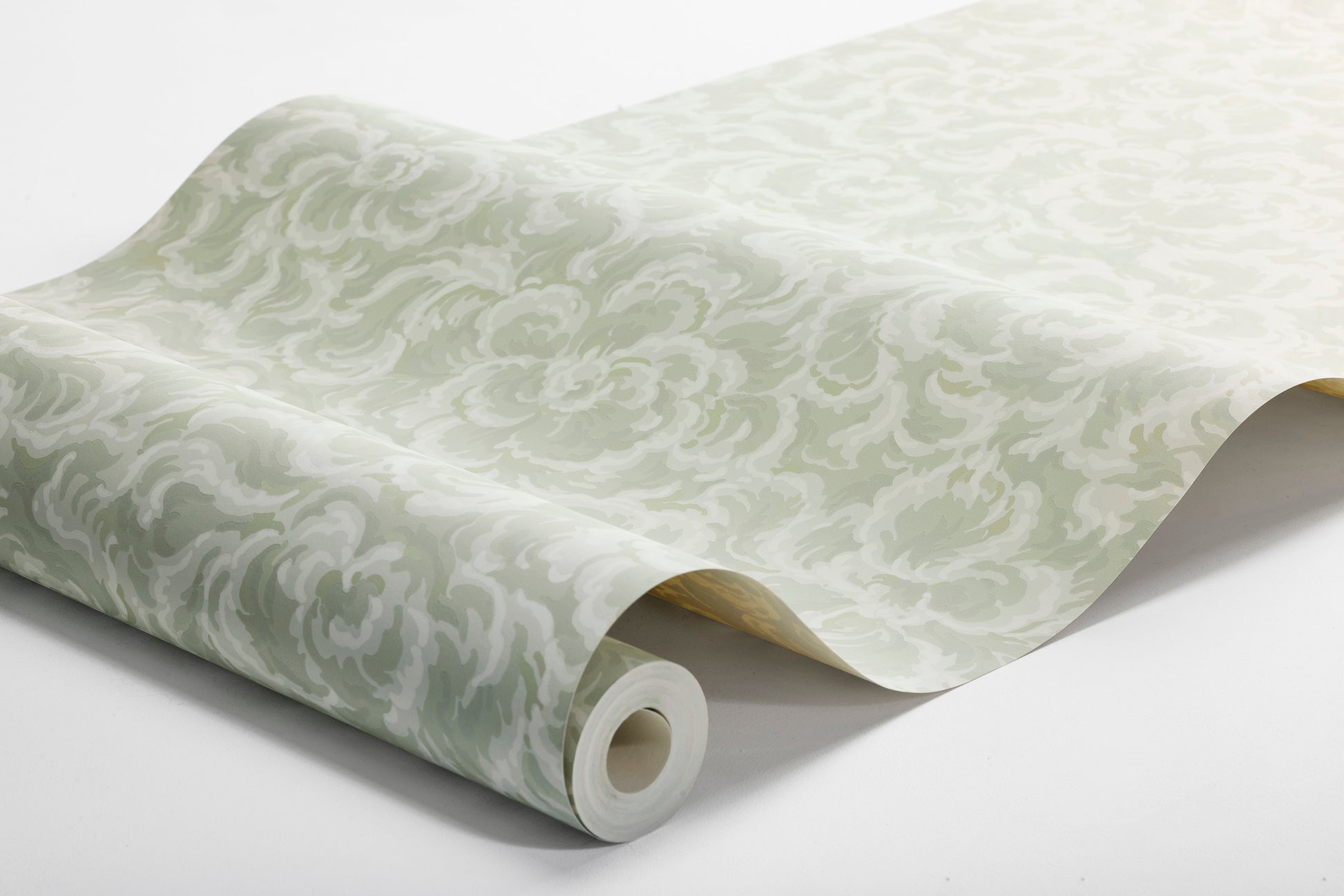 Änggården-tapetin abstrakti ja aavistuksen utuinen kuosi vie ajatukset pehmeään pilvitaivaaseen, ja tapetti sopii sekä seinälle että kattoon. Arkistossamme oleva alkuperäinen maalattu malli on luultavasti peräisin 1930-luvulta, ajalta, jolloin modernismi toi mukanaan hillittyjä tapetteja taustaksi muulle sisustukselle. Näin kuviollisista tapeteista, joissa ei ollut varsinaista aihetta – mutta paljon luonnetta – tuli erittäin suosittuja. Tässä Änggården-tapetti on liimapainettu pehmein ja miellyttävin vihrein värisävyin, joiden joukossa on valkoisia yksityiskohtia.