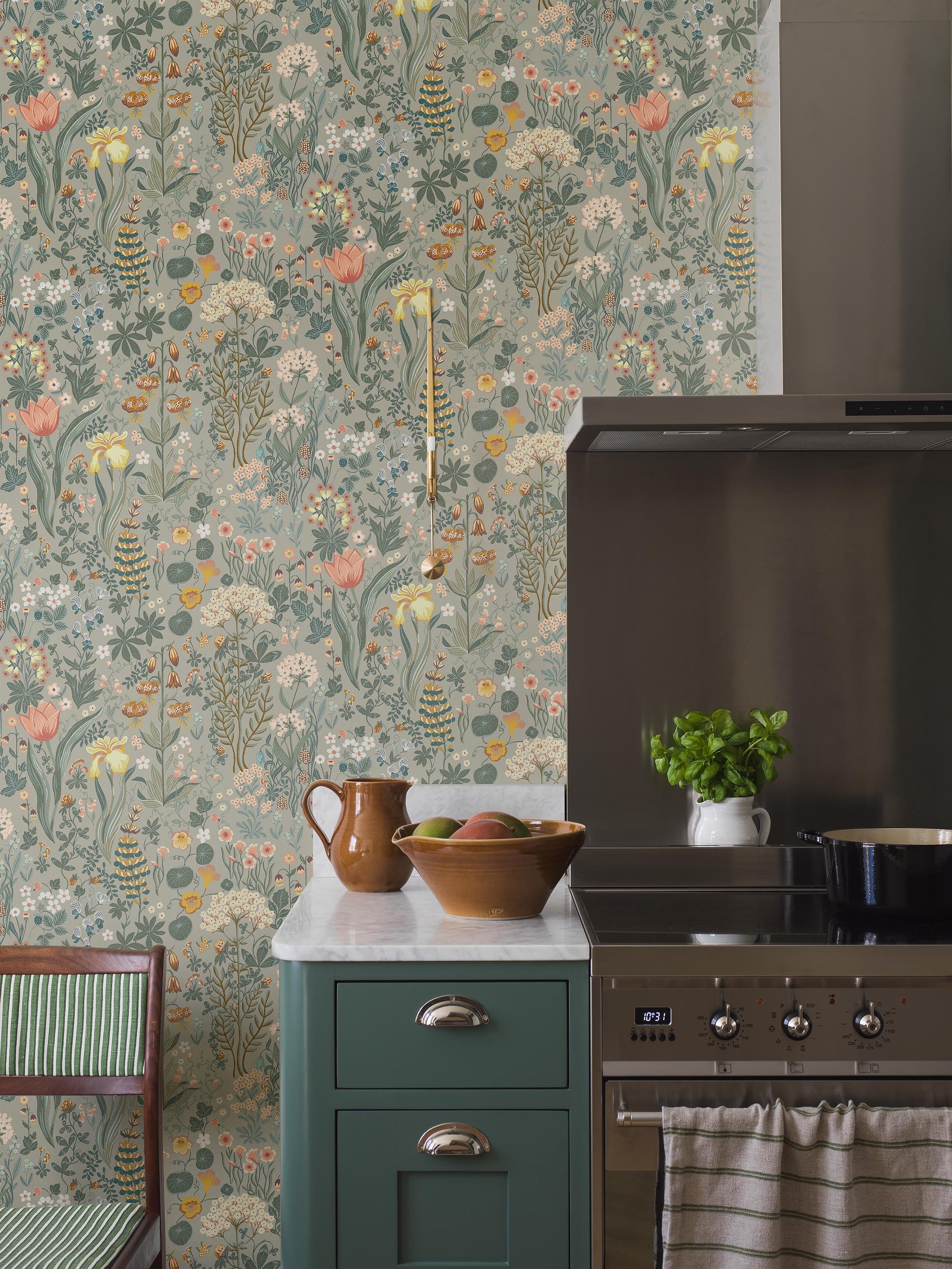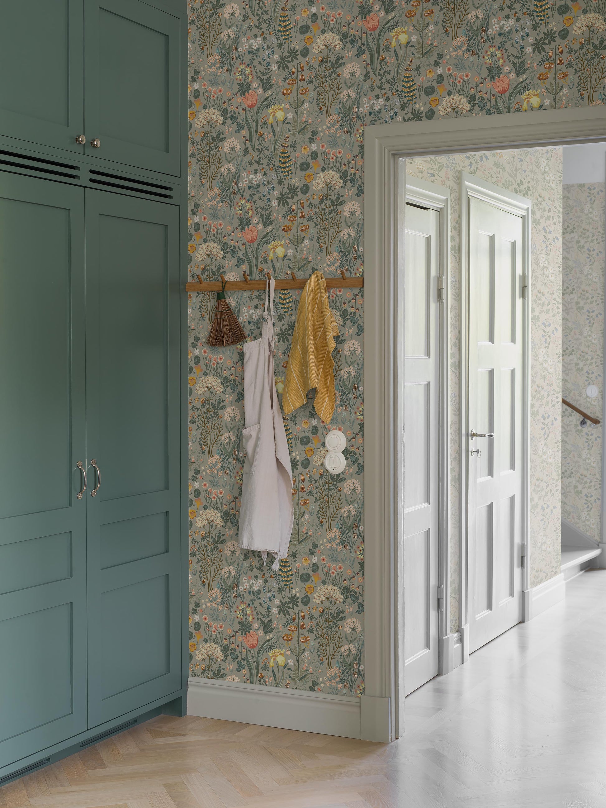 Upea Blomsterhav-tapetti esittää suunnittelija Noomi Spangen lapsuuden suosikkikasveja. Mukana ovat tuoksuherneet, krassit, karhunvatukat ja mansikat vanhempien puutarhasta, mutta myös kurjenmiekat ja ojakellukat läheisen Sundborn-joen rannoilta. Tässä versiossa on pehmeitä sävyjä, kuten keltaista, vaaleanpunaista ja vihreää lämpimänharmaalla pohjalla. Saat kukkatapetin, jossa on paljon kaikkea. Värimaailma yhdistää yksityiskohdat rauhalliseksi, harmoniseksi kokonaisuudeksi, joka sopii kauniisti huoneen kaikille seinille.