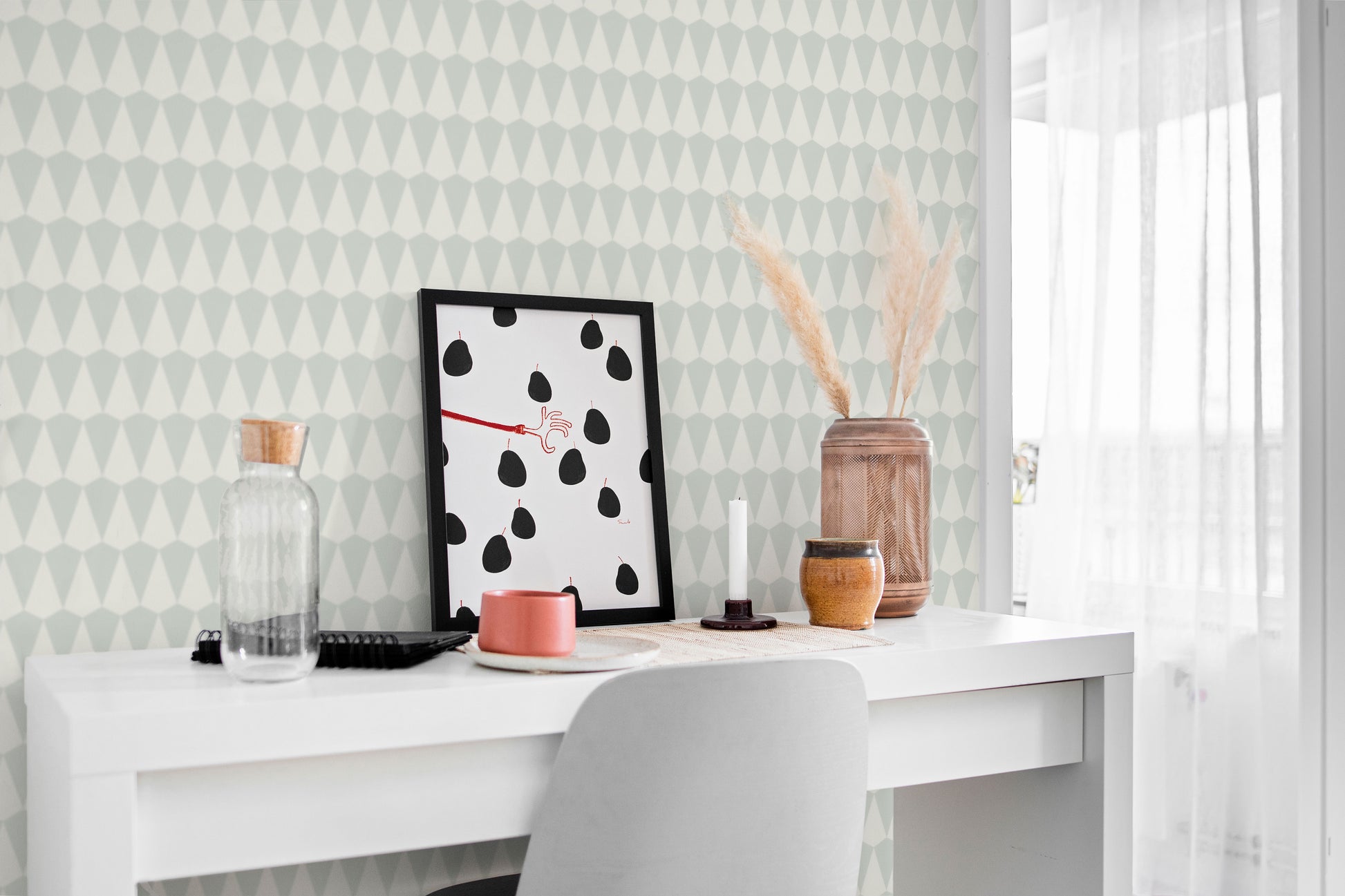 Leikkisän graafisen tapetin geometrinen kuosi sopii niin eteiseen kuin keittiöön tai lastenhuoneeseenkin. Tässä versiossa kuosi on painettu vaaleanvihreällä, hieman minttuun vivahtavalla sävyllä kermanvalkoiselle pohjalle. Samasta tapetista on saatavana myös beige ja valkoinen värisävy. Tasapainoisen värityksen ansiosta tapetti sopii hyvin sekä pienille että suurille pinnoille. Nykyaikainen, ruotsissa valmistettu paperitapetti henkii klassista laatua.