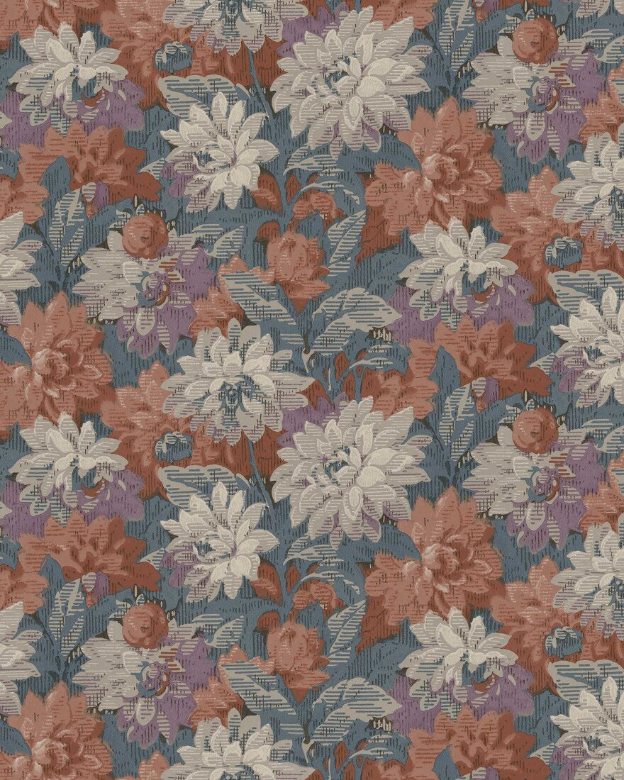 Suurikukkainen Delilah-tapetti on huolellisesti luotu uudelleen yli satavuotiaasta gobeliinitapetista, joka löytyy historiallisesta arkistostamme. Rehevien daalioiden tiheästä kuviosta voi erottaa hienovaraiset viivat, jotka antavat tapetille sen kodikkaan, tekstiilimäisen tunnun.Tässä näet Delilah-tapetin syvänsävyisessä värimaailmassa, jossa kukat ja lehdet hehkuvat harmaanlilan ja tiilenpunaisissa sävyissä kyyhkyssinistä lehvästöä vasten.