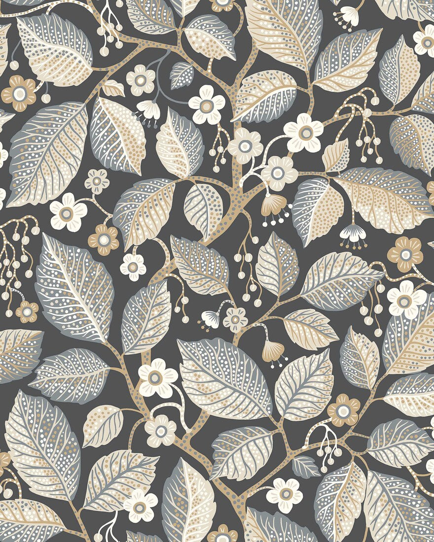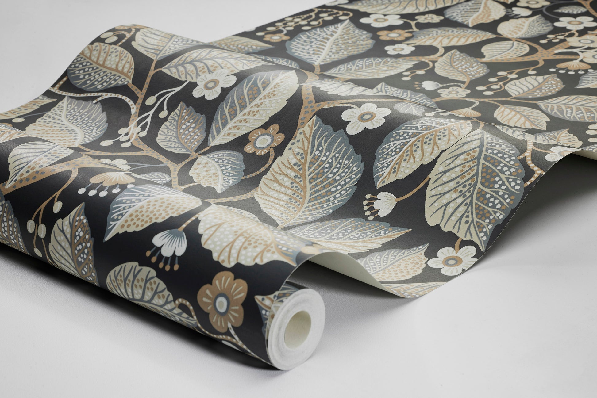 Elm Tree on tumma, suurikuvioinen tapetti, jossa on elinvoimainen kuvio kauniita jalavanlehtiä sekä söpöjä mielikuvituskukkia ja riippuvia kasveja. Tapetissa on vahva muotokieli ja kontrastit – mutta se on myös harmoninen sekä väriltään että muodoltaan.Tässä on liimapainettu Elm Tree -versio, jossa on harmaan, valkoisen, beigen ja ruskean sävyjä mustalla pohjalla. Neutraali väripaletti sopii erityisen hyvin yhteen puun ja muiden luonnonmateriaalien kanssa.