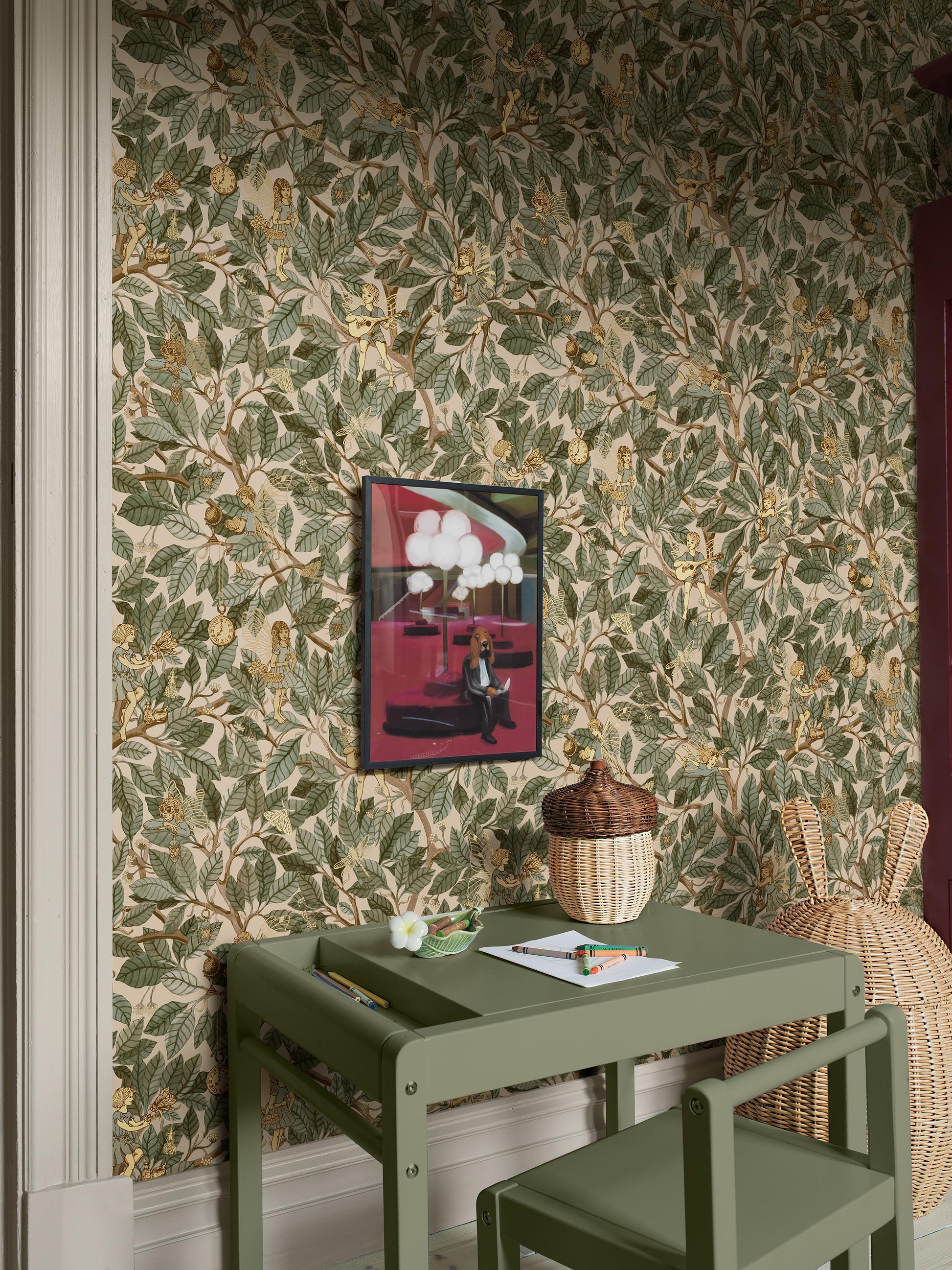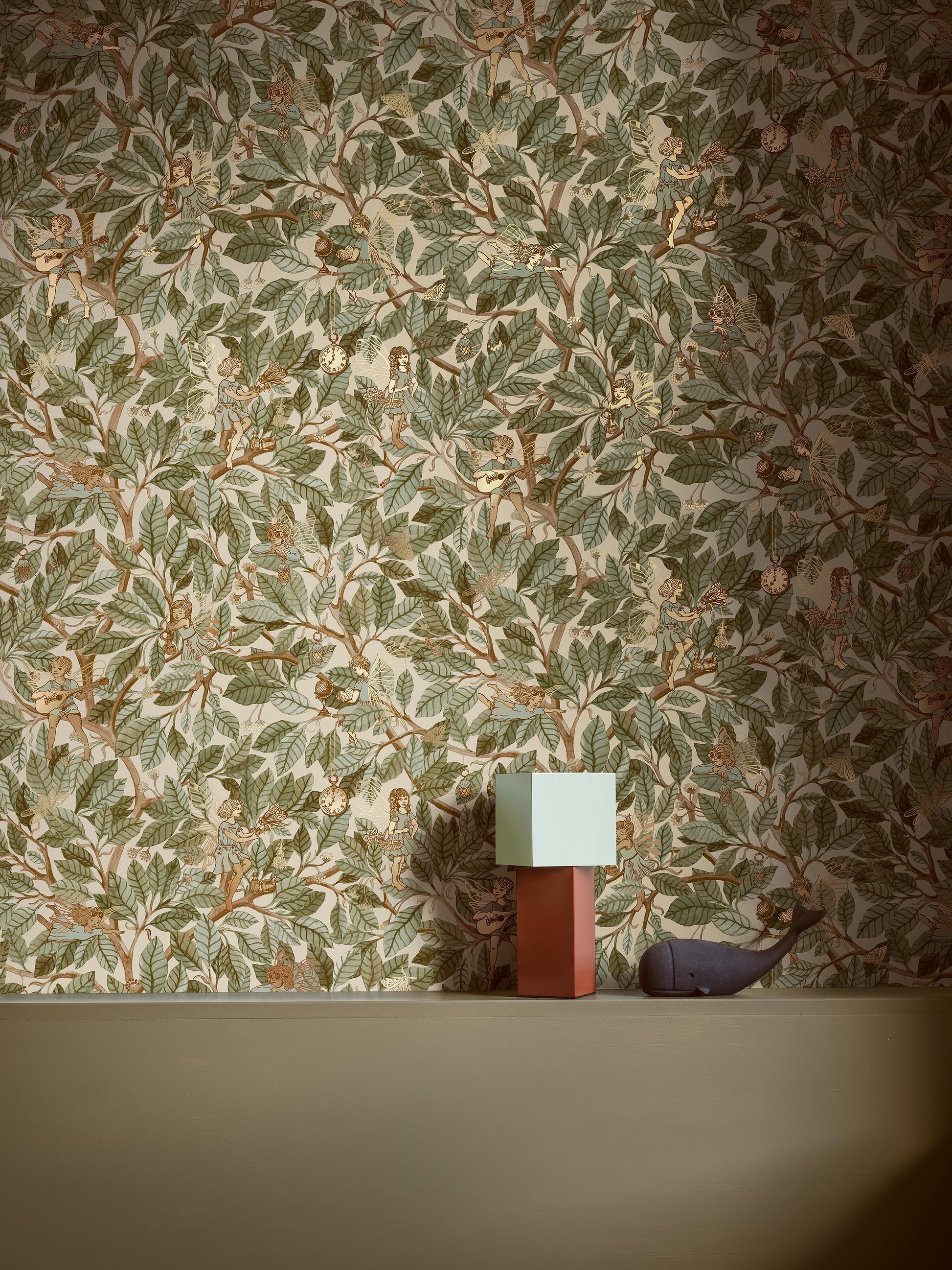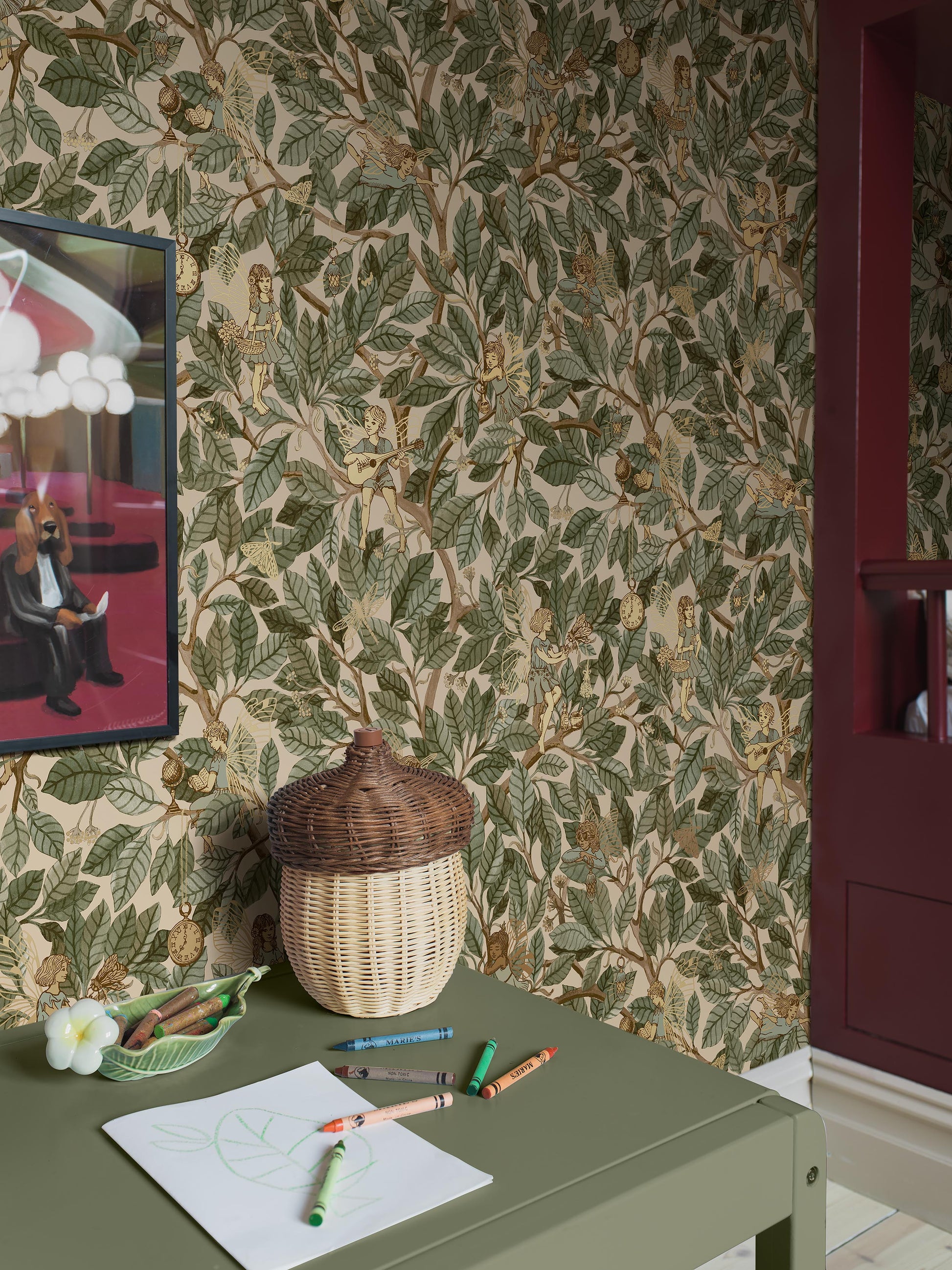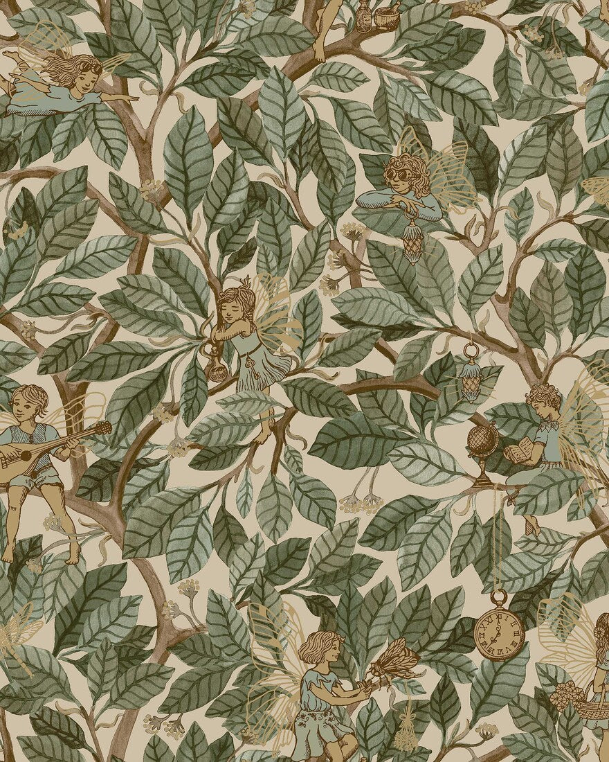 Fairies-tapetille levittäytyy tiheä lehvästö, joka hohtaa hillitysti kullanvärisenä, kun valo osuu siihen sopivasti. Jos katsot tarkemmin, löydät lehtien joukosta sudenkorentoja, yöperhosia ja keijuja – ja monia söpöjä pikkuasioita, joita keijut ovat keränneet metsäänsä. Tässä on Fairies-tapetti vihreän ja kullan sävyissä vaalean beigellä taustalla. Harmoninen lastentapetti, joka inspiroi ihaniin leikkeihin.