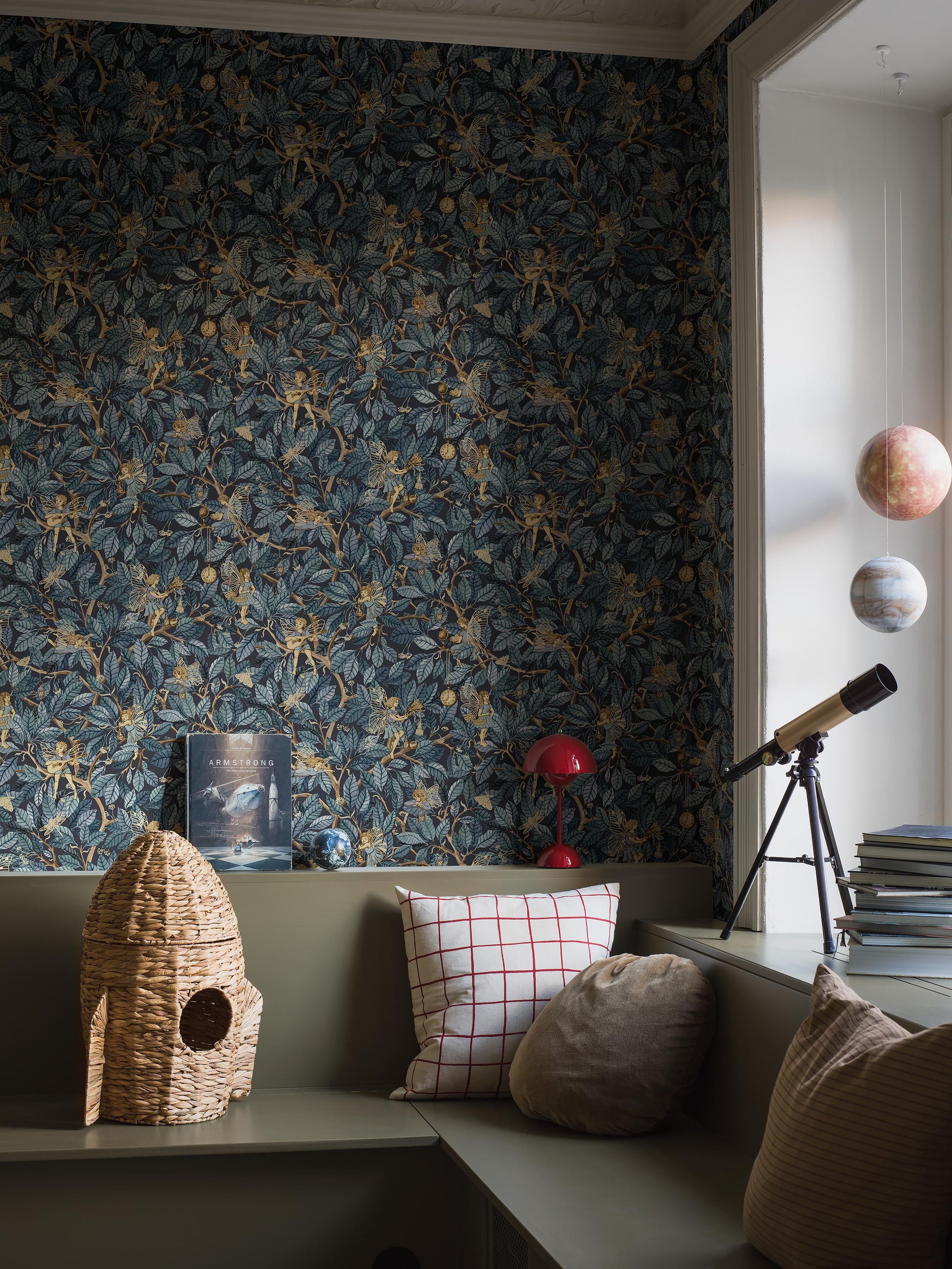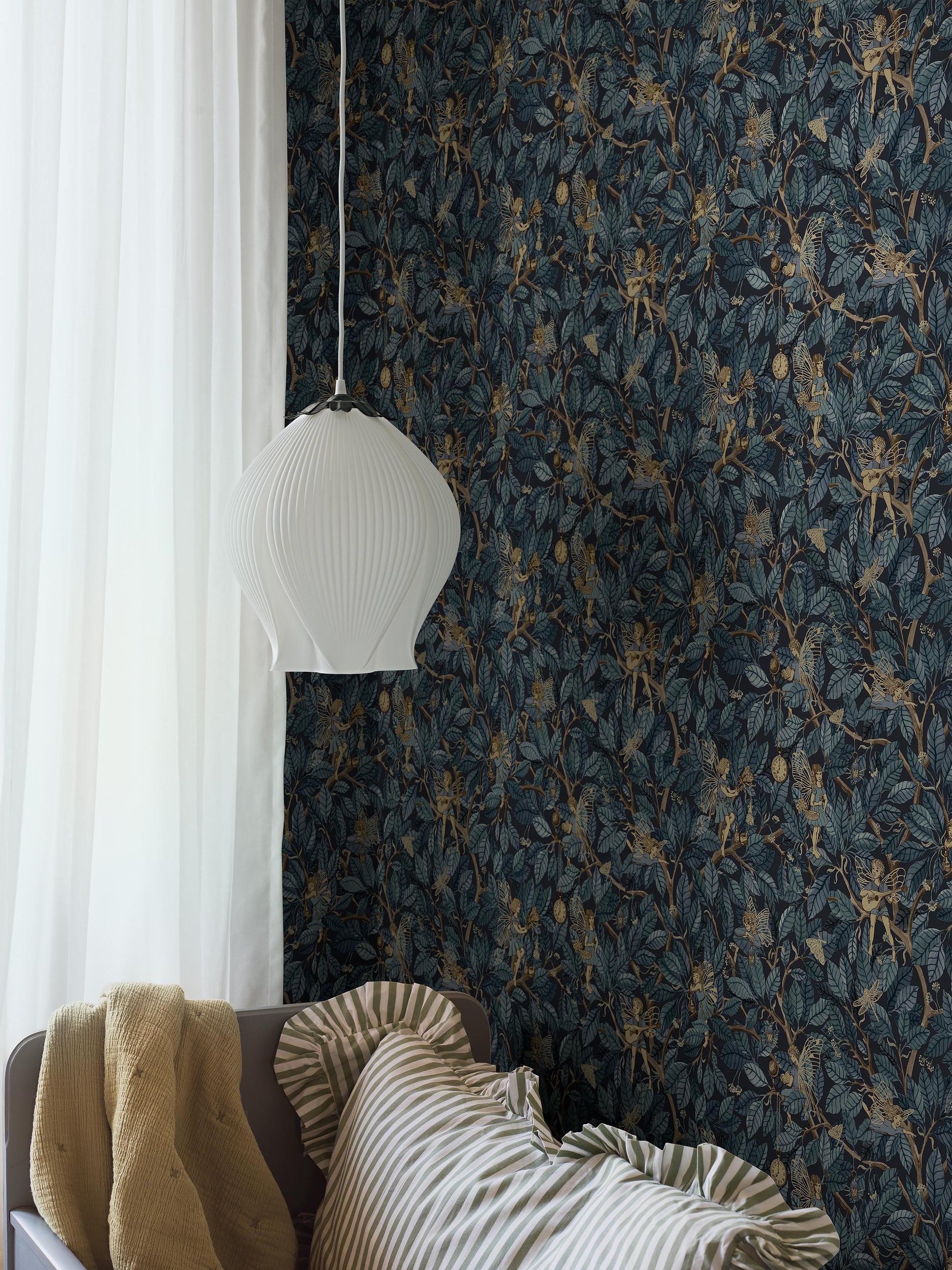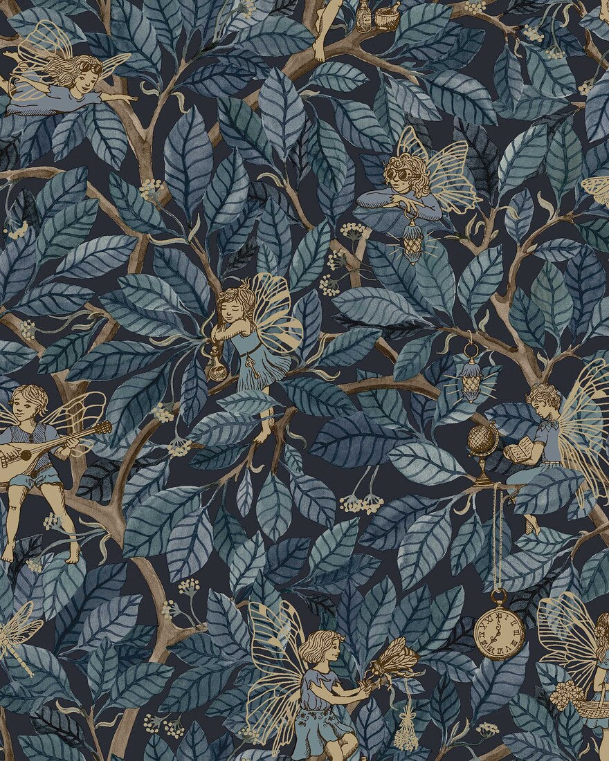 Fairies-lastentapetin tiheään lehtiköynnökseen piiloutuu taianomainen maailma, joka hohtaa hillitysti kullanhohtoisena, kun valo osuu siihen sopivasti. Satumaailma, jossa asuu keijuja, yöperhosia ja sudenkorentoja – löydätkö kaikki söpöt pienet asiat, jotka ne ovat keränneet metsäänsä? Tässä on Fairies-tapetin käsinmaalattu kuvio sinisessä värimaailmassa, jossa on kultaisia keijuja ja sinisen sävyisiä lehtiä keskiyönsinisellä taustalla.