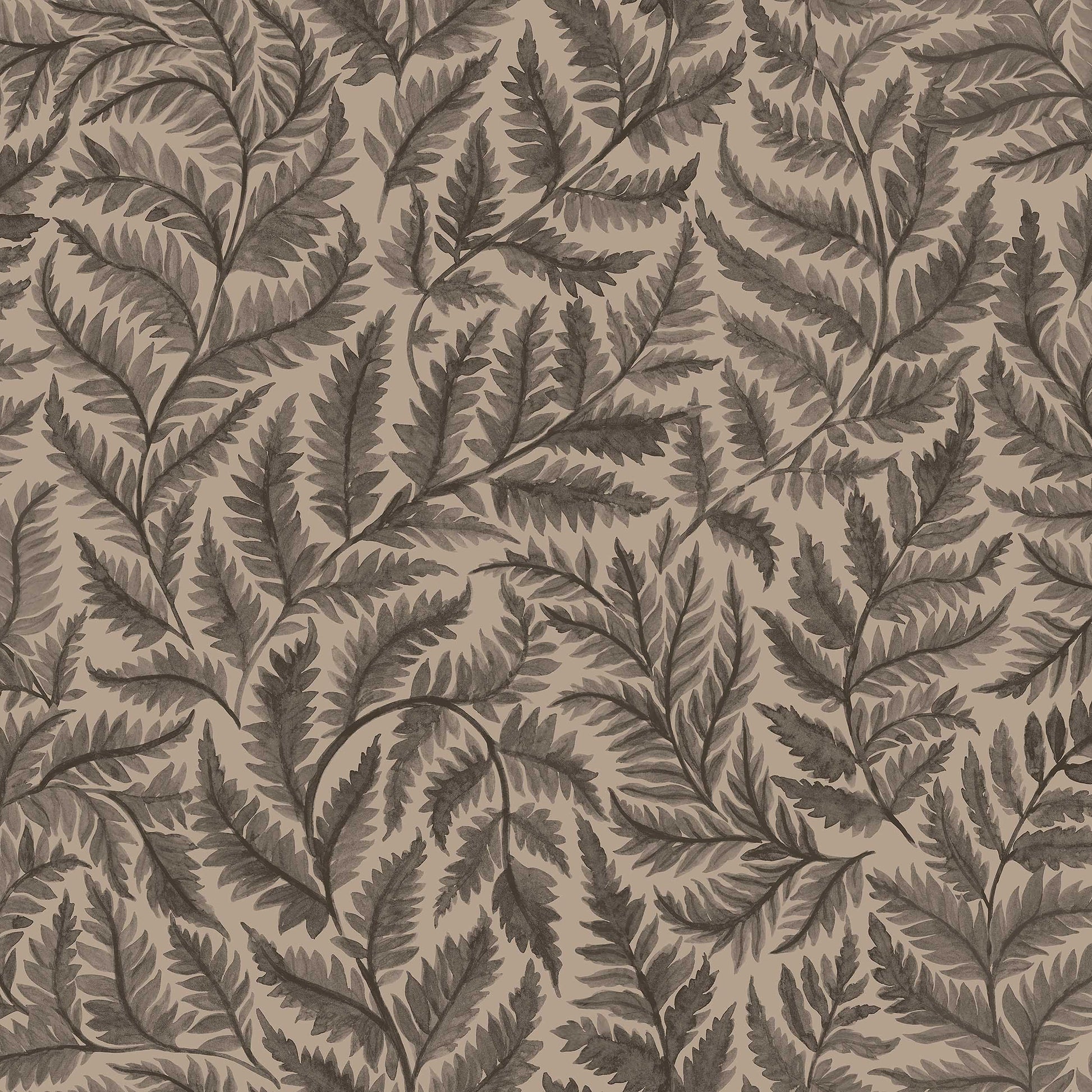 Ferns on vahva, moderni tapetti, jossa on suuria, mutkittelevia saniaisen lehtiä. Lehdet on maalattu käsin musteella, mikä antaa kuviolle upeaa syvyyttä. Tasapainoisen sommittelun ansiosta tämä voimakas kuvio tuntuu kuitenkin levolliselta ja harmoniselta seinällä.Tässä Ferns-tapetin mallissa on utuisia, hieman tummempia sävyjä: noenmustia saniaisia viileän ruskealla pohjalla.