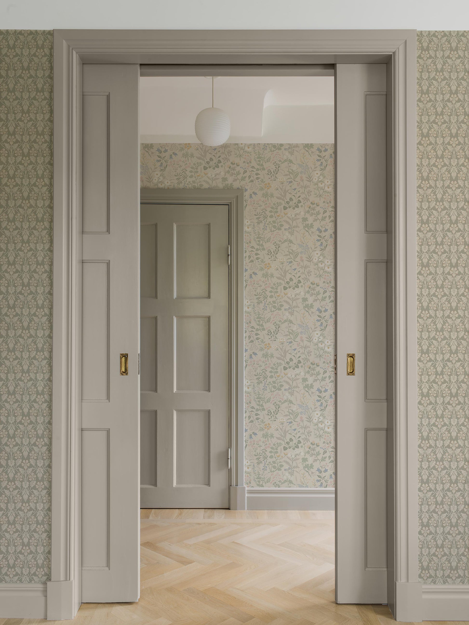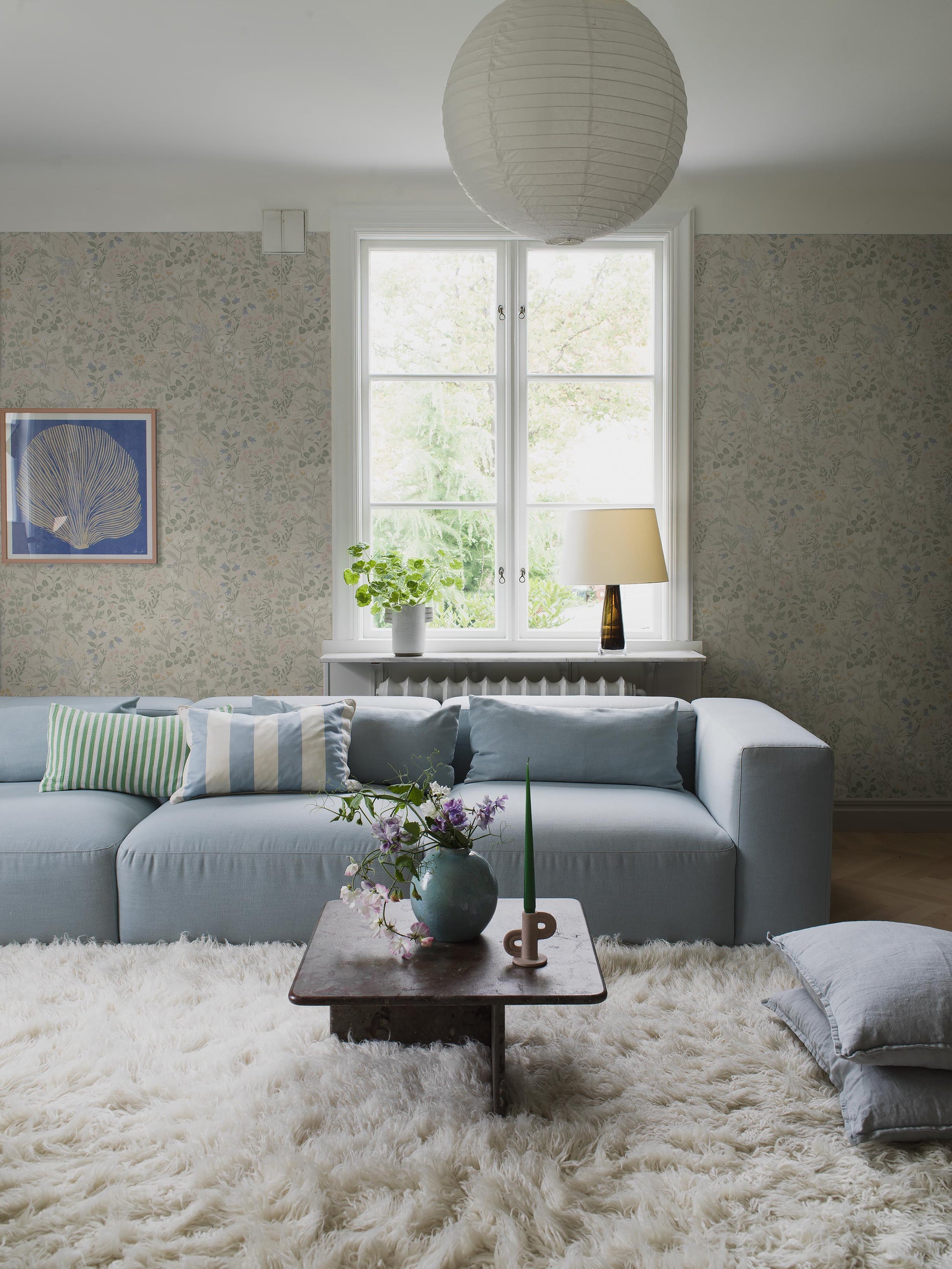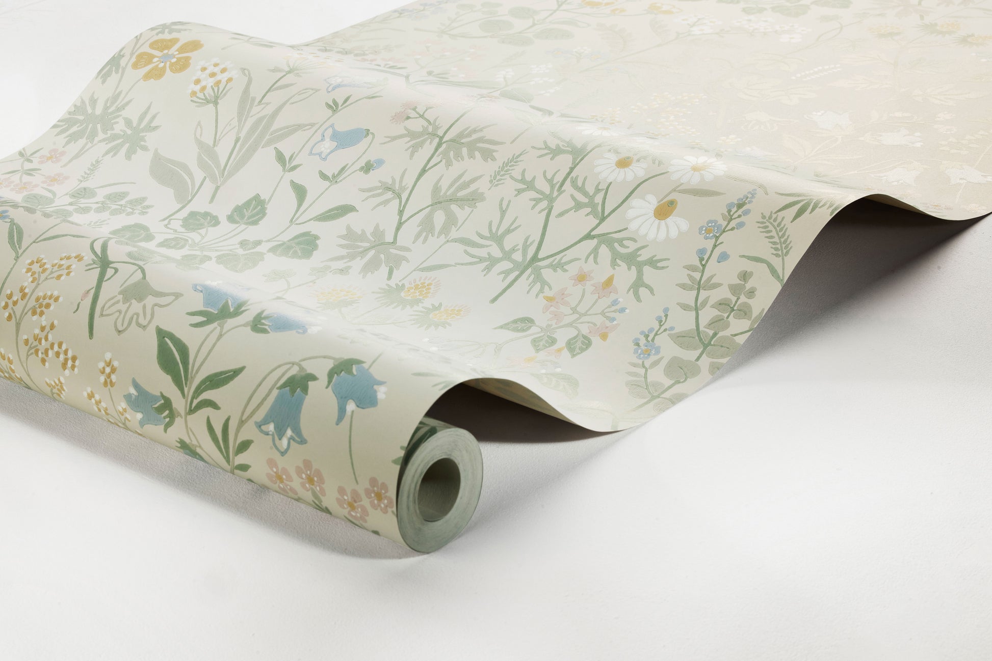 1950-luvun Flora-tapetissa suloiset, yksinkertaiset niittykukat on kuvattu sinisen, vihreän, harmaan, keltaisen, valkoisen ja pinkin sävyissä vaalean beigellä pohjalla. Kuvio sisältää monia värejä, minkä ansiosta se on helppo yhdistää muihin huoneen yksityiskohtiin. Kokonaisuudesta tulee rauhallinen, harmoninen ja kodikas. Tämäntyyppiset kuosit olivat yleisiä 1940- ja 1950-luvuilla vastapainona virtaviivaiselle funkis-arkkitehtuurille. Kansankoti-ihanteen kasvaessa myös funkis kehittyi pehmeämpään ja yhä vain suositumpaan suuntaan.