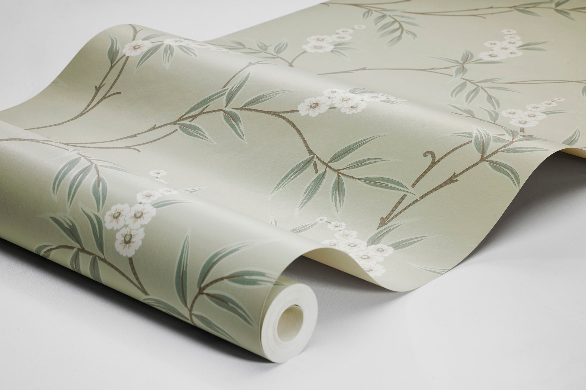 Floral Tree -tapettia peittää kukkiva oksisto, joka on ilmava ja mutkitteleva. Muotokieli muistuttaa hyvin paljon Chinoiserie-tyyliä, mutta on nykyaikaisempaa ja riisutumpaa tyyliltään. Tässä on Floral Tree -tapetista versio, jossa on valkoisia kukkia ja vihreitä lehtiä vaalean lehmuksenvihreällä taustalla. Mattaliimapainatus tekee pinnasta puuterisen ja eloisan, ja siinä on kaunista syvyyttä.