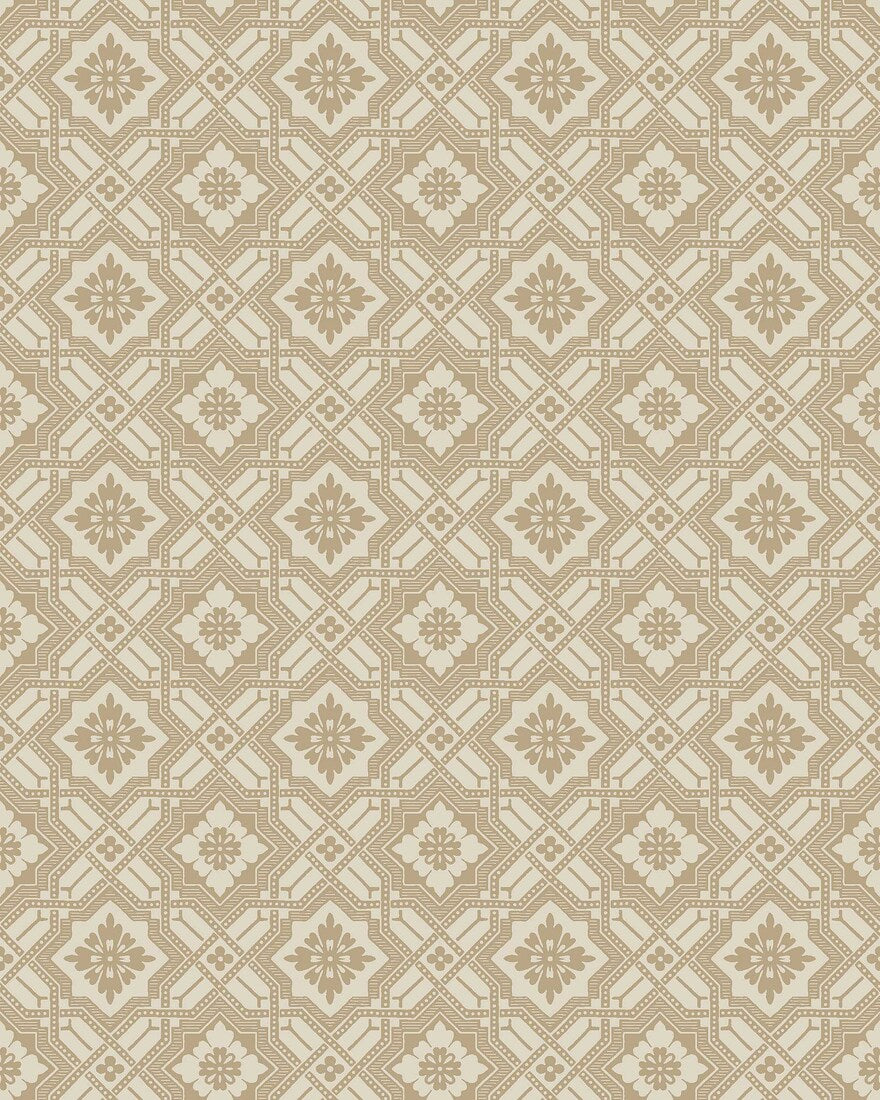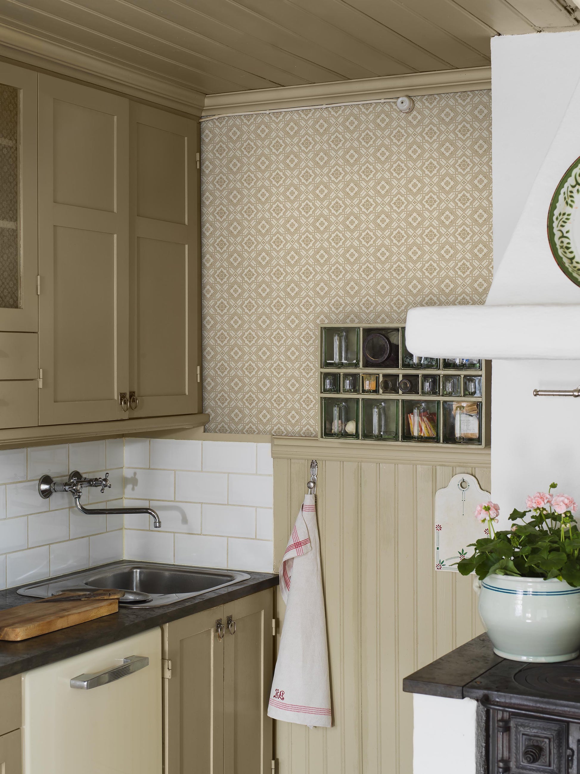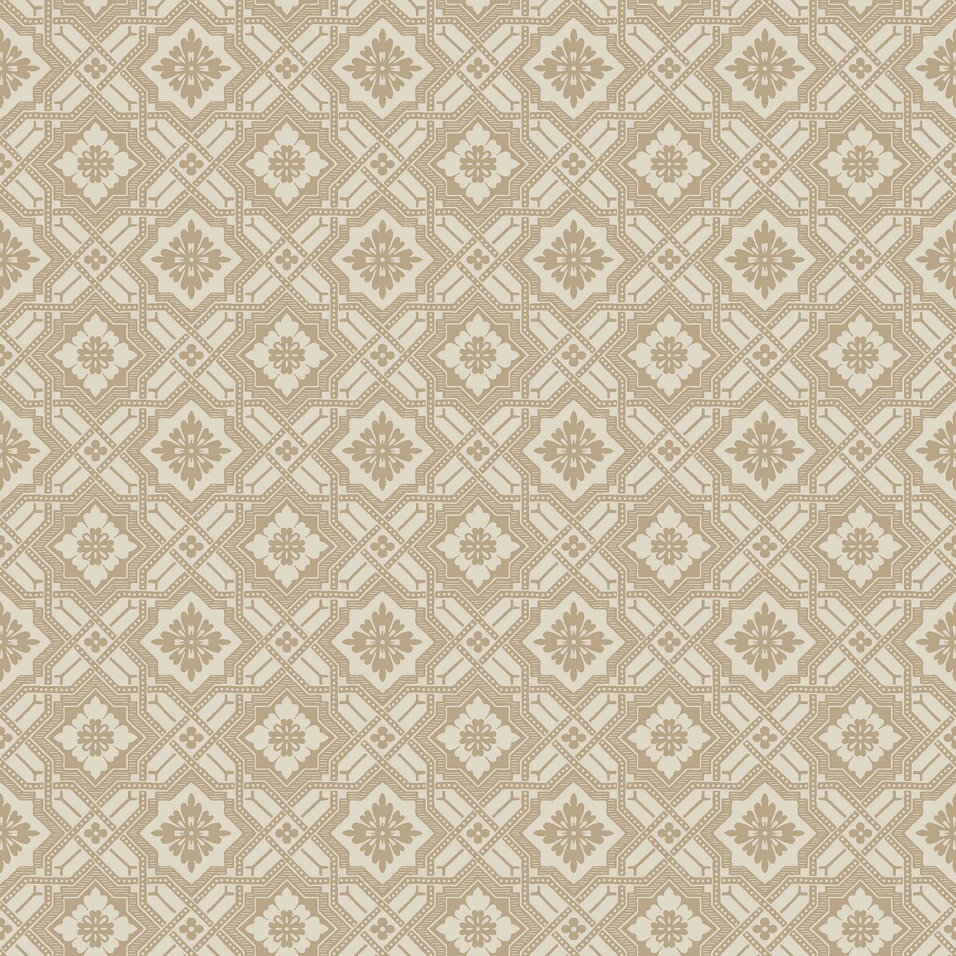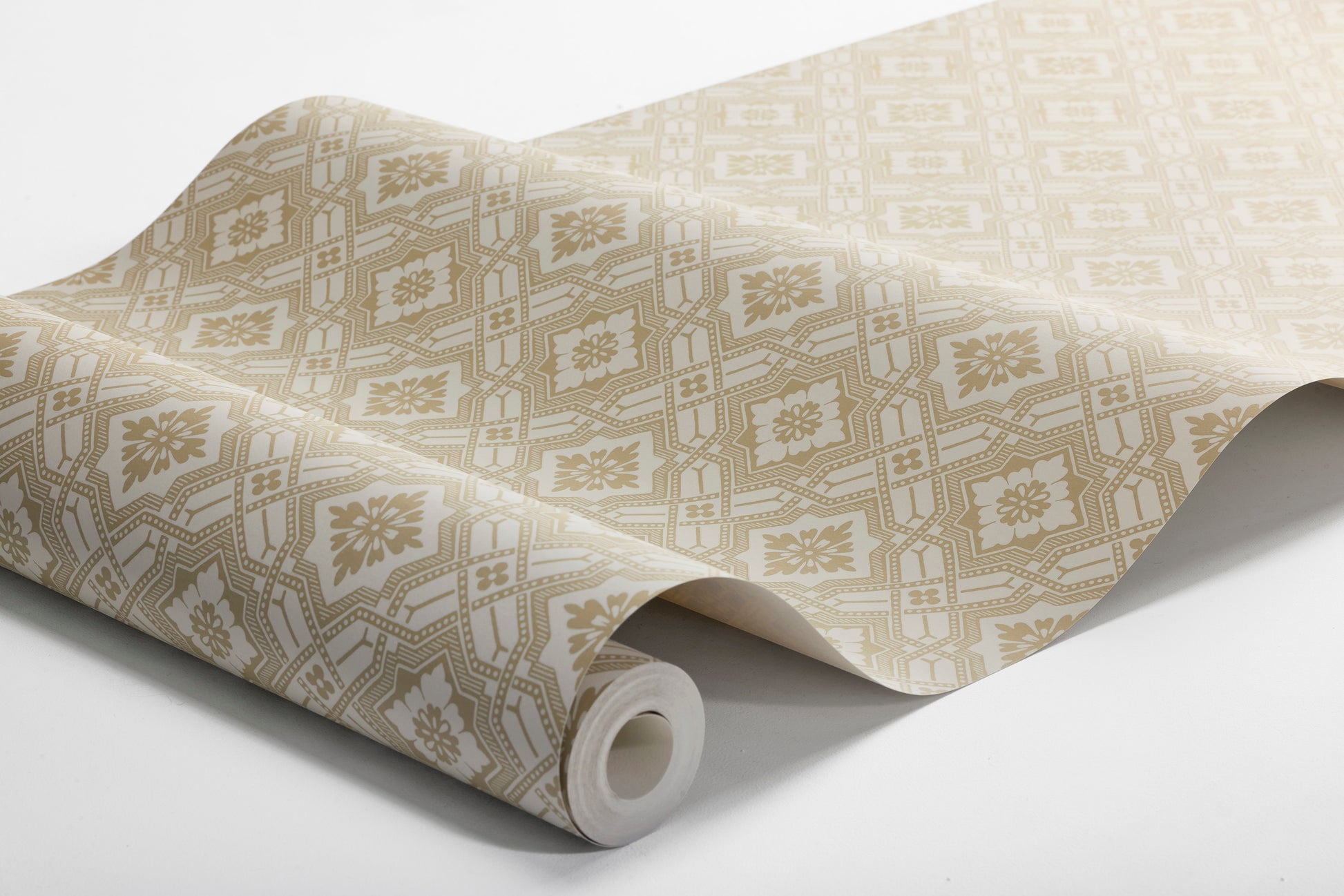 Kuviollinen Friedrich-tapetti näyttää kaukaa katsottuna lähes yksiväriseltä, mutta jos katsot tarkemmin, näet geometrisessa kuviossa yhä enemmän yksityiskohtia: raitoja, pilkkuja, tähtiä ja kukkia. Kuosi näyttää samanlaiselta eri suunnista katsottuna ja sopii siten erinomaisesti sekä seinälle että kattoon. Arkistomme alkuperäiskappaleen taakse on merkitty vuosiluvut 1910–1920, ja sen etupuolella on haalea leima, josta erotamme nimen Friedrich. Emme saa ehkä koskaan tietää, kuka hän oli, mutta arvelemme, että kuosi on ostettu saksalaiselta kuosiverstaalta viime vuosisadan alussa.Tässä näet Friedrich-tapetin sen alkuperäisissä väreissä: vaalean beigenä ja ruskeanbeigenä.