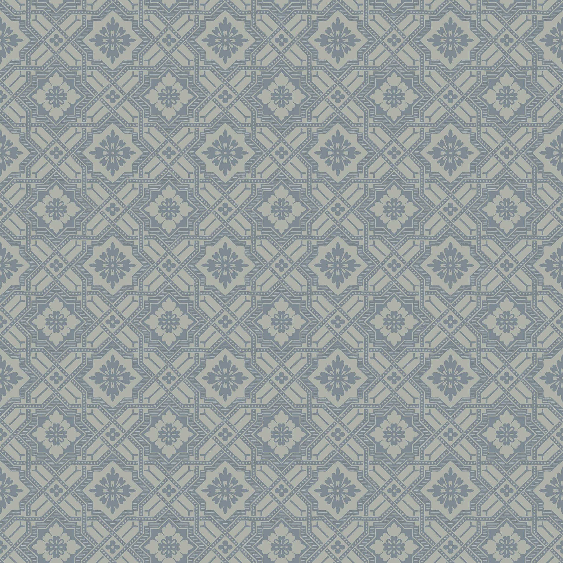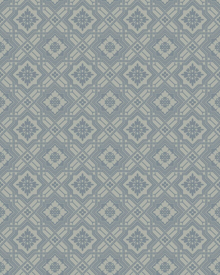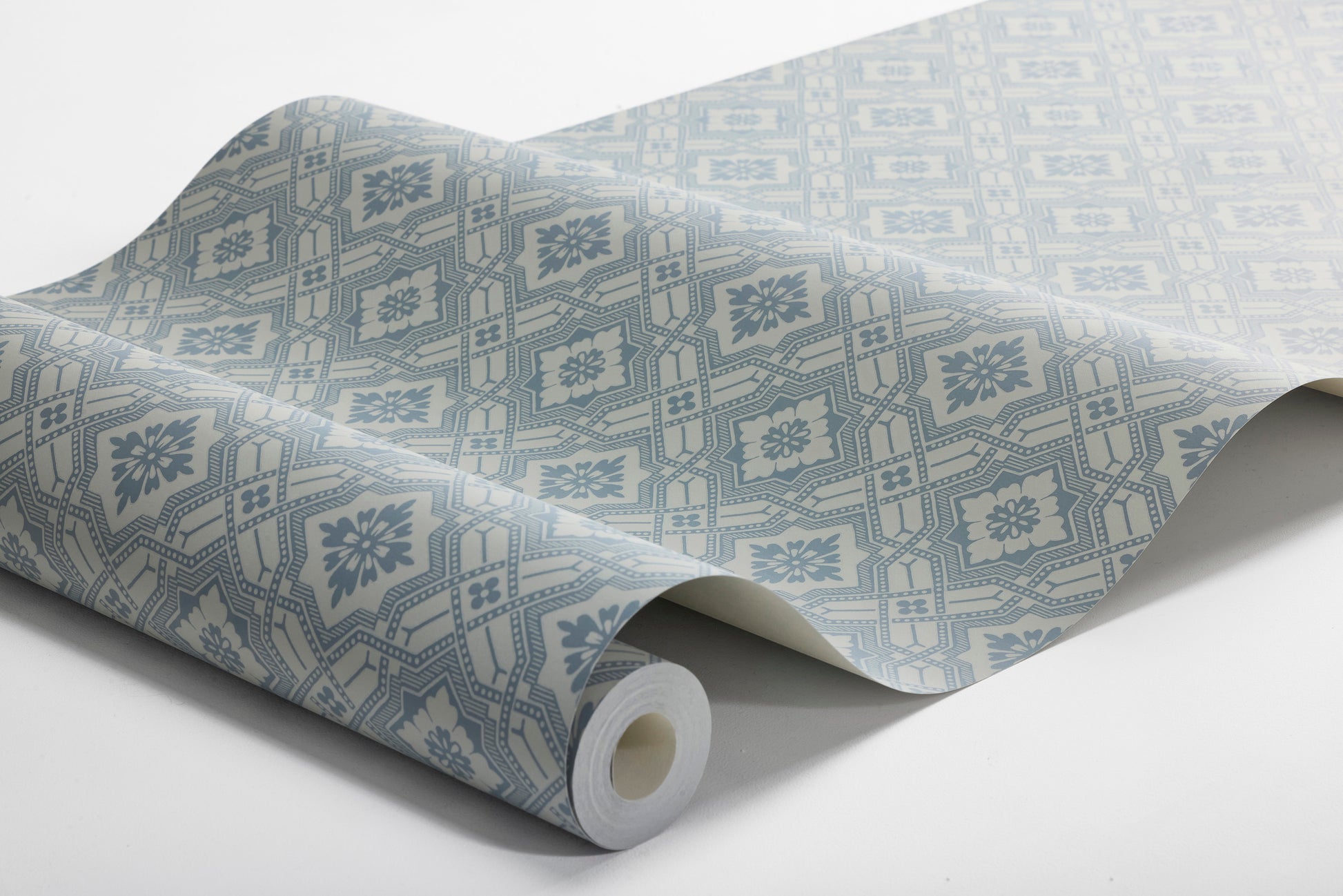 Friedrich on kodikas kuviollinen tapetti 1900-luvun alusta. Alkuperäisen mallin taustapuolelle on joku merkinnyt vuodet 1910–1920, ja etupuolella on haalea leima, jossa erotamme nimen Friedrich. Sen enempää emme tiedä tästä suloisesta geometrisesta kuviosta, mutta arvelemme, että se on ostettu saksalaiselta kuosiverstaalta viime vuosisadan alussa. Kaukaa katsottuna tiheä kuosi muodostaa harmonisen kokonaisuuden, mutta jos katsot lähempää, näet siinä paljon pieniä yksityiskohtia. Huomaa, että kuviolla ei ole suuntaa! Se näyttää joka suunnasta samanlaiselta ja sopii siksi hyvin sekä seinälle että kattoon.Tässä Friedrich-tapetissa on sinisiä sävyjä ja kuviossa hillittyjä harmaansinisiä ja vaaleanharmaita sävyjä – väriskaala oli erittäin suosittu 1900-luvun alussa.