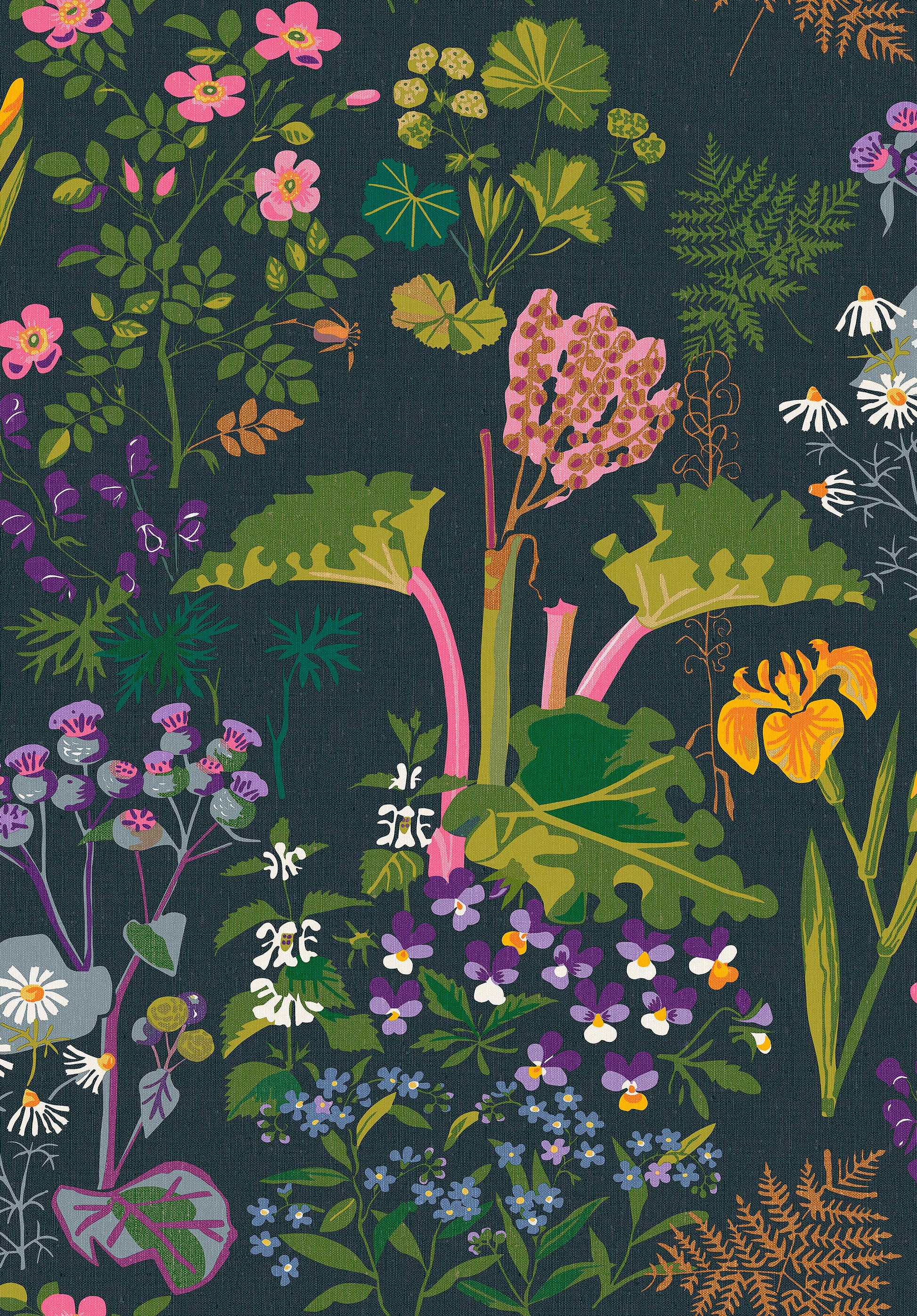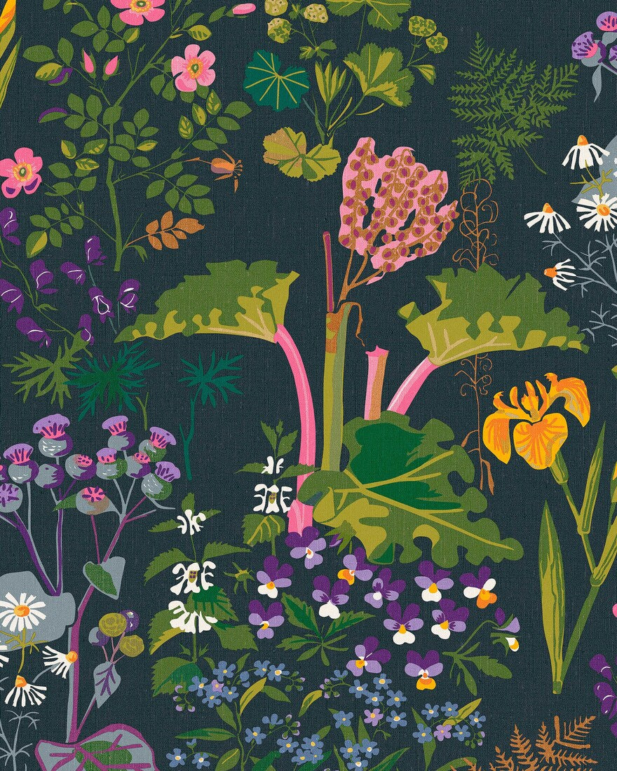 Design Gocken Jobs.Gocken Jobs on luonut joukon kasvikuoseja, jotka ovat yhä hyvin tunnettuja ja kysyttyjä. Tämä upea, rehevä kuosi, jossa on raparpereja, poimulehtiä, orvokkeja ja ukonhattuja on yksi hänen suosituimmistaan.