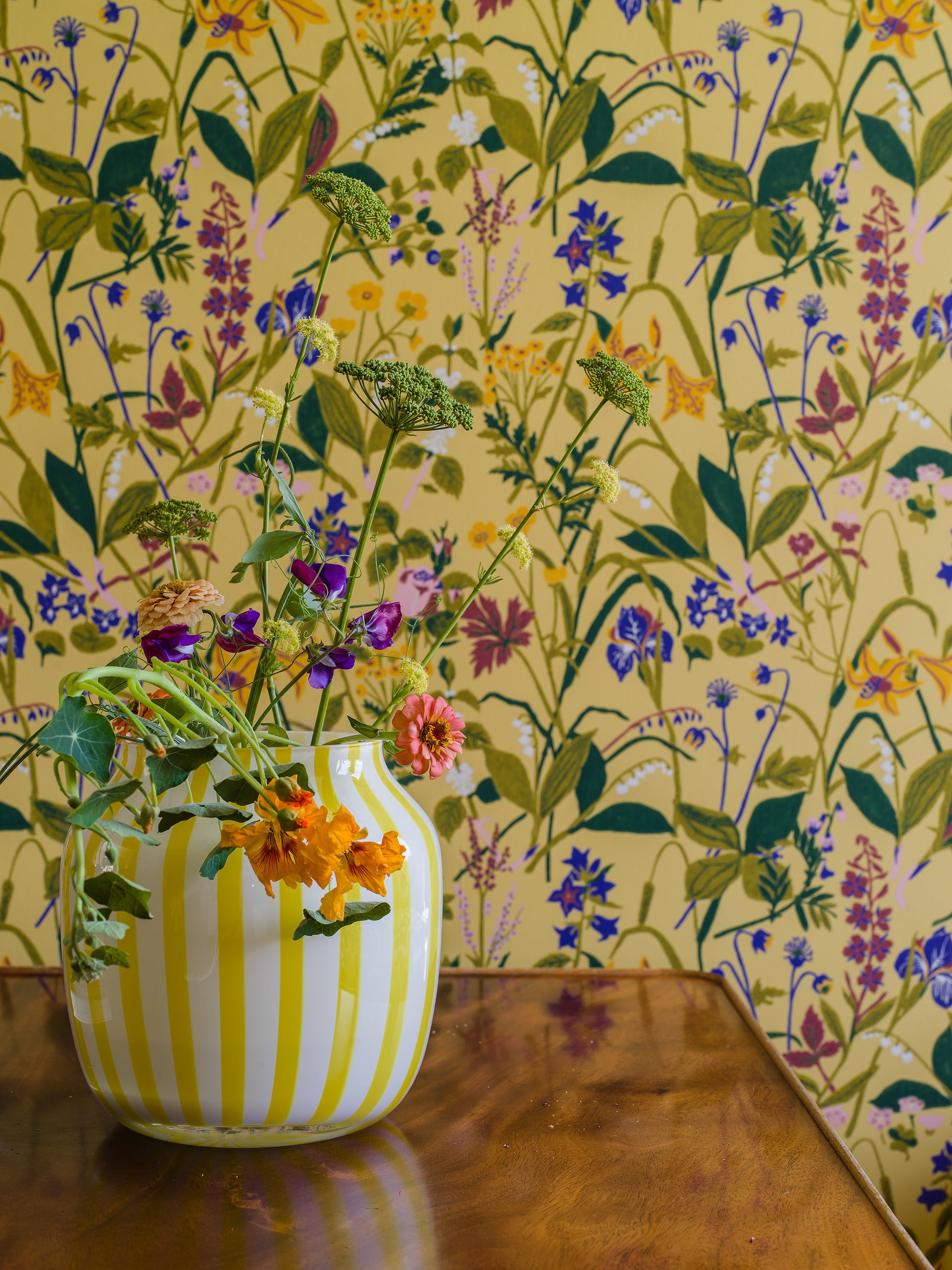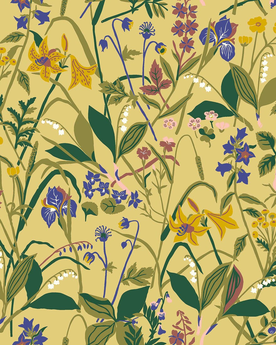 Jobsin sisarukset Lisbet ja Gocken suunnittelivat fantastisia käsinpainettuja kankaita, joita koristivat värikkäät ja rehevät kasvikuosit. Gocken Jobsin Ros och Lilja vuodelta 1946 on yksi todellisista ruotsalaisista klassikkokuoseista. Kangas oli ilontuoja sodanjälkeiseen aikaan. Nyt, lähes 80 vuotta myöhemmin, sama kuosi on saatavana tapettina!Ros och Lilja -tapetista on saatavana kolme eloisaa värivaihtoehtoa. Tässä näet kuosin hillityllä lämpimän keltaisella taustalla.