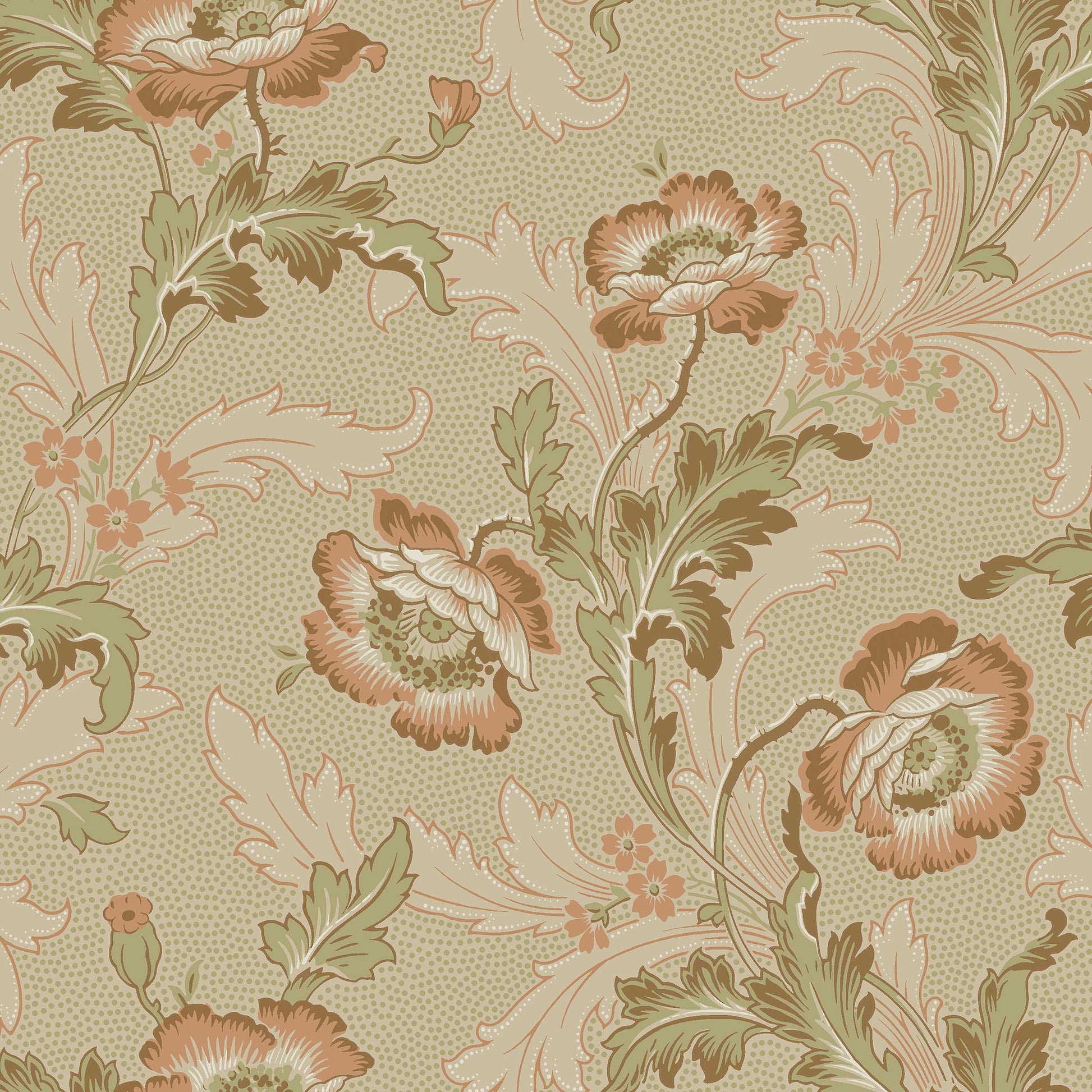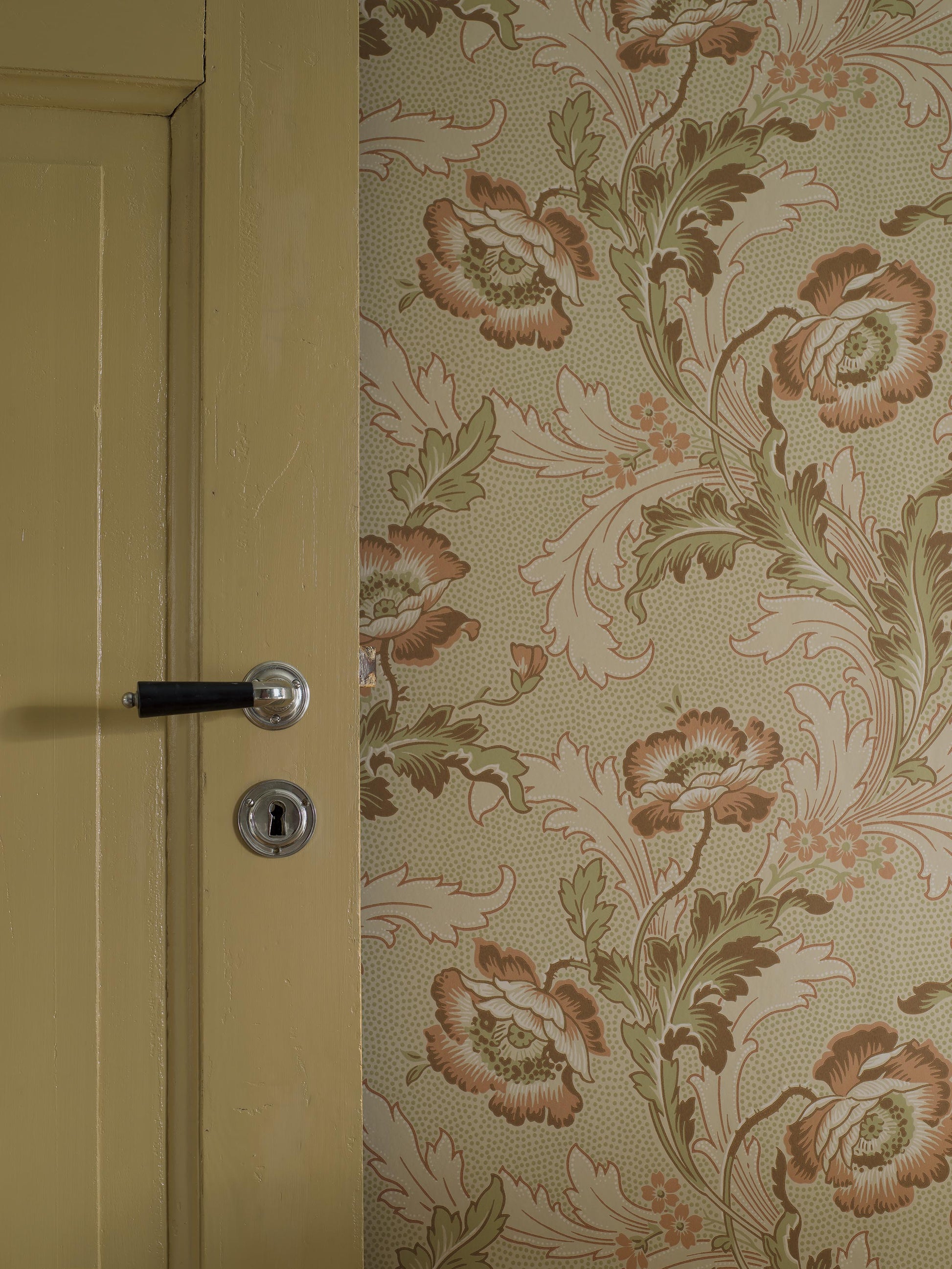 Suurikukkaista Göteborg-tapettia koristaa kaunis unikkokuvio, jonka on suunnitellut Göteborgs Tapetfabrik joskus 1890-luvulla. Juuri siihen aikaan suunnittelijat siirtyivät mielikuvituksellisista kukista aidon näköisiin kasviaiheisiin kuvioihin. Tämä trendi näkyy selvästi tässä köynnöstävässä unikkokuviossa, joka on erittäin yksityiskohtainen ja luonnollinen. Alareunan sievä pilkkukuvio sitoo kokonaisuuden yhteen.Tässä Göteborg-tapetissa on luonnollinen värimaailma, hillittyjä vaaleanvihreän ja terrakotan sävyjä beigellä pohjalla.