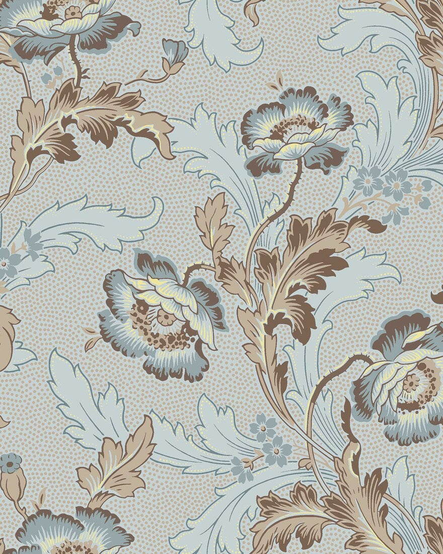 Suurikukkaisessa Göteborg-tapetissa kukoistavat näyttävät unikot pienipilkullisella pohjalla. Kuvio on hyvin todenmukainen, ja siinä näkyvät kaikki unikolle ominaiset piirteet tukevista terälehdistä ja kauniista siemenkodista liuskamaisiin lehtiin ja karvaisiin varsiin. Tapetti on Göteborgs Tapetfabrikenin valmistama ja ajoittuu 1890-luvulle, jolloin aidonnäköiset kasviaiheiset kuviot olivat suurta muotia. Tässä näet Göteborg-tapetin vaaleansinisissä sävyissä: viileitä sinisen, ruskean ja voinkeltaisen sävyjä haaleansinisellä pohjalla.