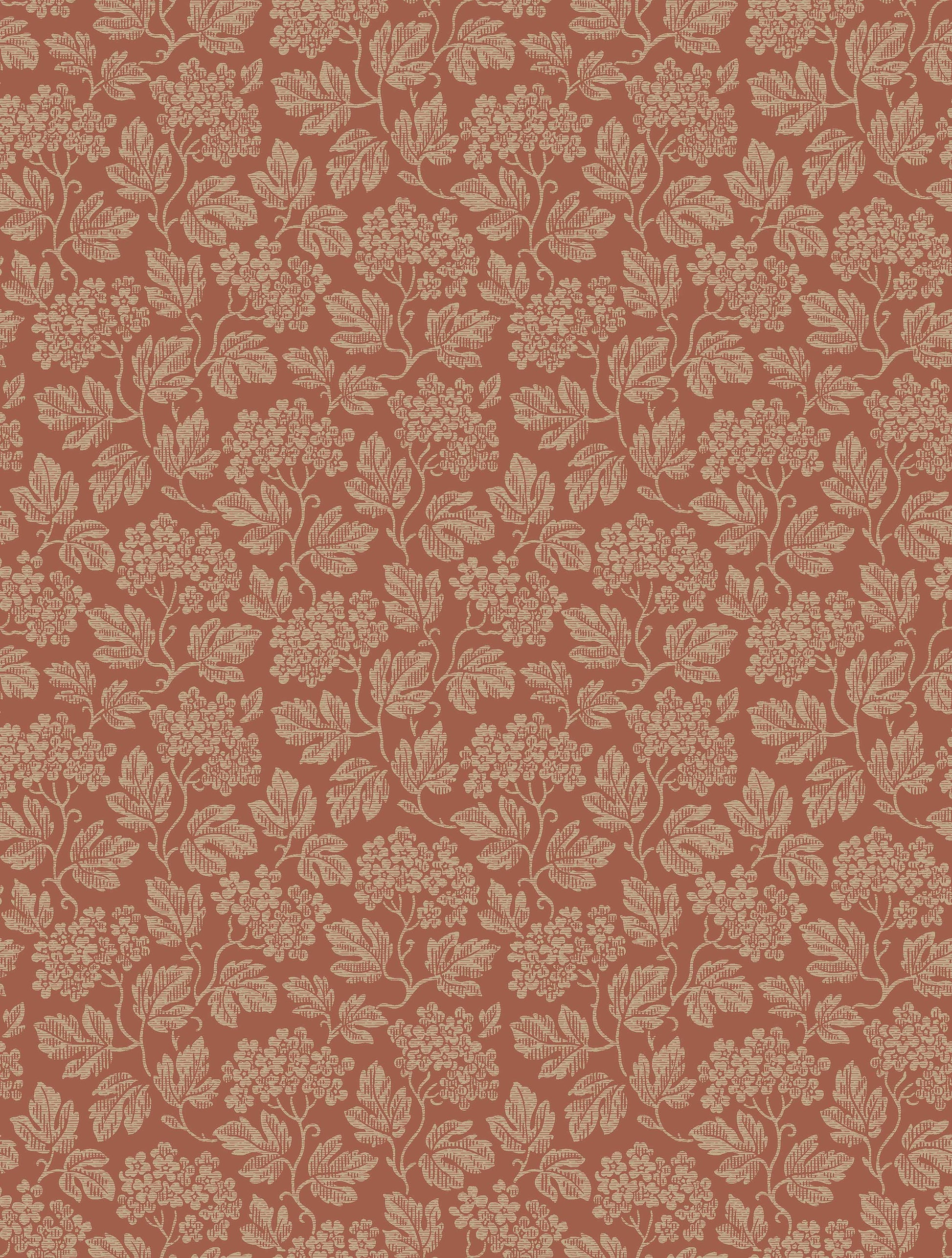 Hagtorn-gobeliinitapetti on luotu uudelleen historiallisesta arkistostamme löytyneen yli sata vuotta vanhan mallin mukaan - kukkivan orapihlajan tiheitä, koristeellisia lehtiä. Kuosissa on pieni raidoitus, yksityiskohta, joka antaa tapetille pehmeän, kodikkaan ja viimeistellyn ilmeen. Juuri nämä huomaamattomat raidat tai ruutukuviot ovat tyypillisiä varhaisen 1900-luvun gobeliinitapeteille.Tässä näet Hagtorn-tapetin, joka on liimapainettu lämpimän punaisin sävyin ja jossa on vaaleanbeige kuvio lämpimän punaisella, lähes ruosteen sävyisellä pohjalla.