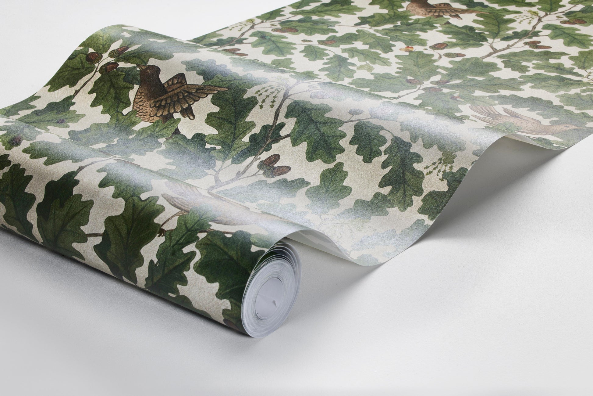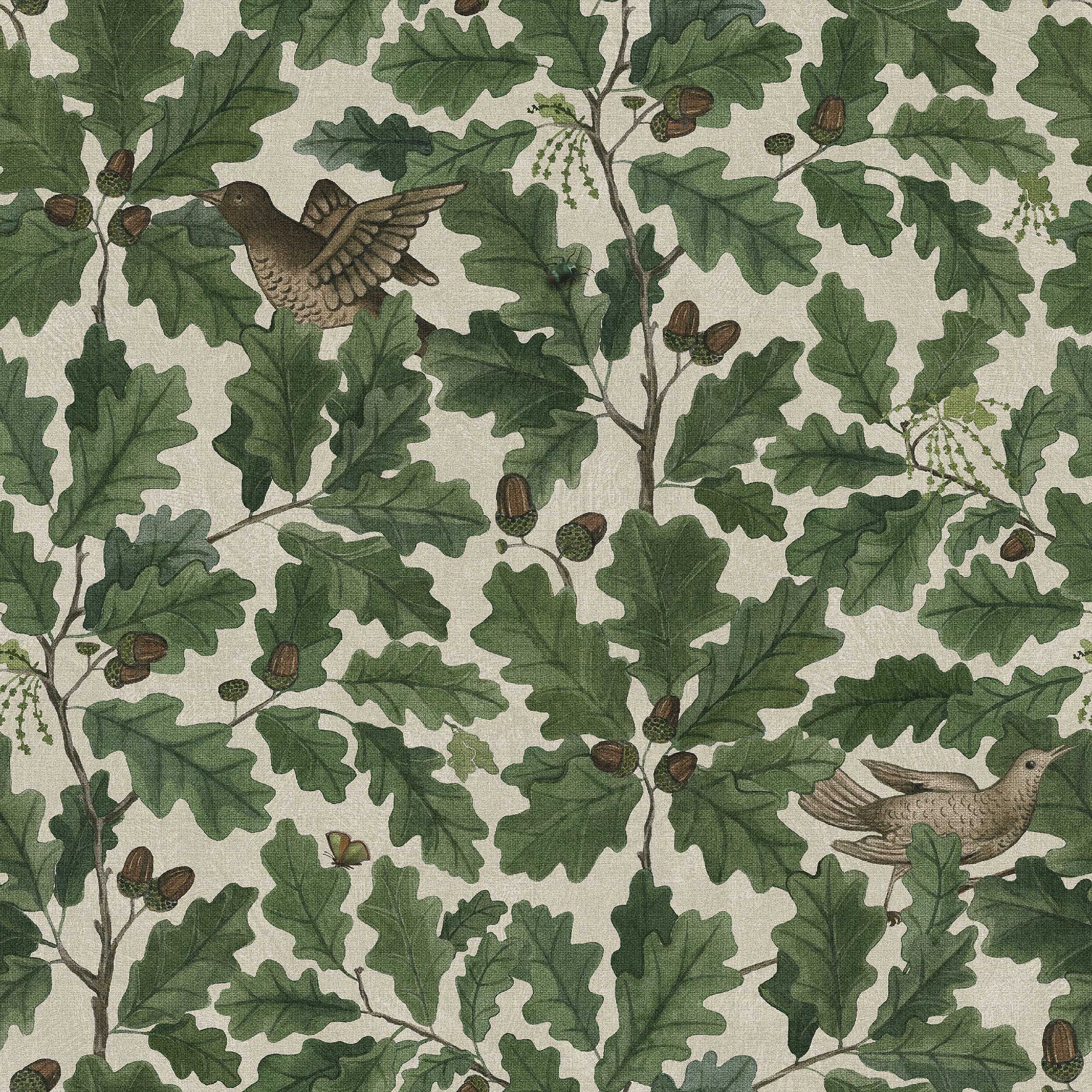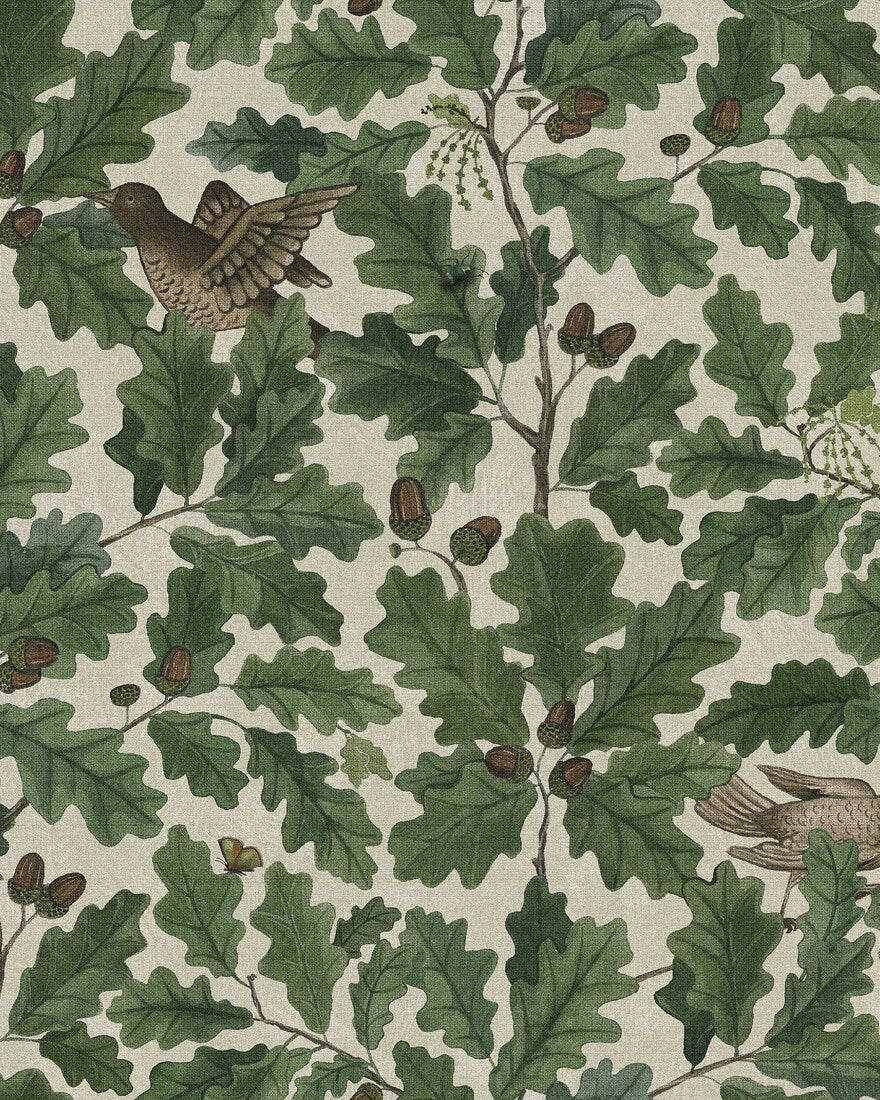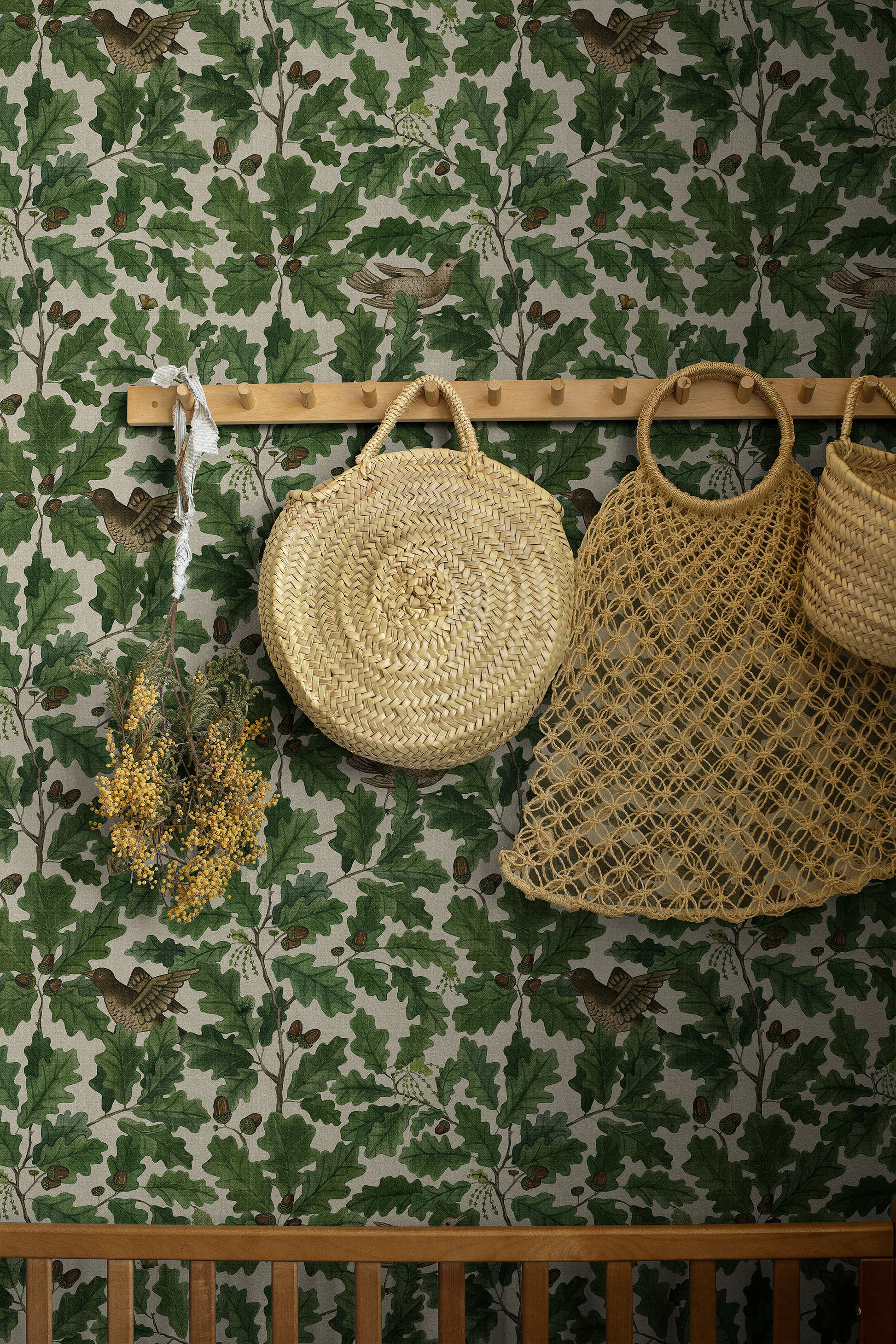 In the Oak -kuviotapetti täyttää huoneen metsän vehreydellä ja ihastuttavalla elinvoimalla. Mahtava tammi on myyttinen puu, jonka lehdet ovat uskomattoman kauniita. Lisäksi tammessa voi asua jopa 1 000 eläinlajia. Kun katsot tarkasti, tapetin vehreästä lehvästöstä löytyy parikymmentä eri hyönteistä. Kuosi on maalattu vesiväreillä ja painettu sitten kahdessa värisävyssä. Ohessa In the Oak -tapetti vaalean harmaanbeigellä pohjalla.