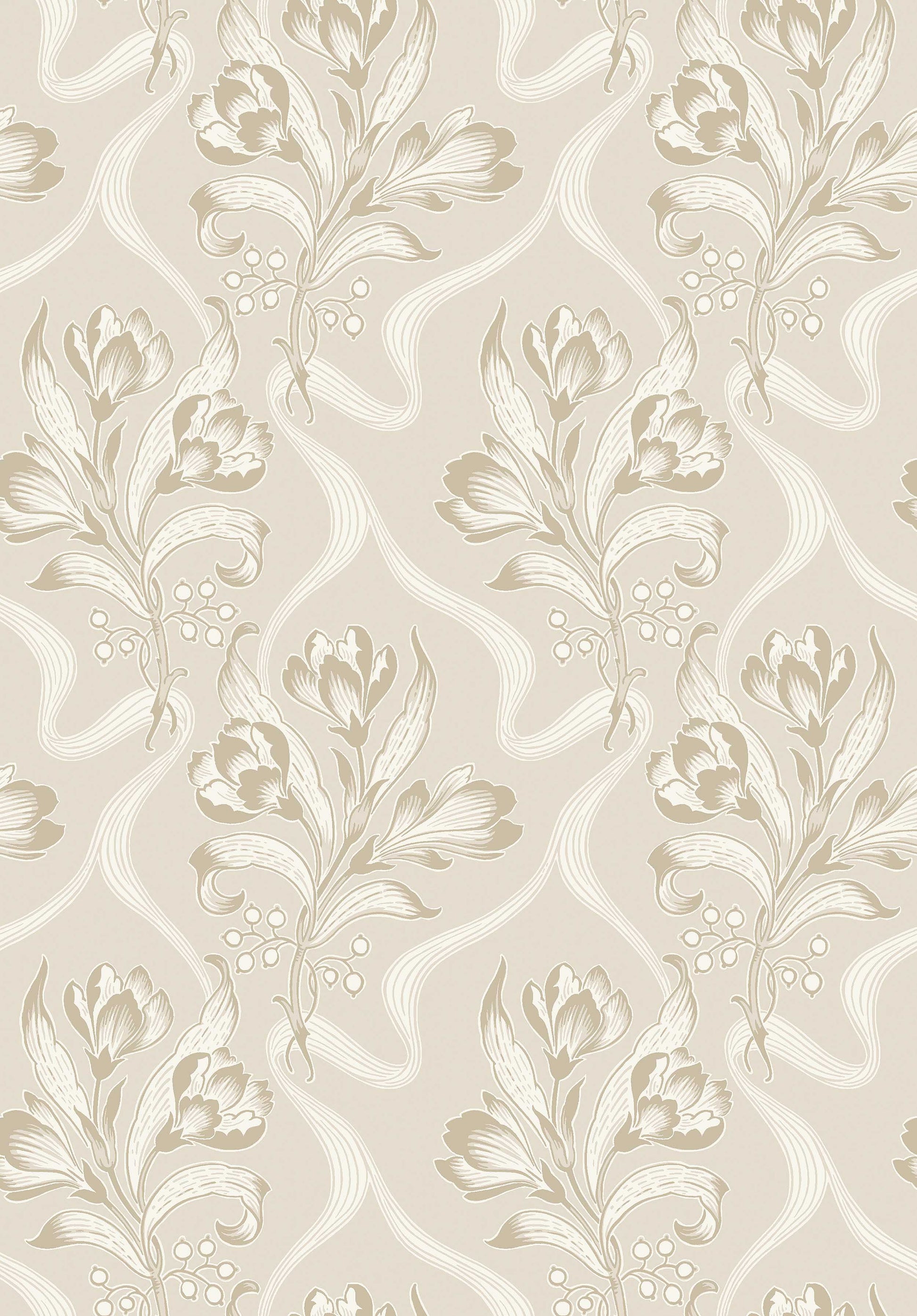 Vaalea, suurikukkainen Jugendbukett-tapetti sijoittuu 1900-luvun alkuun, luultavasti vuosille 1900–1910. Aaltoileva kuosi on jugendille tyypillinen todenmukaisten kasviaiheisten kuvioidensa, pehmeiden orgaanisten muotojensa ja ilmavan, hienostuneen ilmeensä ansiosta. (Joissakin Euroopan maissa tätä tyyliä kutsuttiin nimellä Art Nouveau.)Tässä Jugendbukett-tapetissa nähdään pehmeitä ja maanläheisiä värejä, lämpimiä harmaanruskeita sävyjä ja kermanvalkoista lämpimän harmaanbeigellä pohjalla. Valon osuessa sopivasti tapettiin sen kermanvalkoiset yksityiskohdat hohtavat hopeanvärisenä. Hohtavia kimallepainatuksia on nähty aina 1700-luvulta alkaen, mutta ne yleistyivät juuri jugendin aikana.