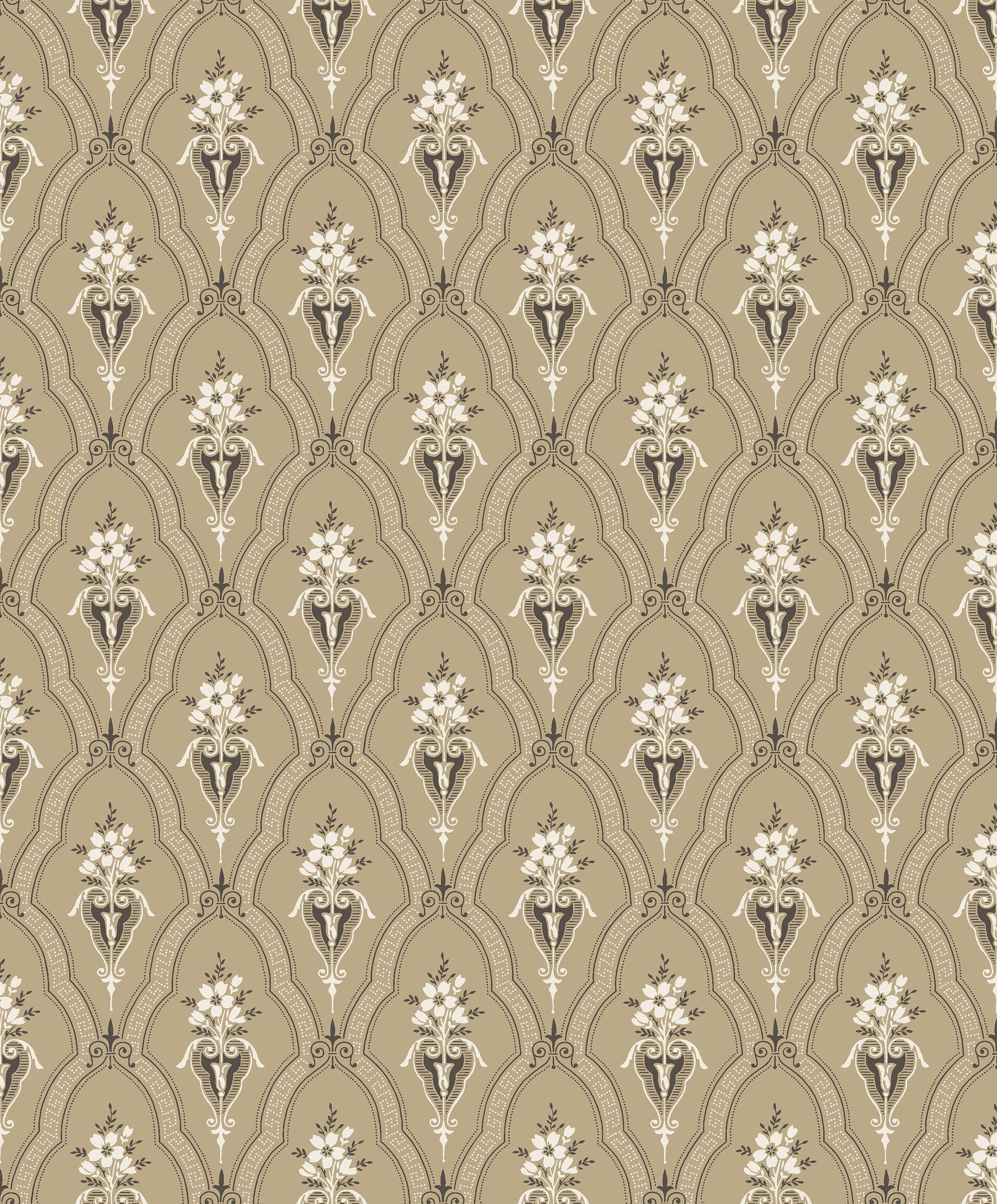 Klädesholmen on klassinen vuosisadan vaihteen tapetti, jonka siro kuvio muistuttaa sekä ristikkoa että medaljonkia. Rytmikäs kuviointi luo huoneeseen rauhallisen ja hieman rustiikkisen tunnelman. Klädesholmen on luotu historialliseen arkistoomme tallennetun tapetin pohjalta. Oletamme, että tapetti on peräisin 1800-luvun lopulta. Tuolloin kuvio painettiin usein suoraan ruskealle kartongille ja tämän mallin ruskean ja kermanvalkoisen sävyinen värimaailma on hyvin lähellä alkuperäistä. Tapetista on saatavana kaksi muutakin värivaihtoehtoa.
