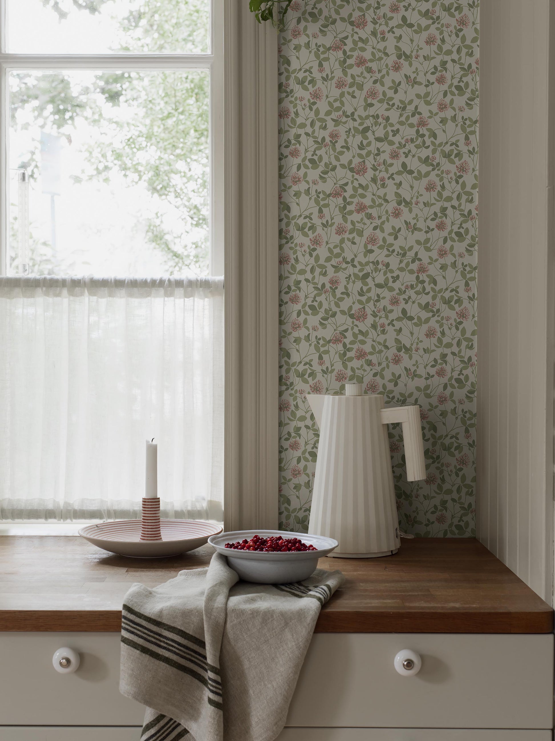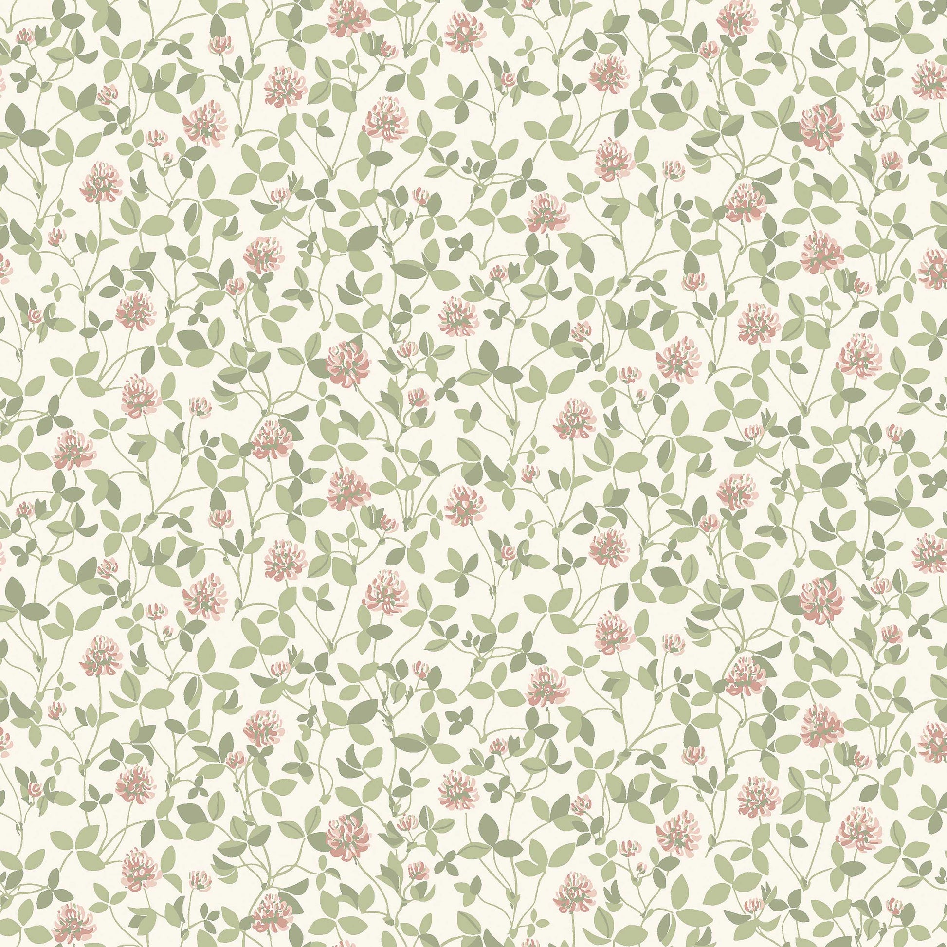Klöver-kukkatapettia peittää suloinen puna-apilaniitty. Kukkien joukosta löytyy ehkä muutama neliapilakin onnea tuomaan. Tiivis ja runsas kuosi luo huoneeseen rauhallisen ja kotoisan tunnelman. Olemme painaneet tästä viehättävästä 1970-luvun tapetista uuden version.Tässä liimapainetussa Klöver-tapetissa on vaaleanpunaisia kukkia ja lämpimän vihreitä lehtiä kermanvalkoisella taustalla.
