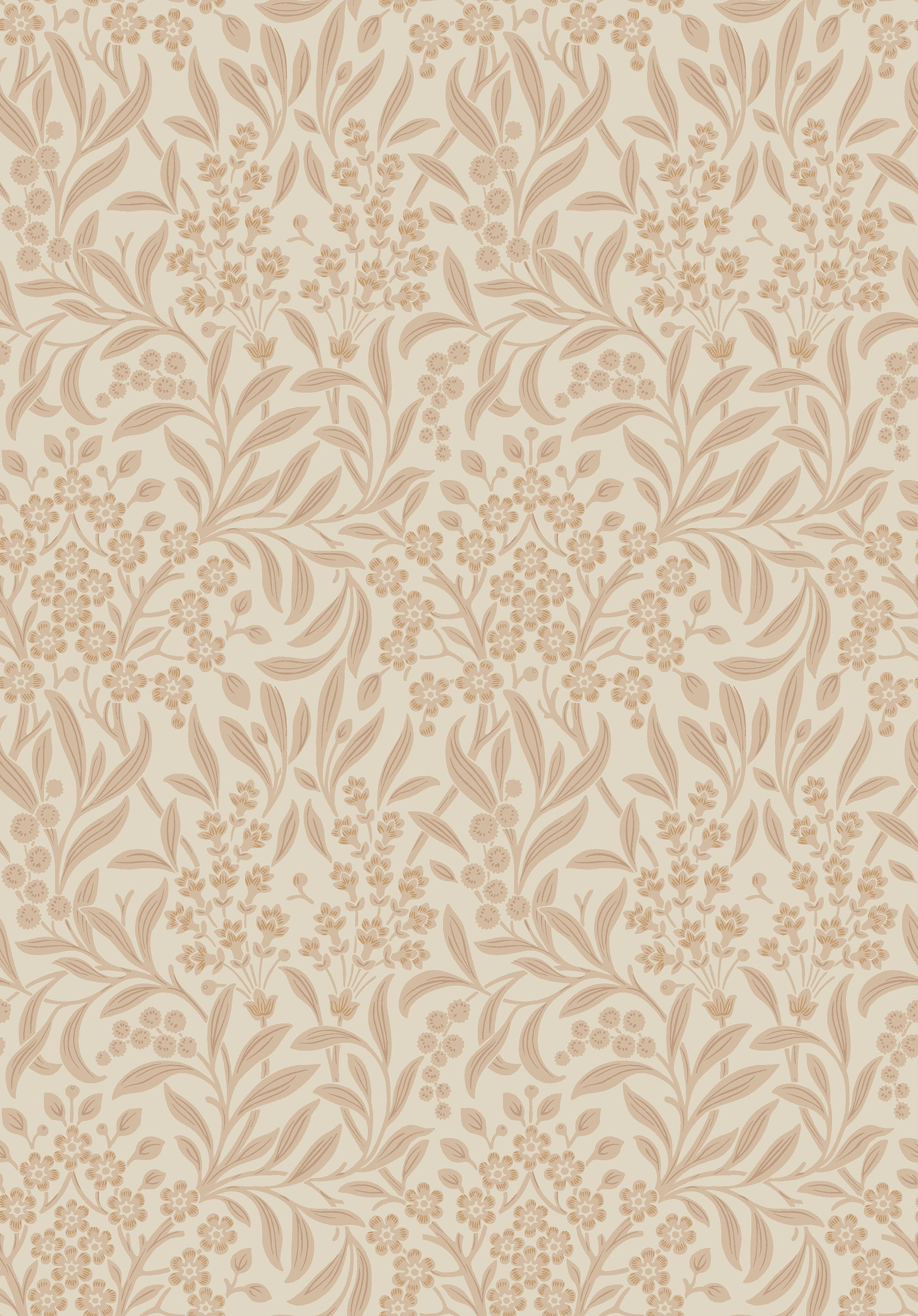 1970-luvun Kryddhyllan-tapettia koristaa kiemurteleva kukka- ja lehtiornamentti. Huomaatko vaikutteet jugendista ja Arts & Crafts -suuntauksesta? Nämä tyylit kokivat renessanssin 1960- ja 70-luvuilla. Kuvio on peräisin historiallisesta arkistostamme ja nyt painamme kukkatapettia uudelleen viidessä eri värissä.Tässä näet Kryddhyllan-tapetin pehmeässä väripaletissa, joka sisältää puuterista vaaleanpunaista, vanhaa roosaa, beigeä ja kellanruskeaa. Vaalea, lempeä värimaailma luo huoneeseen valoisan ja kodikkaan tunnelman.