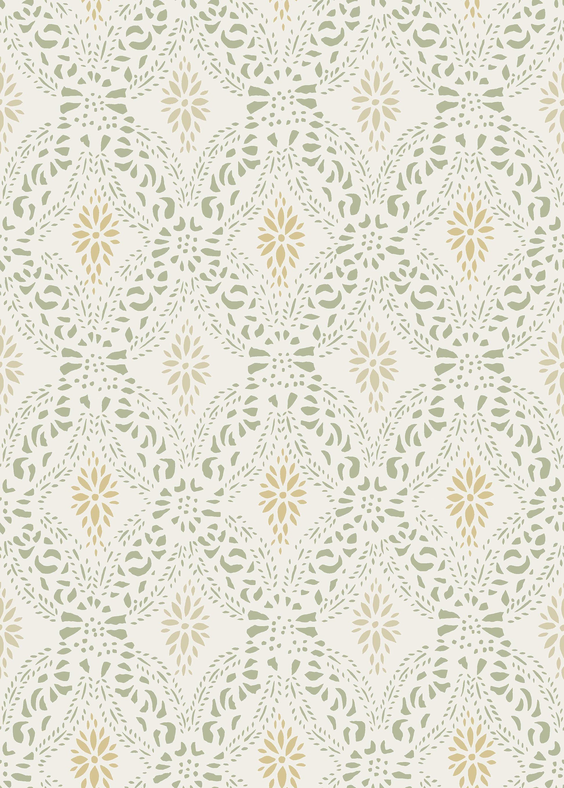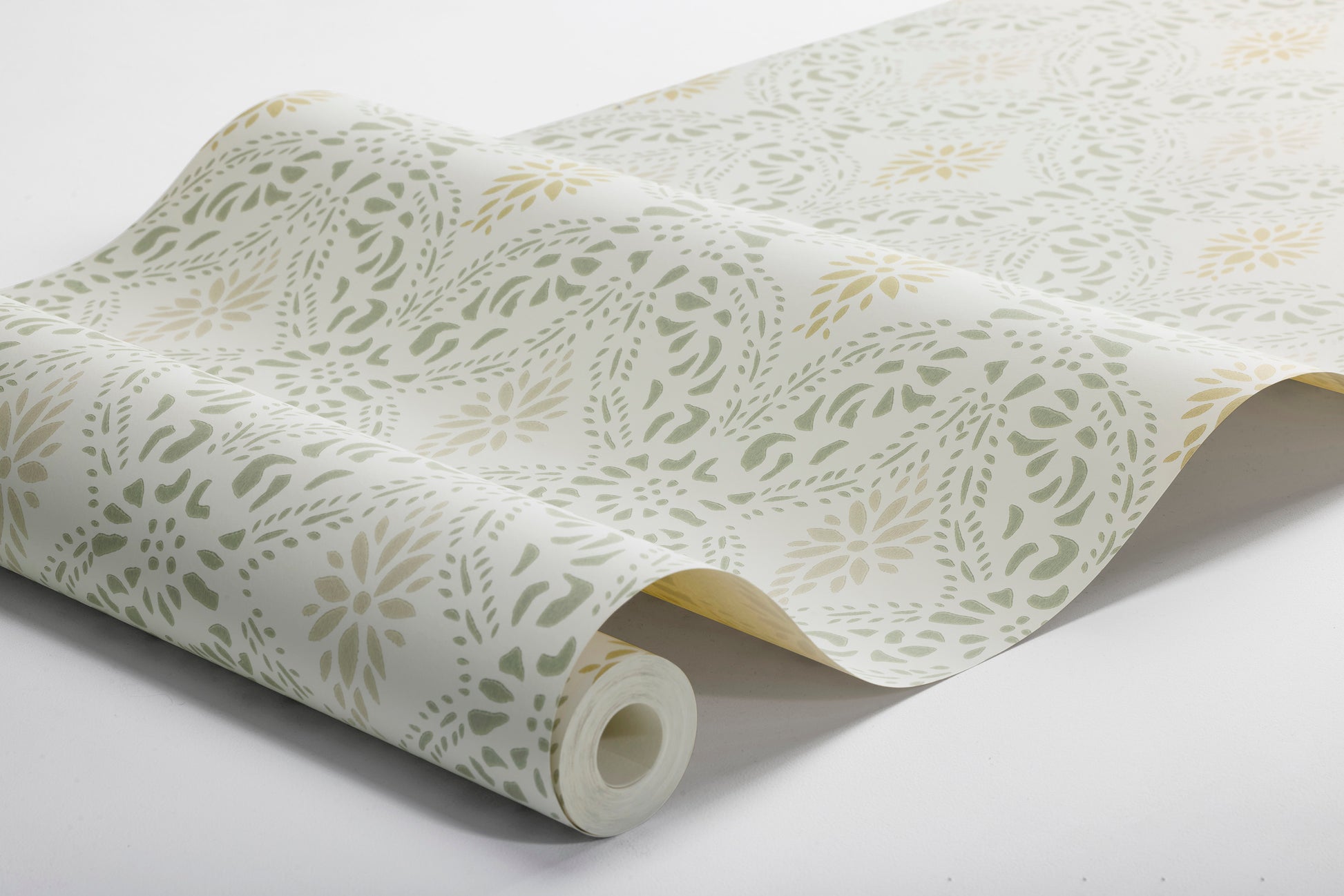 Vaaleaa, kuviollista Kvarnholmen-tapettia koristaa abstrakti koristekuvio, joka on 1800-luvun sapluunamaalauksen innoittama. Löysimme maalauksen Kalmarin lääninmuseon kokoelmista, ja tapetti on saanut nimensä Kalmarin keskustassa sijaitsevan Kvarnholmenin kaupunginosan mukaan. Kenties tämä kaunis kuvio on joskus koristanut jonkin saarella sijaitsevan sievän puutalon seinää?Täällä näet Kvarnholmen-tapetin vaaleissa, lämpimissä ja kodikkaissa värisävyissä. Kuosissa on pehmeitä vihreän, okran ja hiekkabeigen sävyjä lämpimän valkoisella pohjalla.