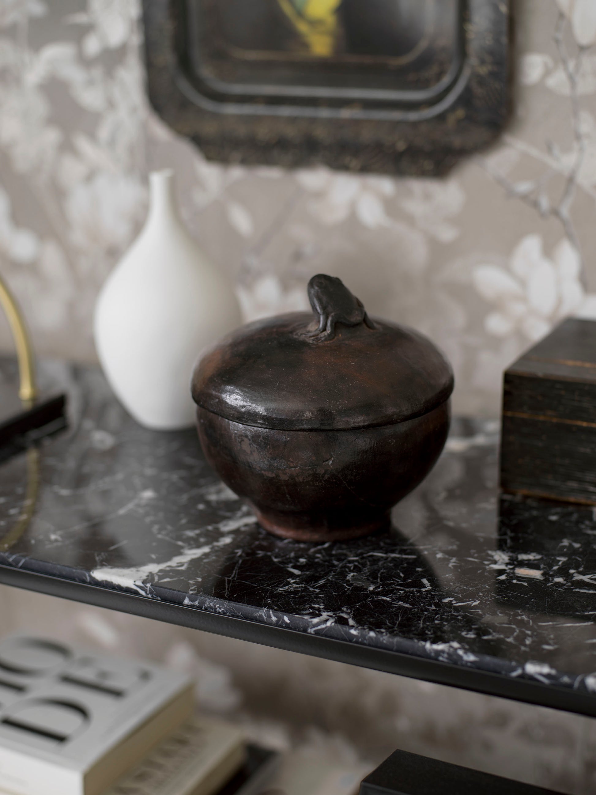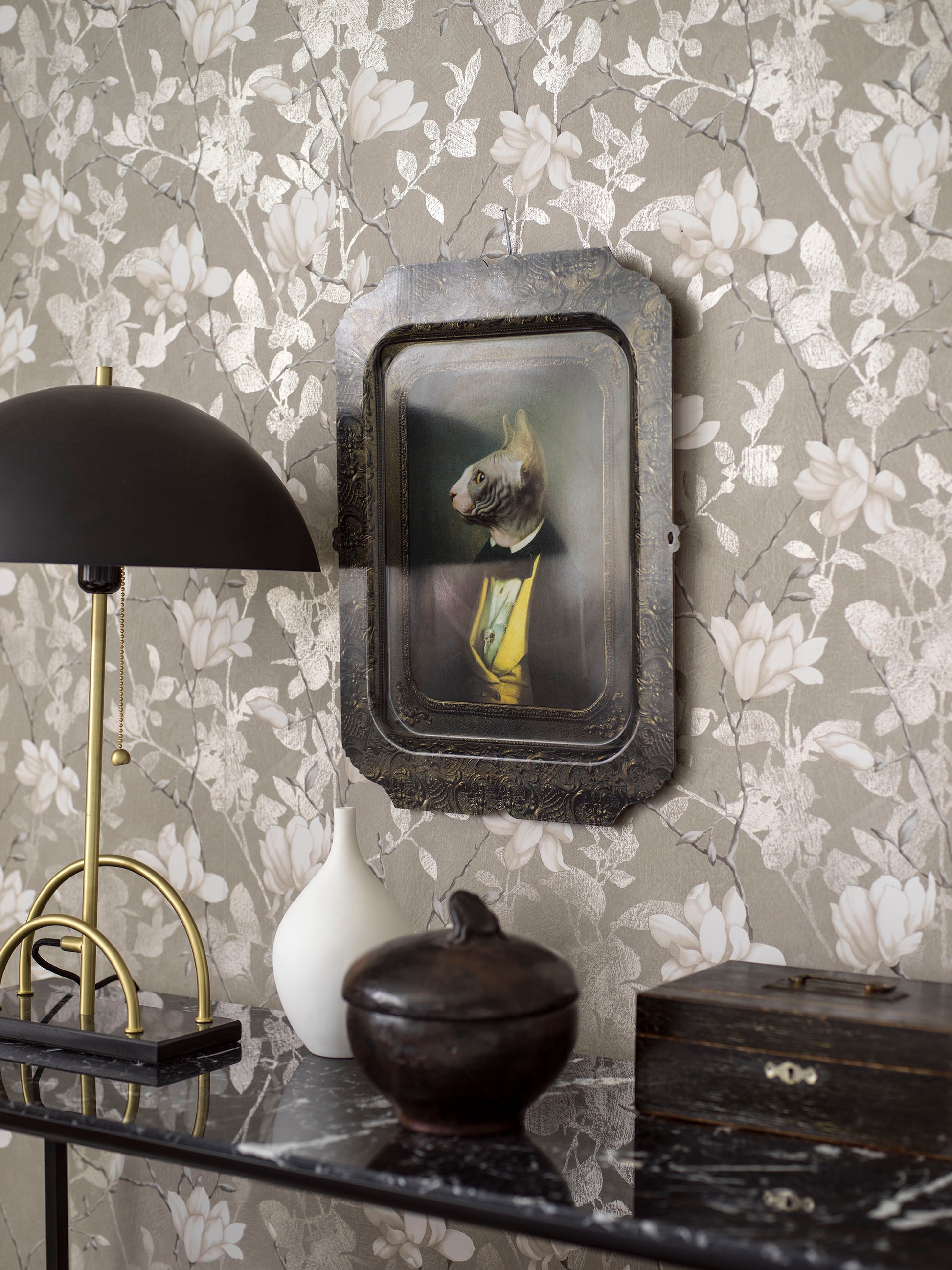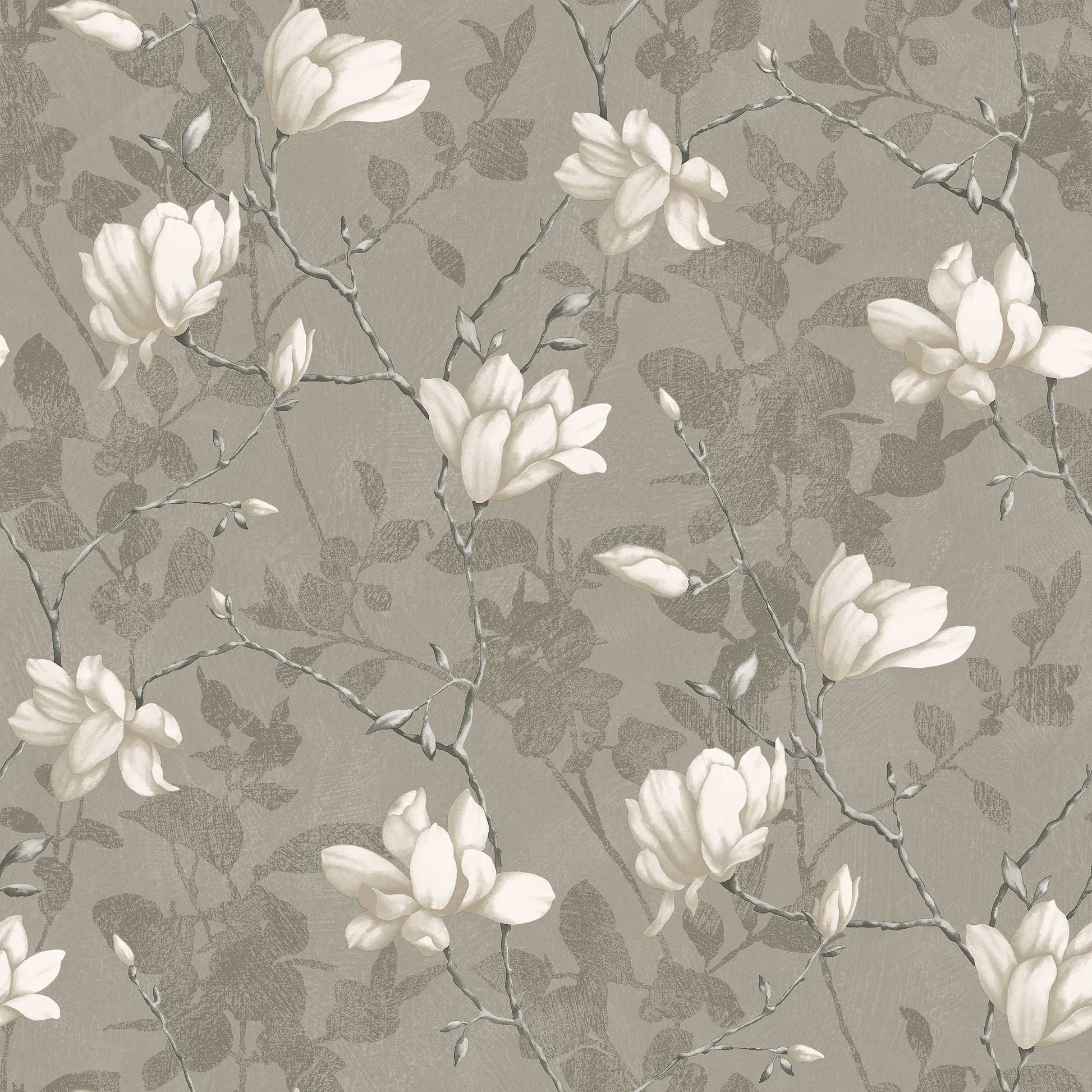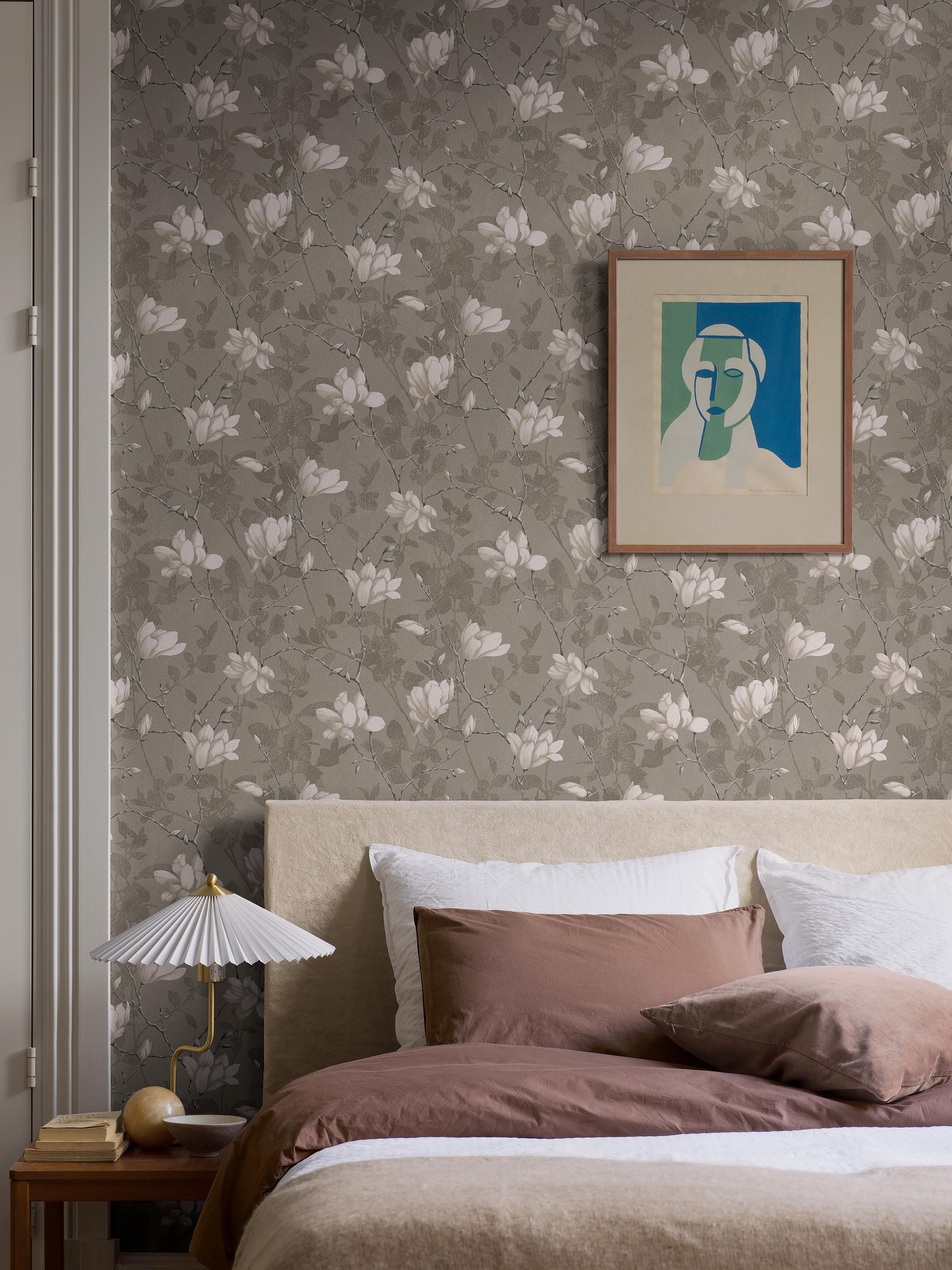 Lily Tree on harmaa kukkatapetti, jossa on veistoksellisia oksia ja suuria, kauniita, valkoisia magnolian kukkia. Magnolian oksien takana näkyy hillitty ja hieman hopeanhohtoinen varjokuvio, joka luo ylellistä tuntua, syvyyttä ja dynamiikkaa.Tässä Lily Tree -tapetin kaunis kuvio harmaameleeratulla pohjalla.