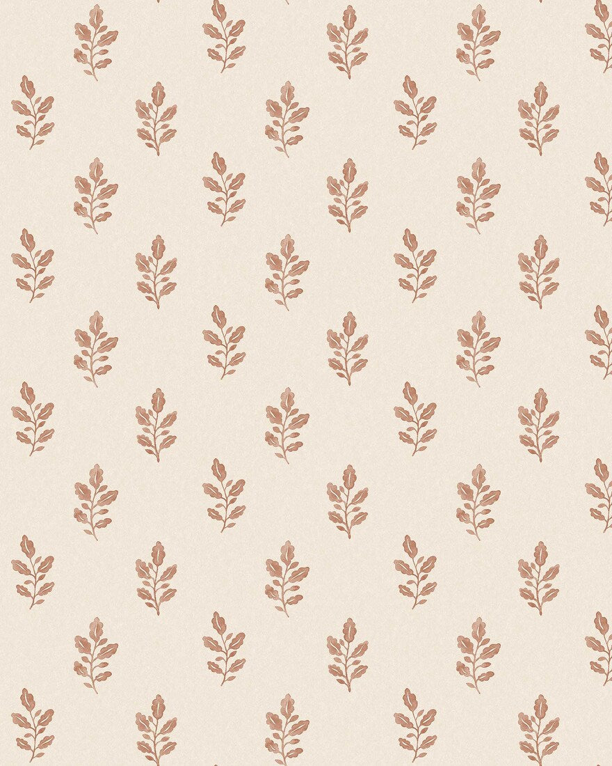 Pienikuvioista Little Oak -tapettia koristavat tyylitellyt pienet tammenlehtioksat rytmikkäässä kuviossa, joka on saanut inspiraationsa klassisista puupiirroksista. Tässä kuvio on kuitenkin maalattu vesiväreillä ja painettu sitten riisipaperimaiselle pohjalle. Maalaishenkinen ja kodikas tapetti, jossa on ihanaa käsityön tunnelmaa.Tässä on Little Oak -tapetista versio, jossa on hillityn ruosteenpunaiset tammenlehdet lämpimänbeigellä pohjalla.