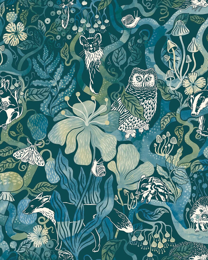 Muuta lastenhuone jännittäväksi satumetsäksi Magic Woods -tapetilla. Siilit, ketut, oravat ja muut eläimet kurkistelevat kauniiden kukkien ja rehevien lehtien takaa. Metsän kasvit on maalattu vesiväreillä ja eläimet on piirretty graafiseen tyyliin.Tässä lastentapetti Magic Woods on sinivihreissä sävyissä tummansinisellä pohjalla – värimaailma tuntuu rauhalliselta, turvalliselta ja kodikkaalta.