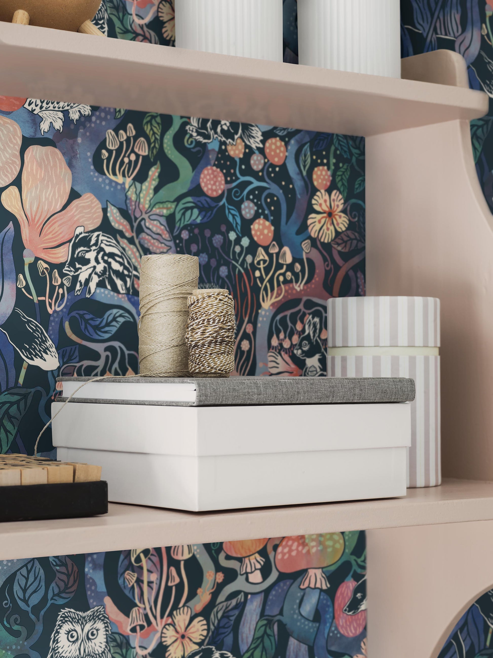 Tervetuloa lumoavaan metsään, joka on täynnä leikkisiä ystäviä! Magic Woods -lastentapetissa on paljon kauniita yksityiskohtia löydettäväksi. Helmipöllö, kettu, siili ja muut eläimet on piirretty graafisesti, kun taas metsän sienet ja kasvit koostuvat vesiväripinnoista.Tässä Magic Woods -tapetti on lämpimässä, värikkäässä paletissa: violettia, vaaleanpunaista, sinistä ja vihreää tumman sinimustalla pohjalla.