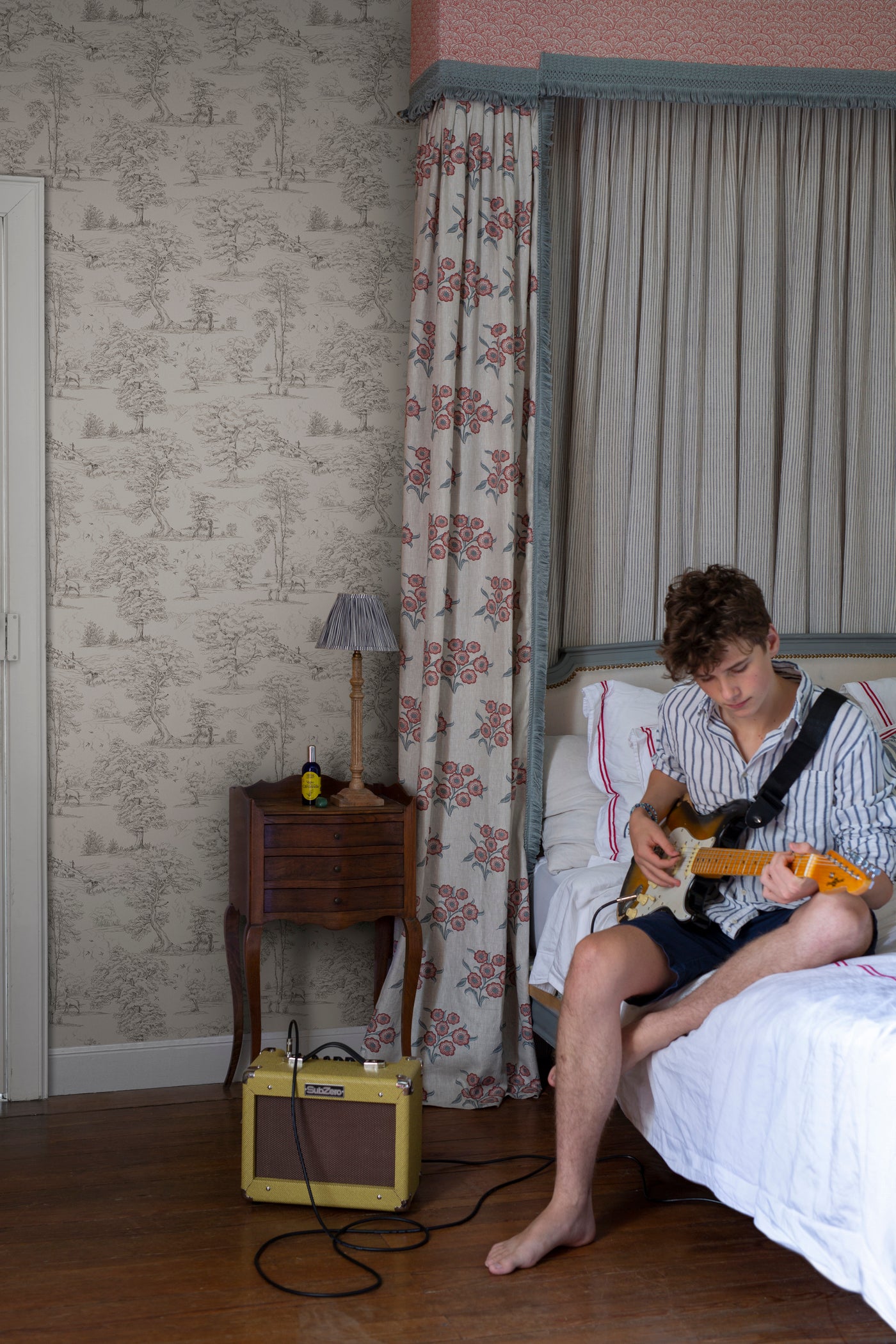 Tapetti on kunnianosoitus Montfortin kylälle, jossa lampaat laiduntavat ja antiloopit vaeltavat. Ihastuttava maalaismaisema toile de jouy-tyyliin.