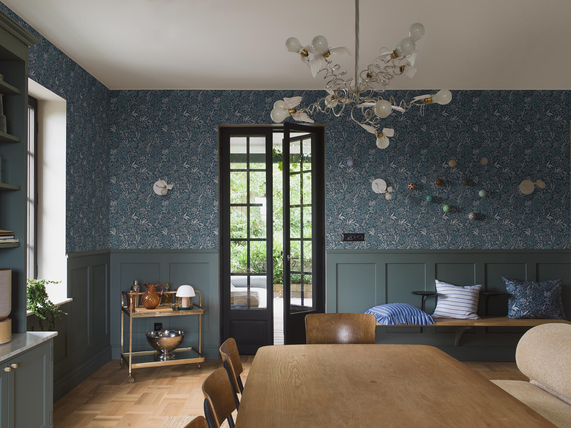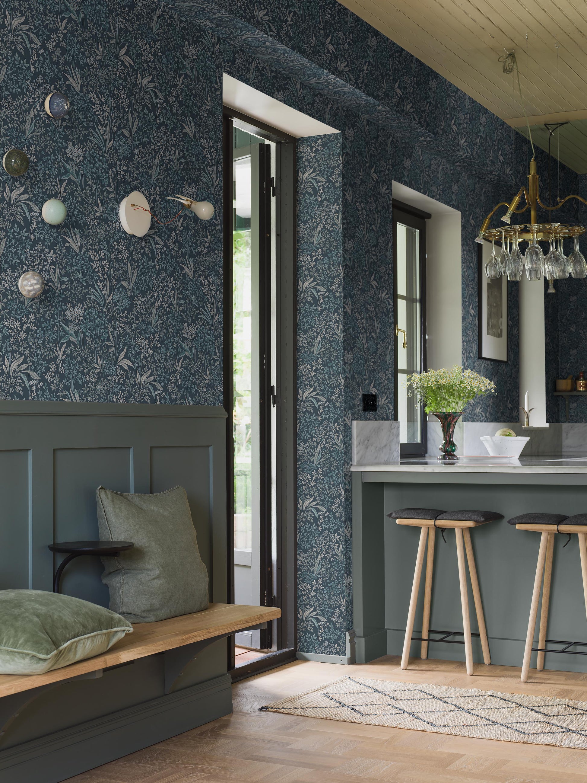 Kun löysimme arkistostamme Nocturne-tapetin käsinmaalatun alkuperäismallin, siitä puuttui päivämäärätiedot. Uskomme, että kuosi on luotu 1950-luvun alussa, mutta tiheässä, koristeellisessa lehvästössä on ajatonta tunnelmaa. Lumoavassa kuosissa on elinvoimaa ja luonnetta, vaikka se muodostaa rauhallisen taustan viihtyisiin, harmonisiin huoneisiin. Olemme suunnitelleet Nocturne-tapettiin useita värisävyjä, joista tämä sininen on yksi rakastetuimmista. Pehmeän tummansinisellä pohjalla on vaaleansinisen ja turkoosin sävyisiä lehtiä ja kirkkaan sinisiä yksityiskohtia.
