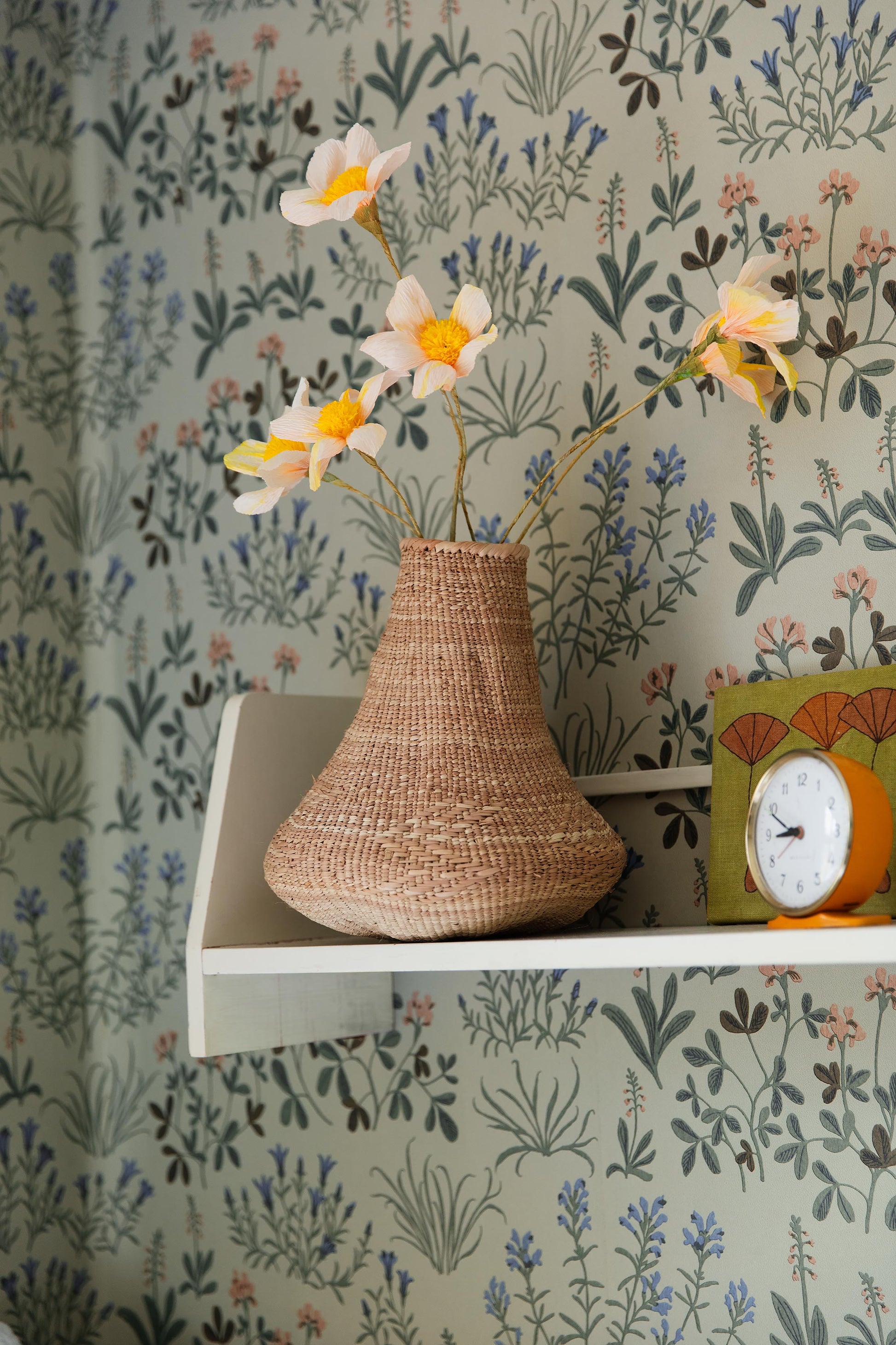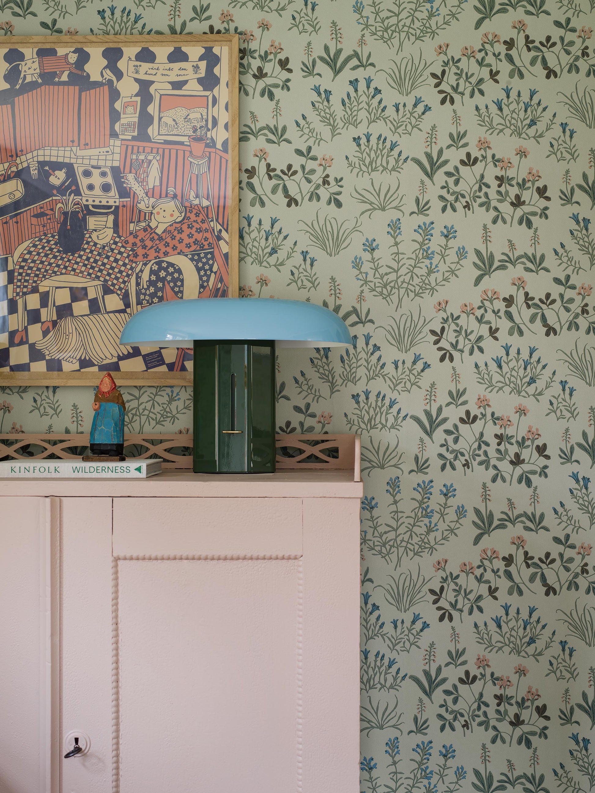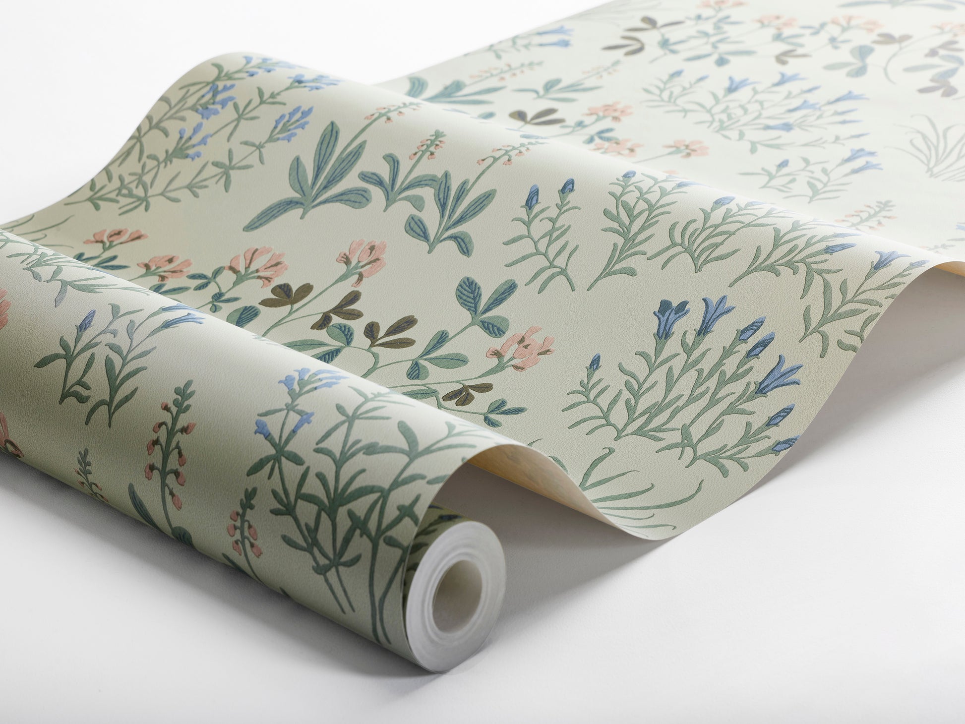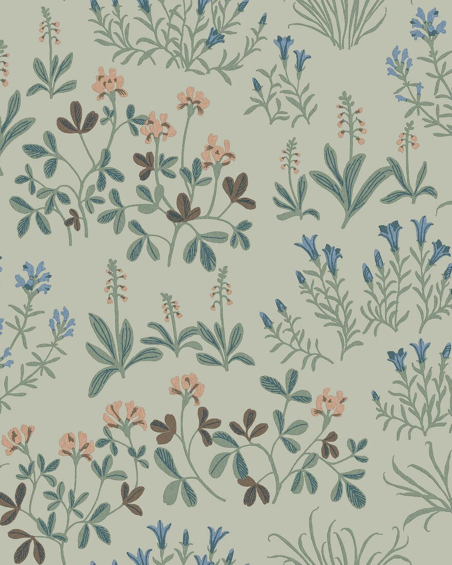 Vihreää Noras Äng -kukkatapettia koristaa isoampiaisyrtistä, hopeatoposta, kellokatkerosta ja muista uhanalaisista ruotsalaisista niittykasveista muodostuva ilmava kuosi. Muotoilija Nora Tysklindin suunnittelema suloinen ja kodikas tapetti huokuu nykyaikaista folkloristista tyyliä.Tässä Noras Äng -tapetissa on sinisen ja lämpimän puuteriroosan sävyisiä kukkia hennon vaaleanvihreällä pohjalla.