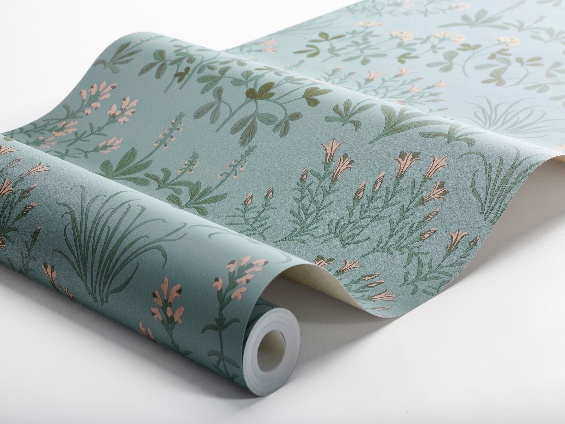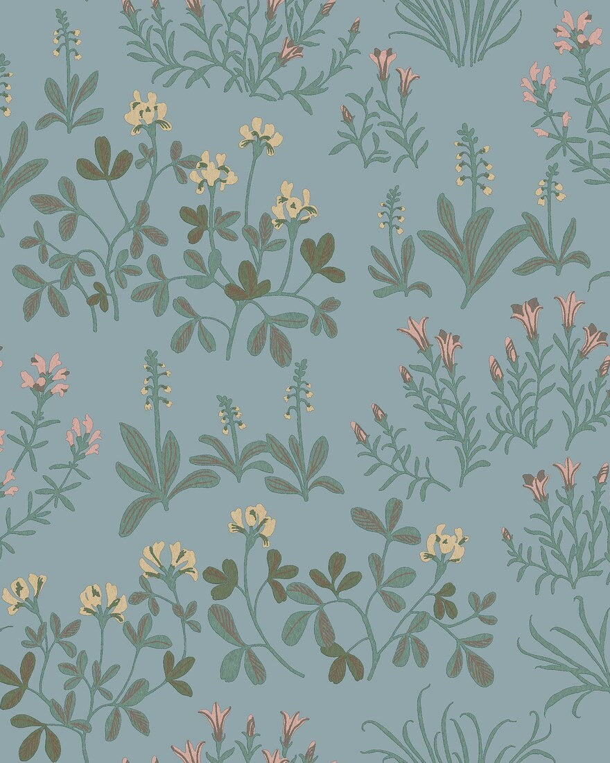 Noras Äng on harmaansininen kukkatapetti, jossa on uhanalaisista niittykasveista muodostuva kuosi. Ehkä tunnistat pikkumailasen, isoampiaisyrtin tai valkokämmekän? Nora Tysklindin suunnittelema kodikas, folkloristista tyyliä edustava tapetti.Tässä Noras Äng -tapetissa on vihreän sävyisiä lehtiä sekä hennon vaaleanpunaisia ja hunajankeltaisia niittykukkia viileän harmaansinisellä pohjalla.