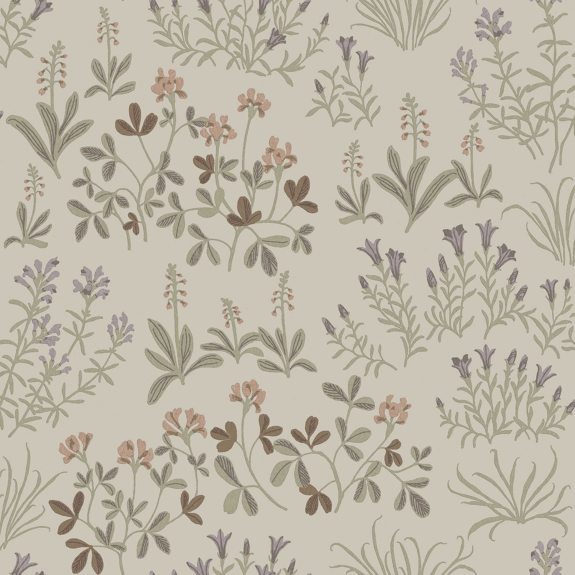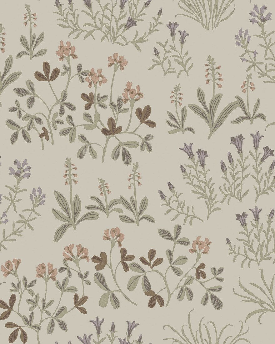 Noras Äng -kukkatapetti hurmaa pehmeällä ja hillityllä värimaailmallaan: puuterisen ruosteenroosan, violetin, ruskean ja harmaanvihreän sävyiset suloiset niittykasvit on painettu vaaleanharmaanruskeasta pellavanväriseen vivahtavalle pohjalle. Kodikas tapetti edustaa nykyaikaista folkloristista tyyliä.Muotoilija Nora Tysklind on ammentanut innoitusta niittyjen monimuotoisuudesta ja suunnitellut tapettiin useita uhanalaisia kasvilajeja, kuten isoampiaisyrtin ja hopeatopon.