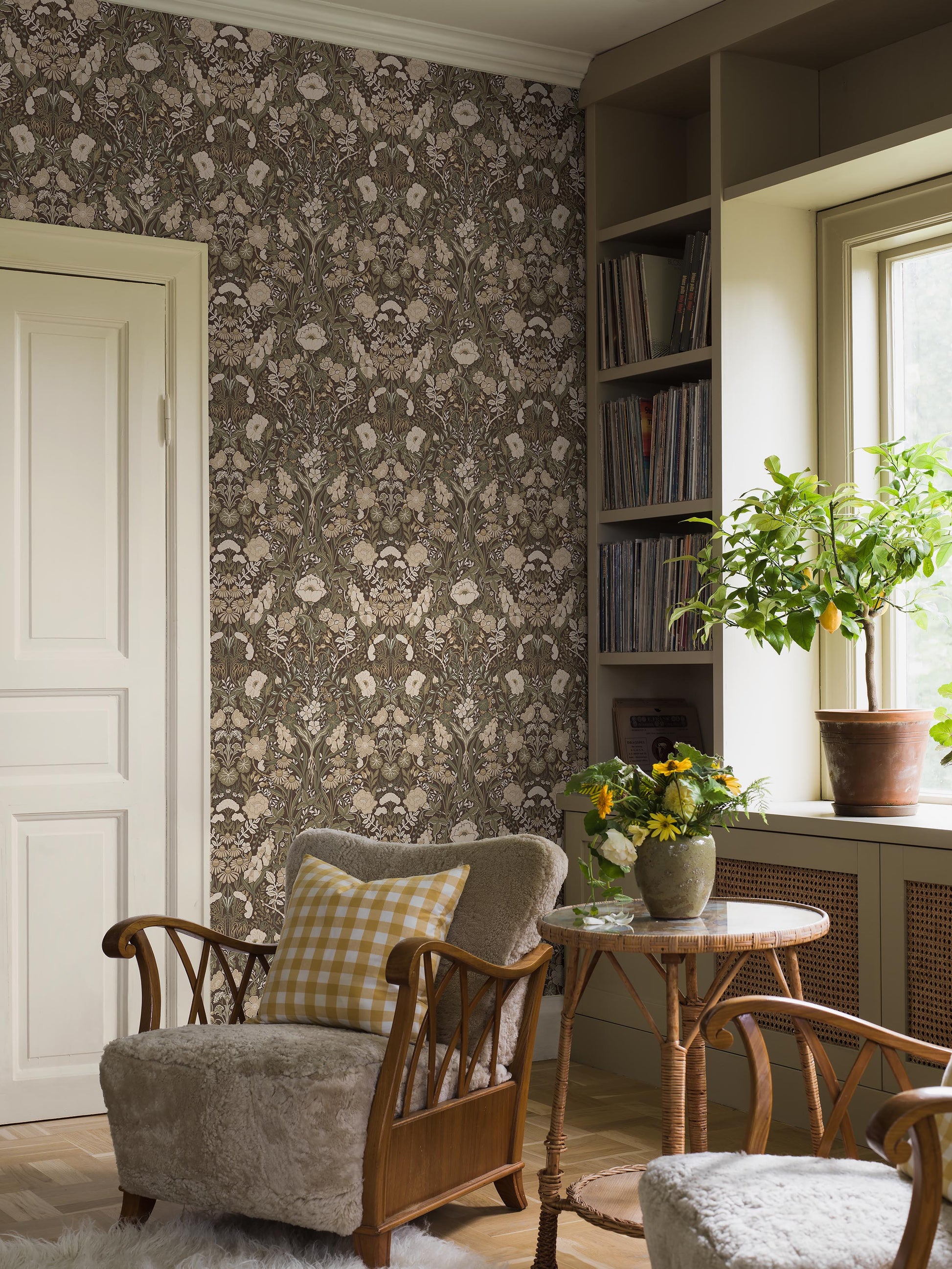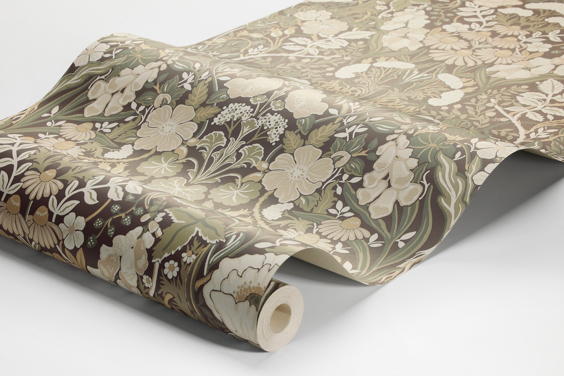 Timjami, hellehattu, kamomilla ja monet muut lääkekasvit ja yrtit koristavat Amanda Nordbladin suunnittelemaa Örtagård-kukkatapettia, joka on toteutettu kauniisti liimapainolla. Käsinmaalattu ja runsaan rönsyilevä kuosi on ilmeeltään moderni, mutta siinä on selkeitä viittauksia Arts & Crafts -kauden tiiviisiin ja yksityiskohtaisiin kuviointeihin.Tämän Örtagård-tapetin vihreät sävyt käyvät hyvin yhteen valkoisten listojen ja puukalusteiden kanssa. Tapetissa on haaleaa oliivin- ja jadenvihreää, beigeä ja valkoista hillityn tummanruskealla, lähes mustalla pohjalla.