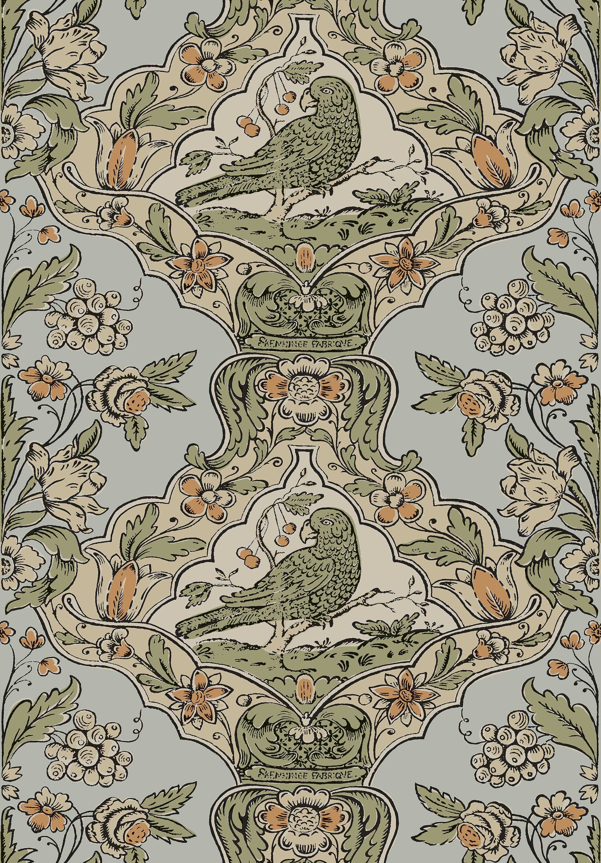 1700-luvun Skenninge-tapettia koristaa näyttävä ja loistelias koristekuvio, jossa on lintuja, viinirypäleitä, kirsikoita ja muita kauniita yksityiskohtia. Kuosissa on myös teksti Skenninge Fabrique, ja kenties juuri Skänningen kaupungissa sijaitsi yksi Ruotsin ensimmäisistä tapettitehtaista? Juuri tämä tapetti on nimittäin Nordiska-museon kokoelmien vanhin Ruotsissa valmistettu paperitapetti. Uniikki pala tapettihistoriaa!Skenninge-tapetin uudelleen tulkinnassa on pehmeitä vihreän ja ruosteenpunaisen sävyjä ja lempeää hunajankeltaista lämpimän vaaleansinisellä pohjalla.