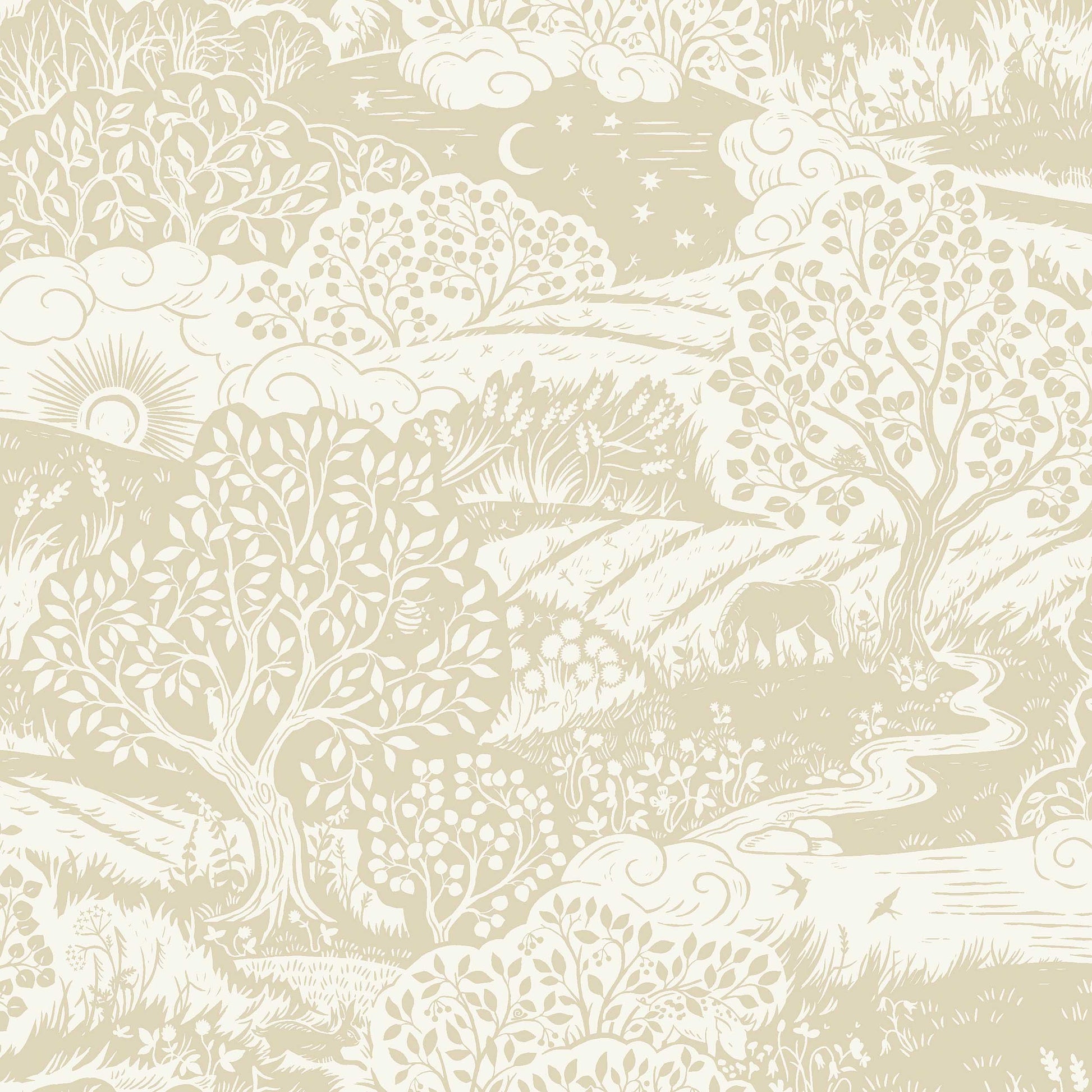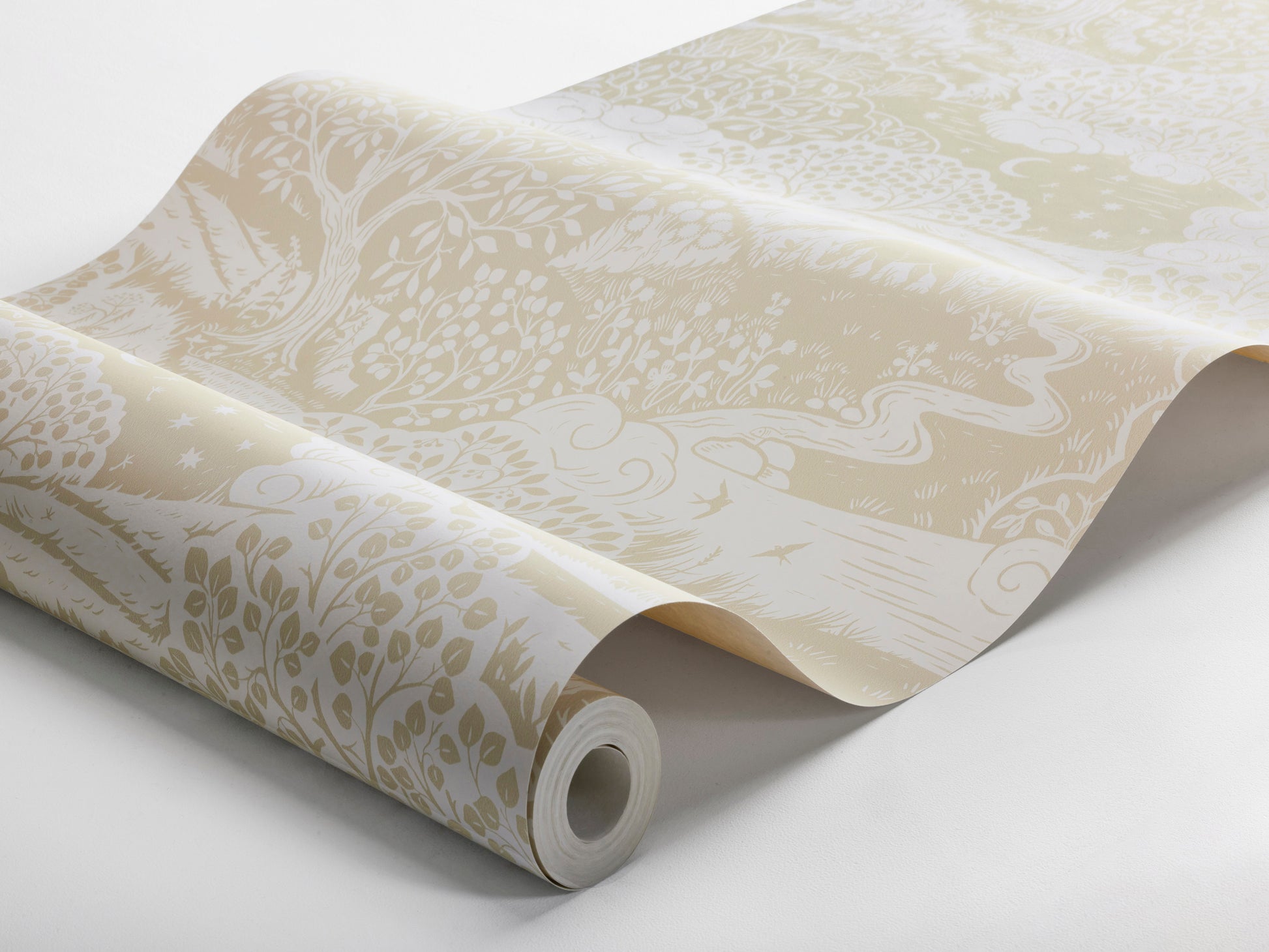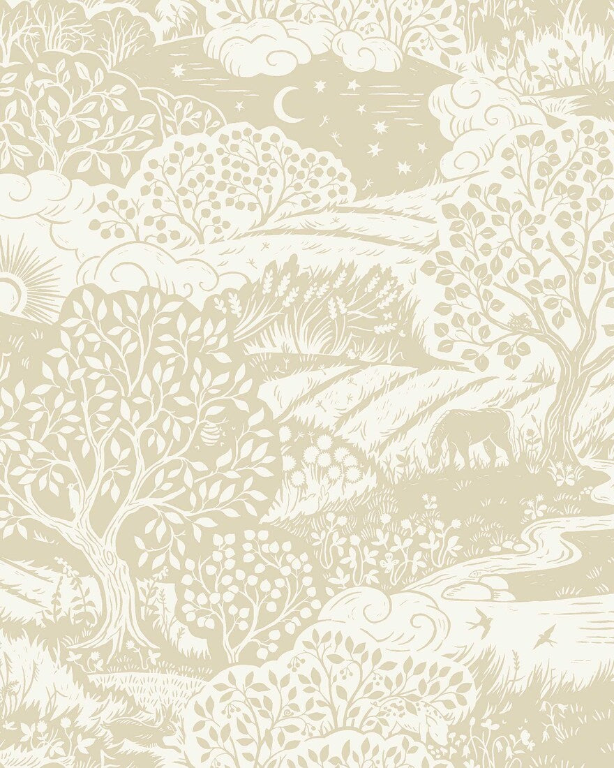 Solängen-tapettia koristaa Jenny Hahne Gaddin luoma upea maisema. Se on saanut inspiraationsa Jennyn hienoimmasta kävelyretkestä. Tapetista voi löytää niin pääskysiä ja sudenkorentoja lentämässä korkealla taivaalla kuin hevosen ja jäniksen ruokailemassa apiloiden ja voikukkien keskellä. Huomaatko riikinkukon? Ja mehiläiset?Ohessa on Solängen-tapetin kaunis maisema kermanvalkoisena ja vaalean kaurankeltaisena.