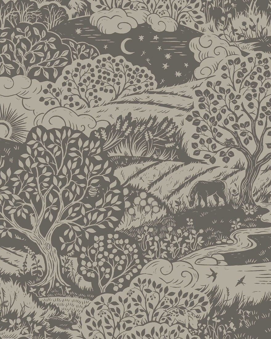 Kuviollinen Solängen-tapetti on täynnä kauniita pieniä yksityiskohtia. Suunnittelija Jenny Hahne Gadd on luonut taianomaisen maiseman, jossa jänikset, hevoset, pääskyset ja muut eläimet liikkuvat vapaasti metsälehdoissa, kukkaniityillä ja kumpuilevilla vehnäpelloilla. Tässä näet Solängen-tapetin pehmeän grafiitinharmaan ja pellavabeigen hillityissä sävyissä.