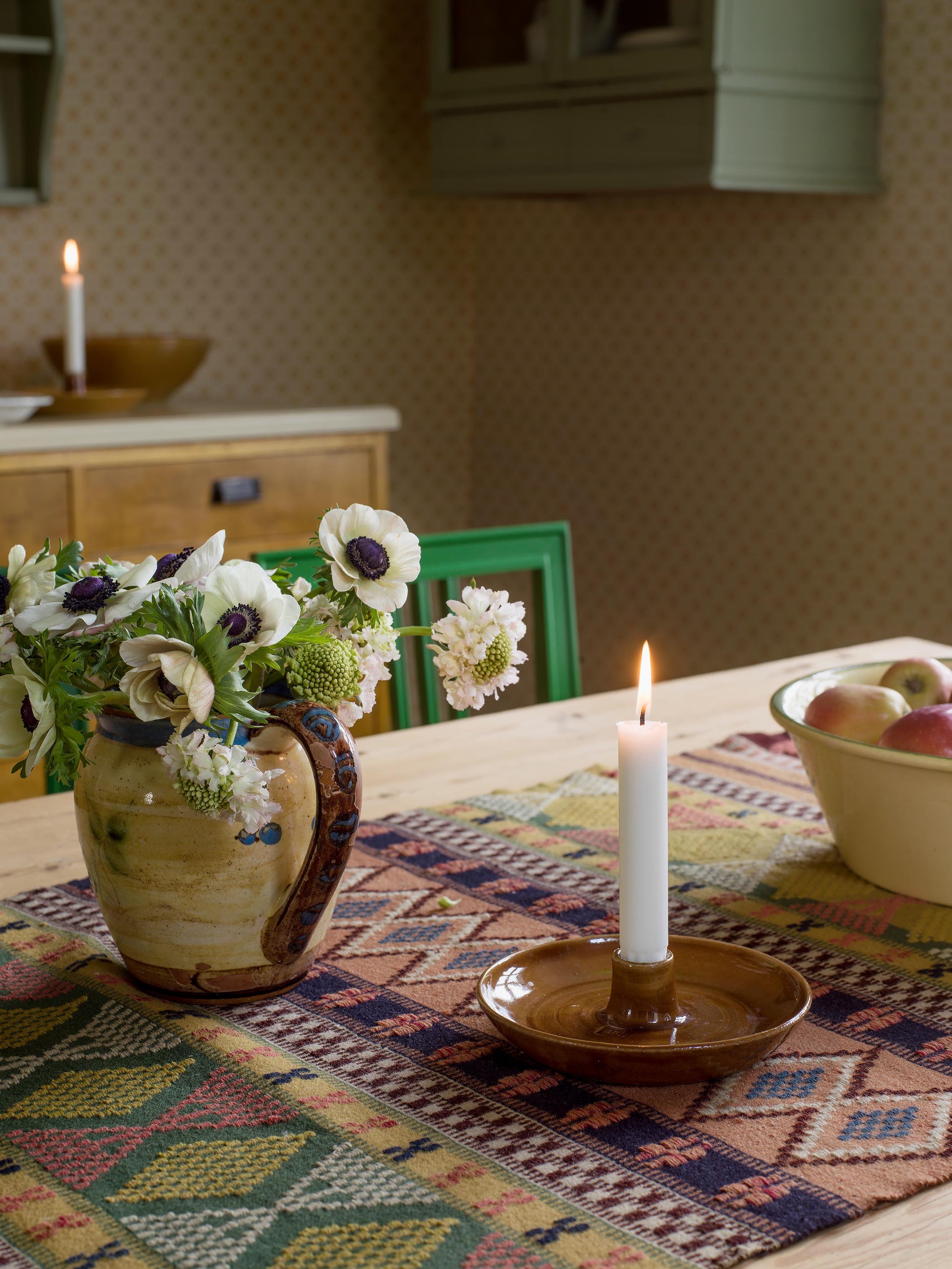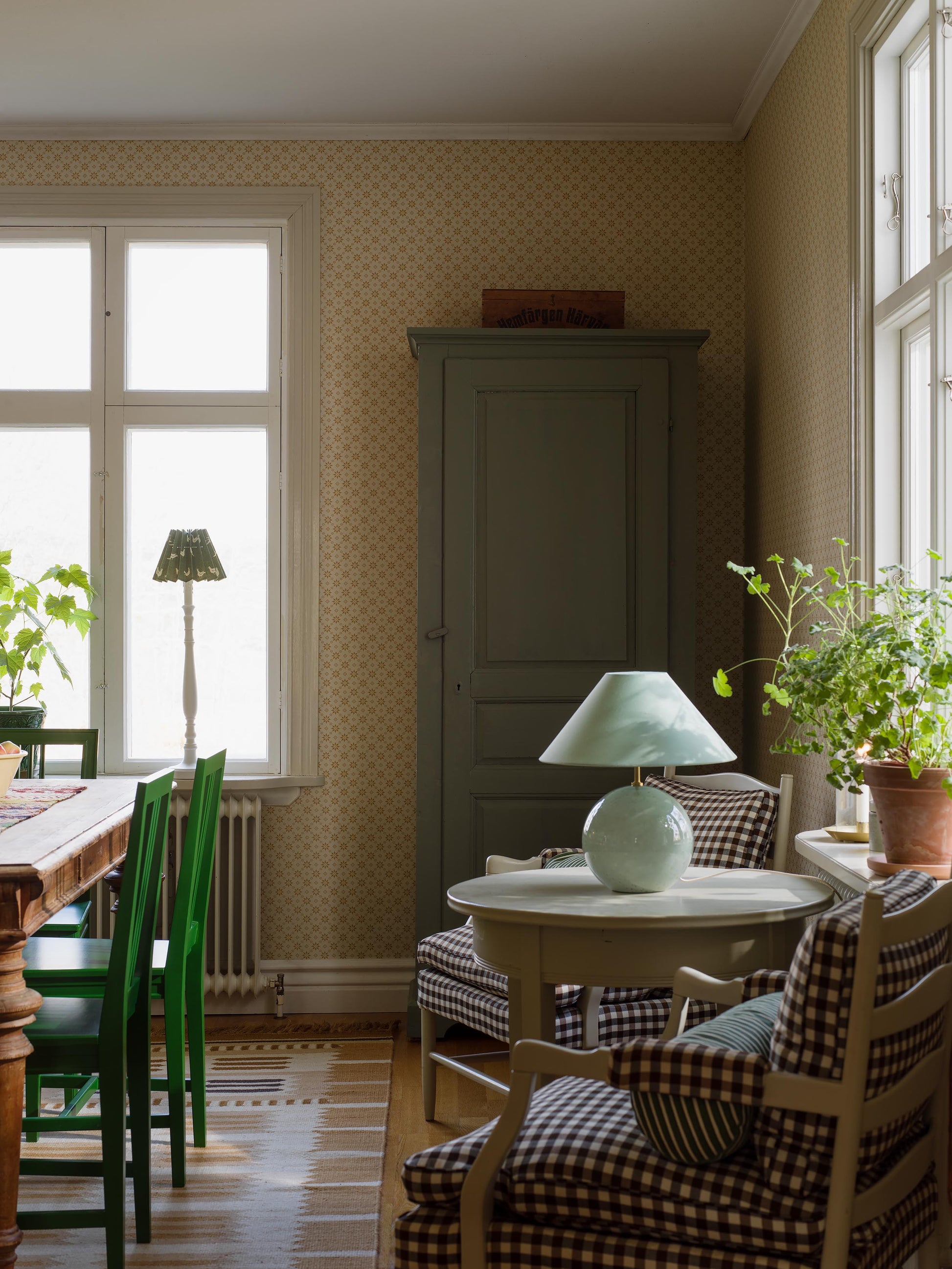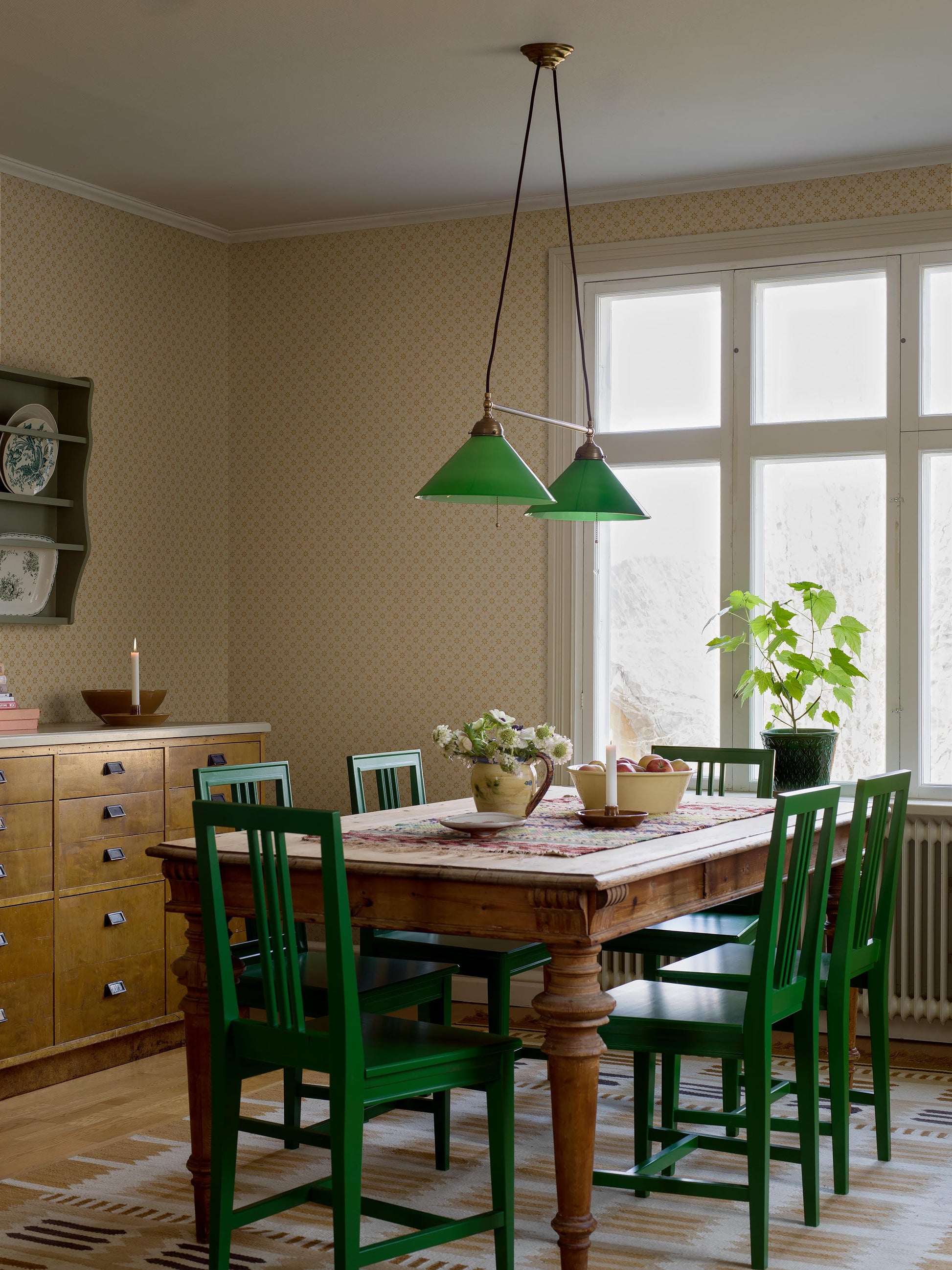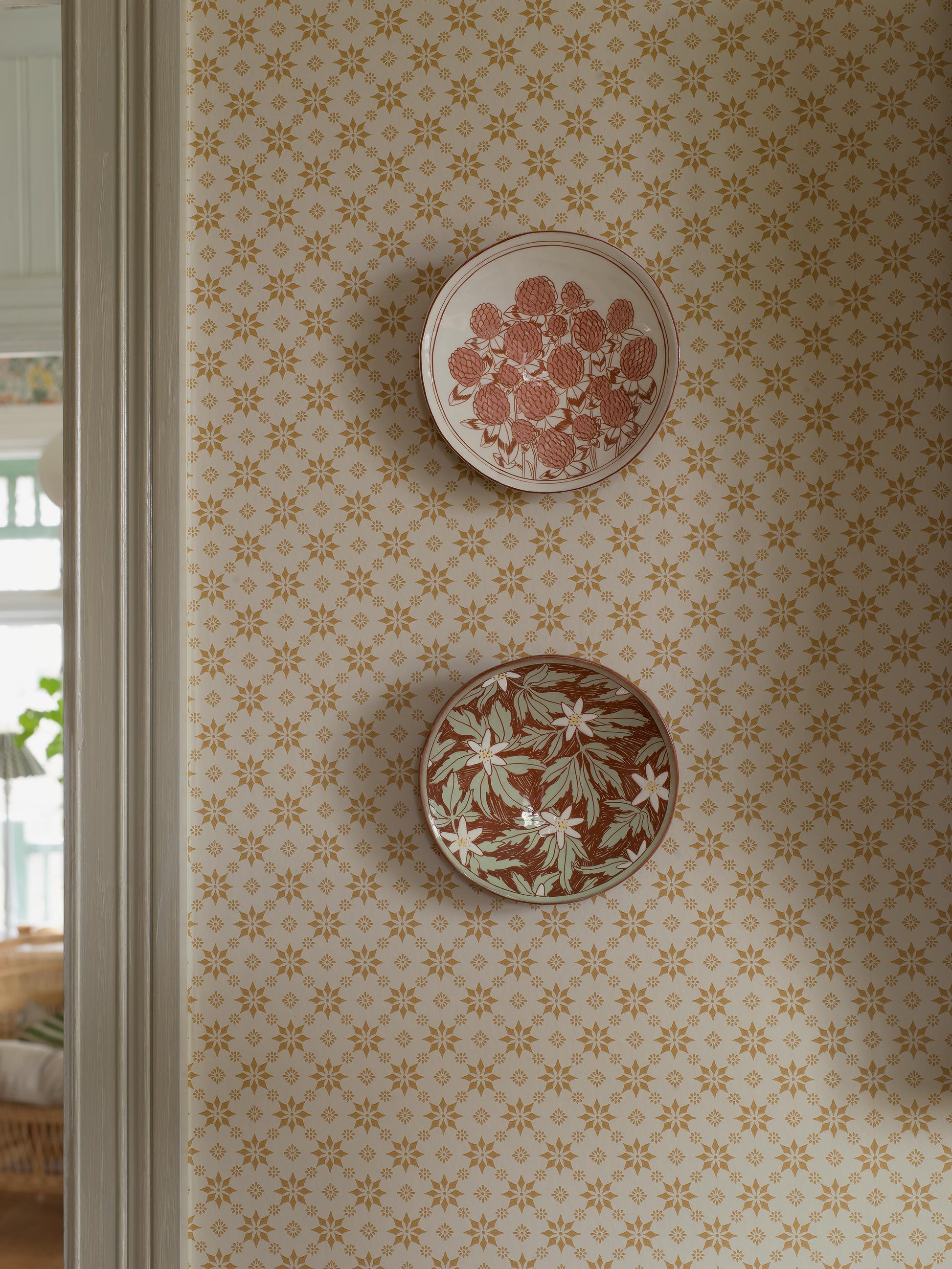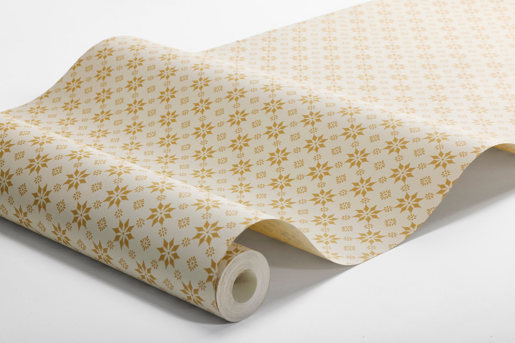 Stella on pienikuvioinen tapetti, jossa on suloinen, erikokoisten tyyliteltyjen tähtien muodostama geometrinen kuvio. Klassinen ja kodikas vuosisadan vaihteen tapetti omasta arkistostamme. Tapetti on peräisin vuosilta 1880–1890. Tämäntyyppiset kuviot olivat erittäin suosittuja 1800-luvun lopulla, ja koska ne näyttävät samanlaisilta eri suunnista katsottuina, niitä käytettiin usein sekä seinässä että katossa. Tässä Stella-tapetissa on lämpimät, kodikkaat värisävyt ja okrankeltaisia tähtiä luonnonvärisellä/vaalean beigellä pohjalla. Pehmeä liimapainatus antaa tapetille elävän, lähes kosketeltavan pinnan ja käsityönomaisen ilmeen.