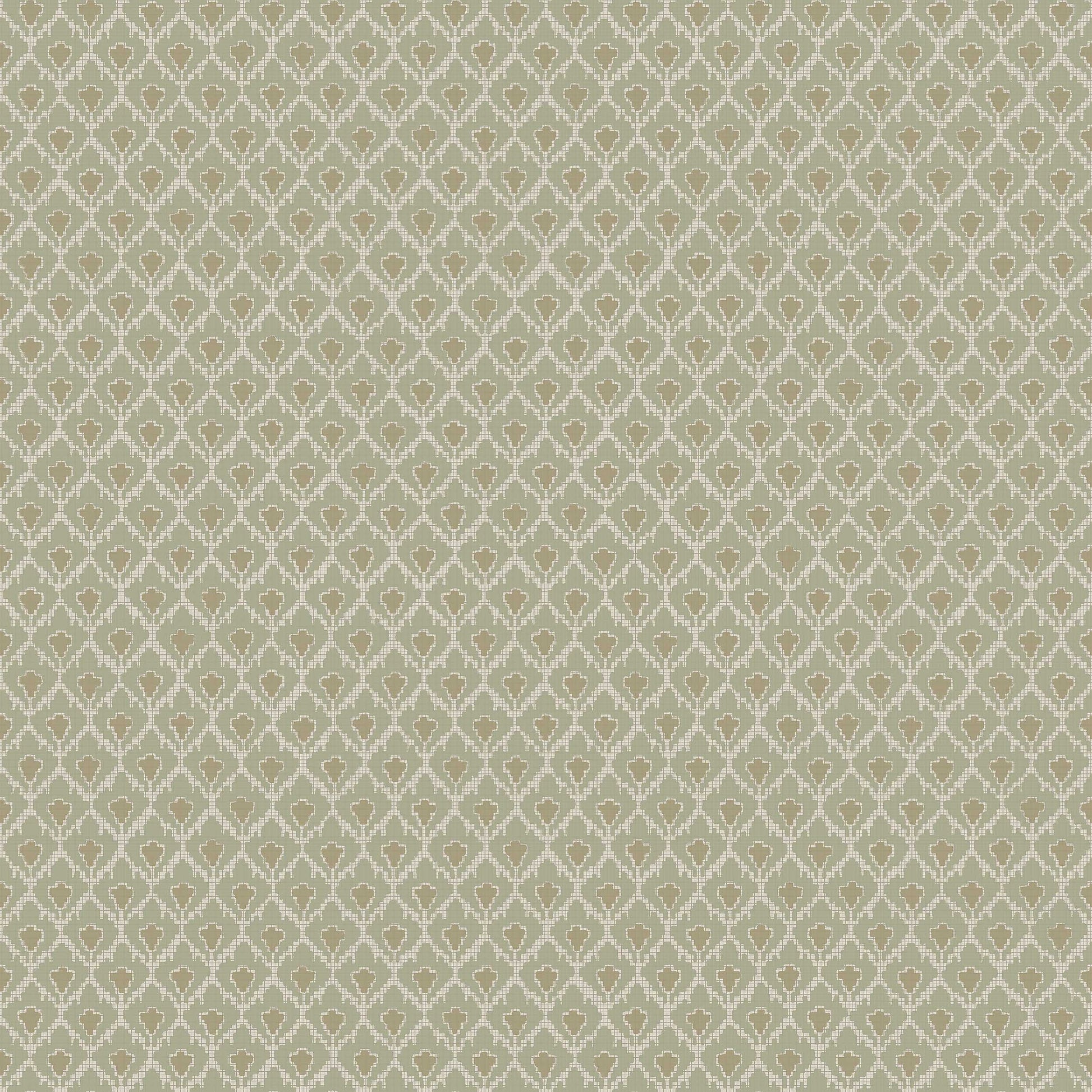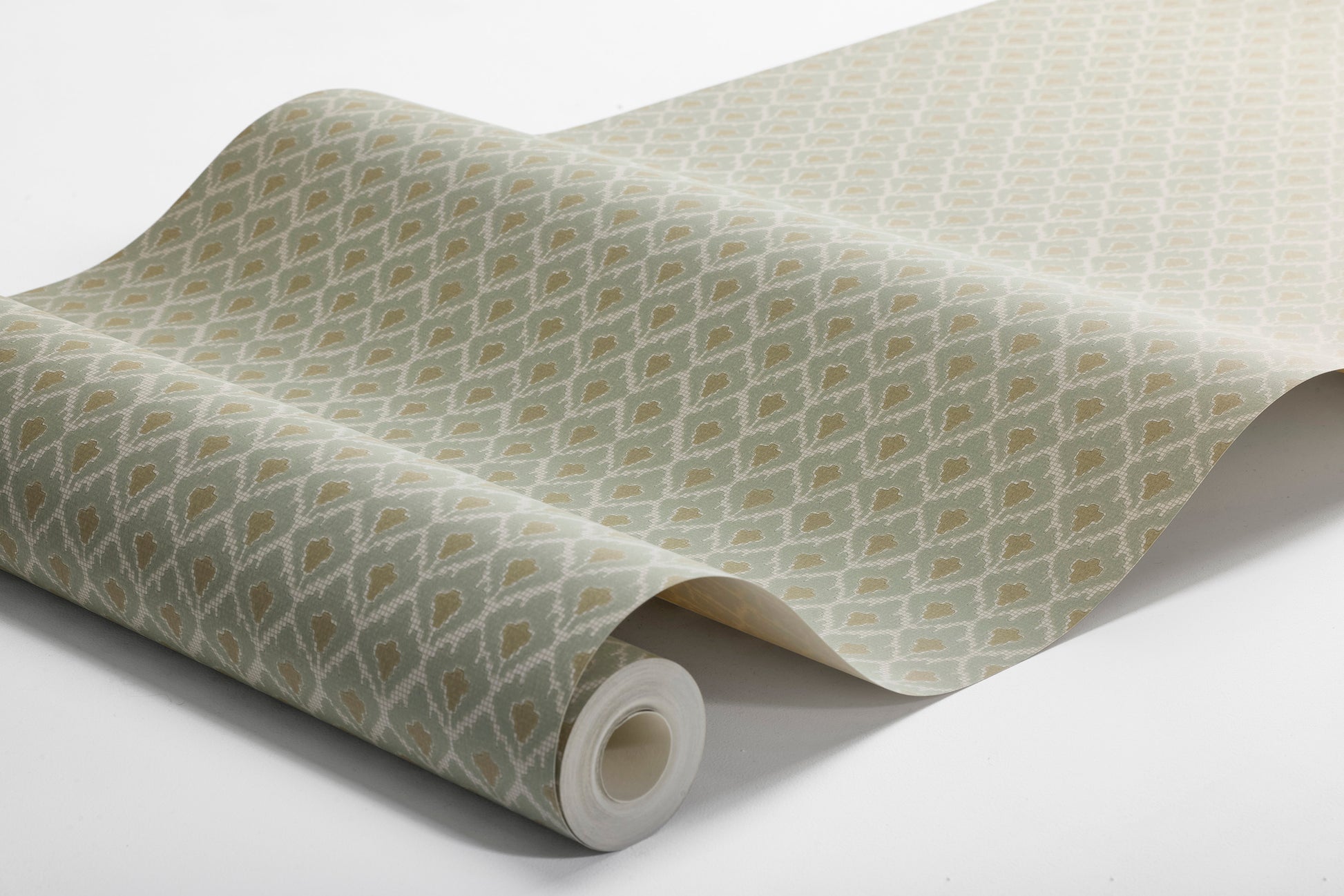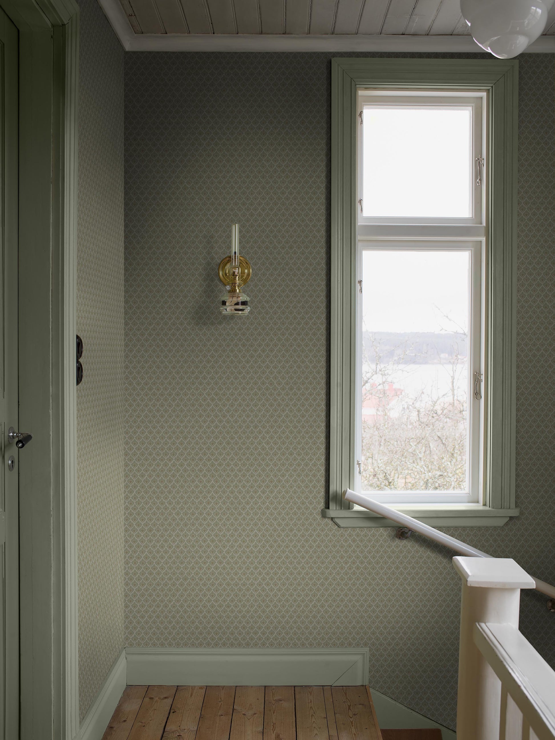 Pienikuvioista Svea-tapettia koristaa niin kutsuttu gobeliinikuvio, ja tapetin pohjassa on pieni tekstiilimäinen ruutukuvio. Ruutukuvio pehmentää kokonaisuutta ja luo huoneeseen viihtyisän ja pehmeän tunnelman. Gobeliinitapeteista tuli erittäin suosittuja vuodesta 1915 alkaen ja ne olivat suosittuja vielä 1920-luvullakin, ja uskomme, että Svea on tältä aikakaudelta. Kuoseissa nähtiin usein tiheään aseteltuja kukkia tai lehtiä, kuten suositussa Waldemar-tapetissammekin. Svea-tapetissa on kuitenkin pienempi ja abstraktimpi kuvio.Tässä Svea-tapetissa on lämpimiä ja pehmeitä vihreitä sävyjä ja korostusvärinä okranruskeaa. Luonnonvärisessä pohjassa on harmaa rasterikuvio. Rauhallinen ja miellyttävä tapetti, joka näyttää kaukaa katsottuna yhtenäiseltä pinnalta.