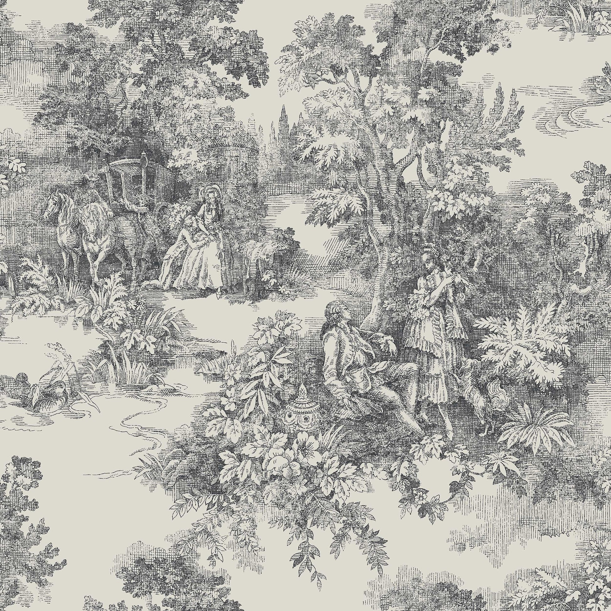 Historiallisen arkistomme Toile de Jouy -tapetti on rakastettu klassikko, jota on julkaistu vuosien varrella useissa eri väreissä. Romanttinen maalaistyylinen tapetti, jossa on noenmusta maisema vaaleata harmaanbeigeä taustaa vasten. Toile de jouy (= kangas Jouysta) on myös yleisnimi tämän tyyppiselle kuviolle, jossa on unenomaisia kohtauksia vehreissä maisemissa painettuna kankaalle tai tapetille.