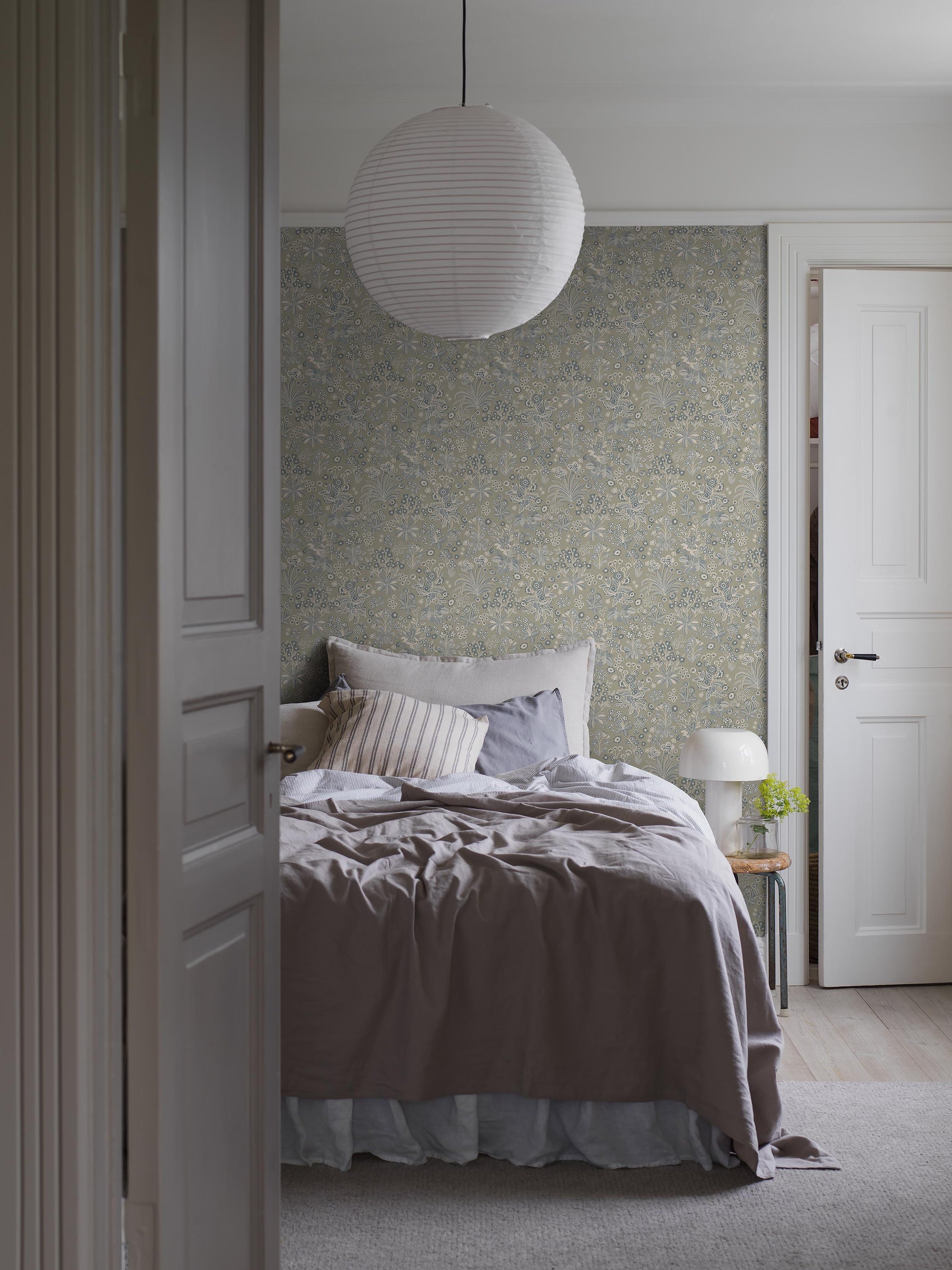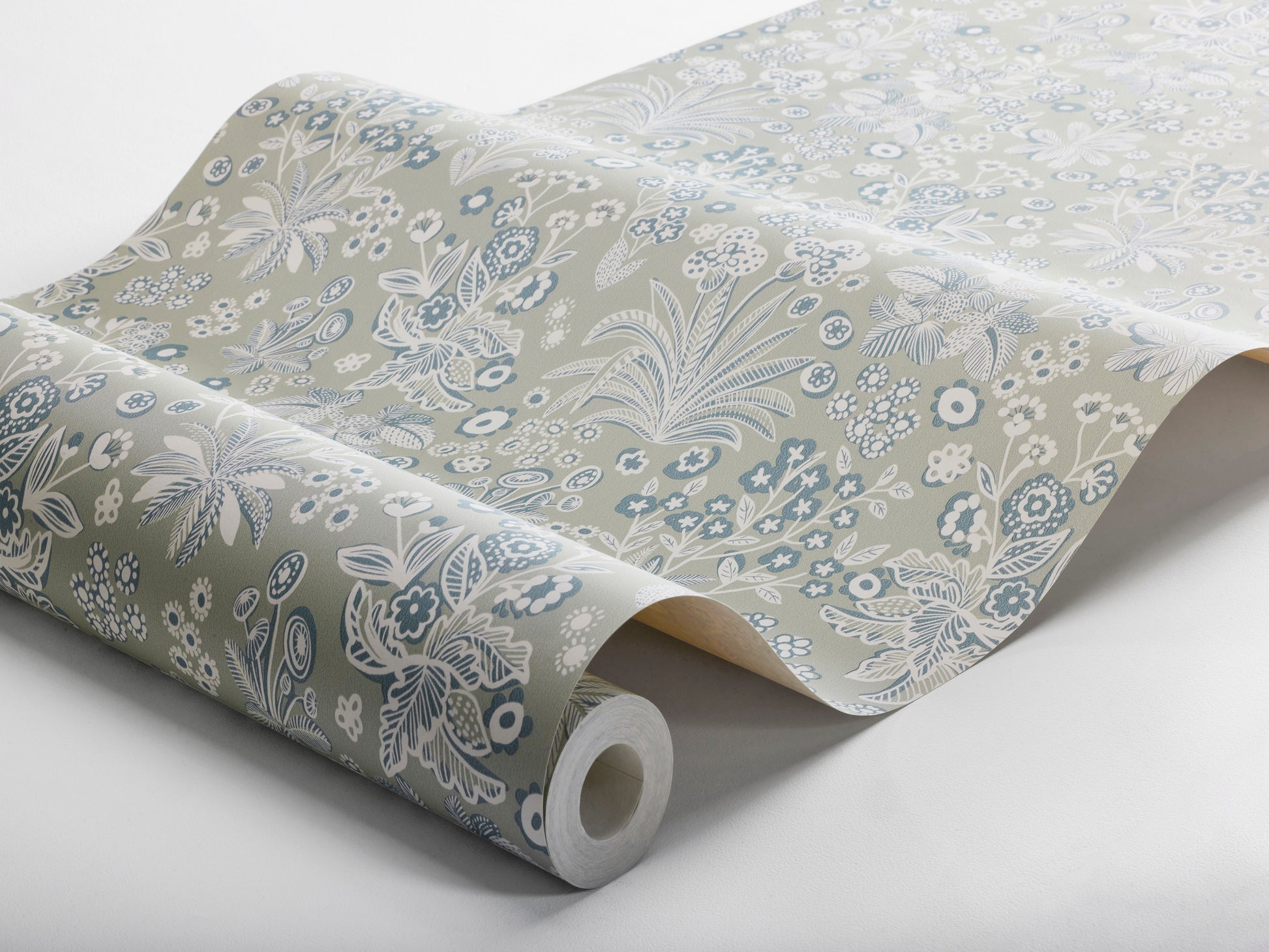 Tuva-kukkatapetti on täynnä pieniä somia mielikuvituskukkia. Tiivis kuosi sisältää monia kauniita yksityiskohtia, mutta näyttää seinällä kuitenkin rauhalliselta ja harmoniselta.Ajattoman ja kodikkaan Tuva-tapetin tässä versiossa on kermanvalkoisia ja hillityn petrolinsinisiä yksityiskohtia pehmeän vaaleanvihreällä pohjalla.