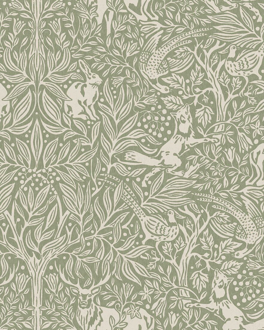 Under the Elder Tree -kuviotapetti sopii niin pienille kuin isoillekin. Etäältä seljan lehden muodostavat levollisen ja yhtenäisen pinnan. Lähempää katsottuna tapetista paljastuu leikkisiä yksityiskohtia, kuten komea saksanhirvi ja kettua orapihlajapensaaseen pakenevia fasaaneja. Kuosi on kuin pieni kertomus, joka on saanut inspiraationsa metsästä, Arts & Crafts -tyylistä ja keskiajan gobeliineista. Tapetti liimapainetaan useissa väreissä, tässä puuterisen tummansinisellä pohjalla ja vaalean harmaanbeigeillä yksityiskohdilla.