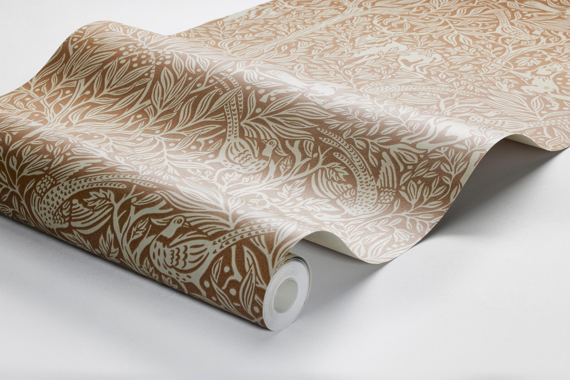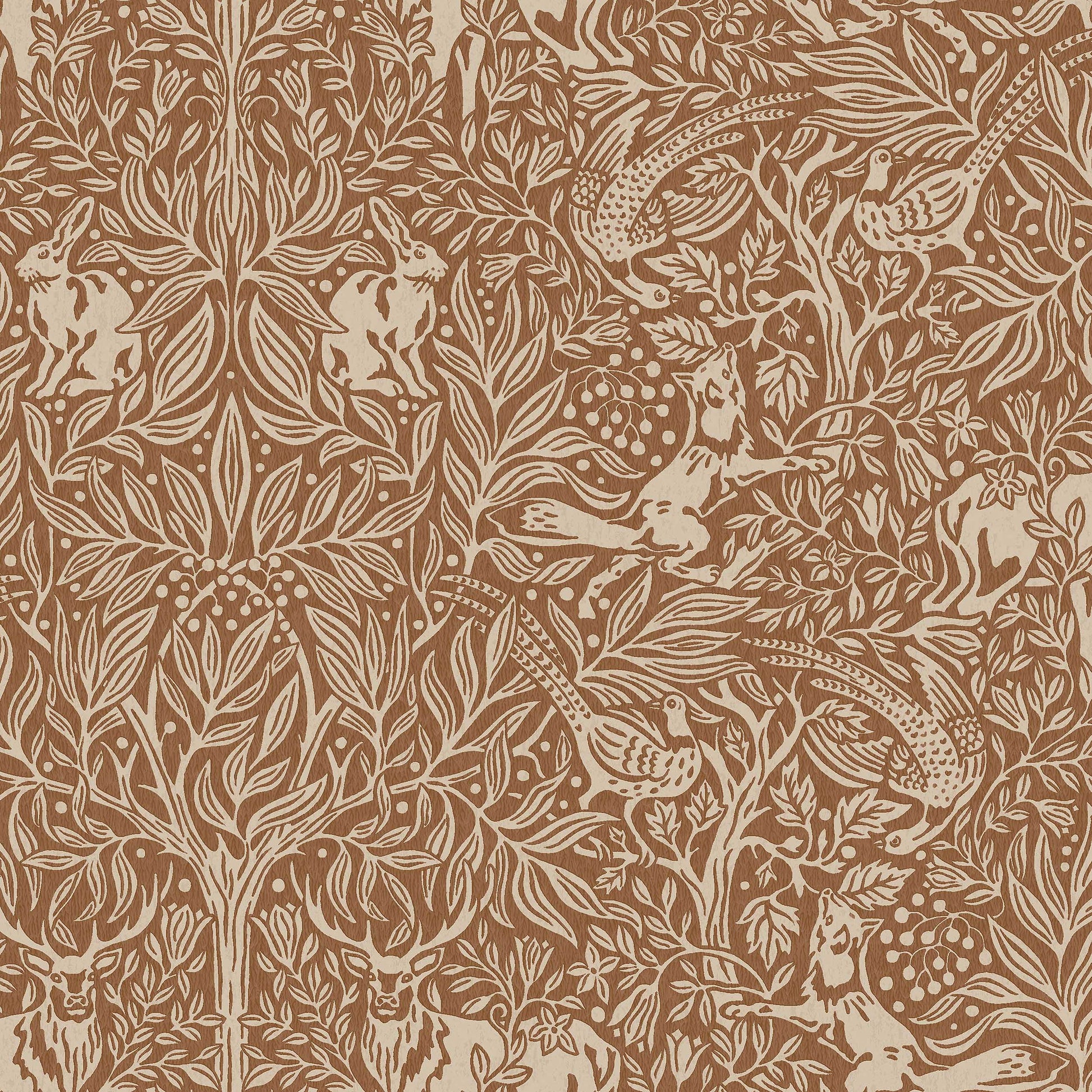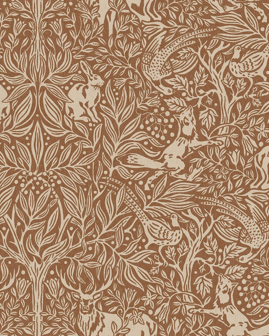 Under the Elder Tree -tapetin leikkisä luontokuosi on saanut inspiraationsa metsästä, keskiajan gobeliineista sekä edellisen vuosisadanvaihteen Arts & Crafts -tyylistä. Kauempaa katsottuna seljan lehdet luovat seinälle harmonista virtaa. Lähempänä tapetista paljastuu yksityiskohtia, kuten majesteettisia saksanhirviä ja jäniksiä, jotka kurkistelevat piilopaikoistaan. Liimapainetaan useissa väreissä, tässä lämpimän punaruskeana vaalean harmaanbeigeillä yksityiskohdilla.