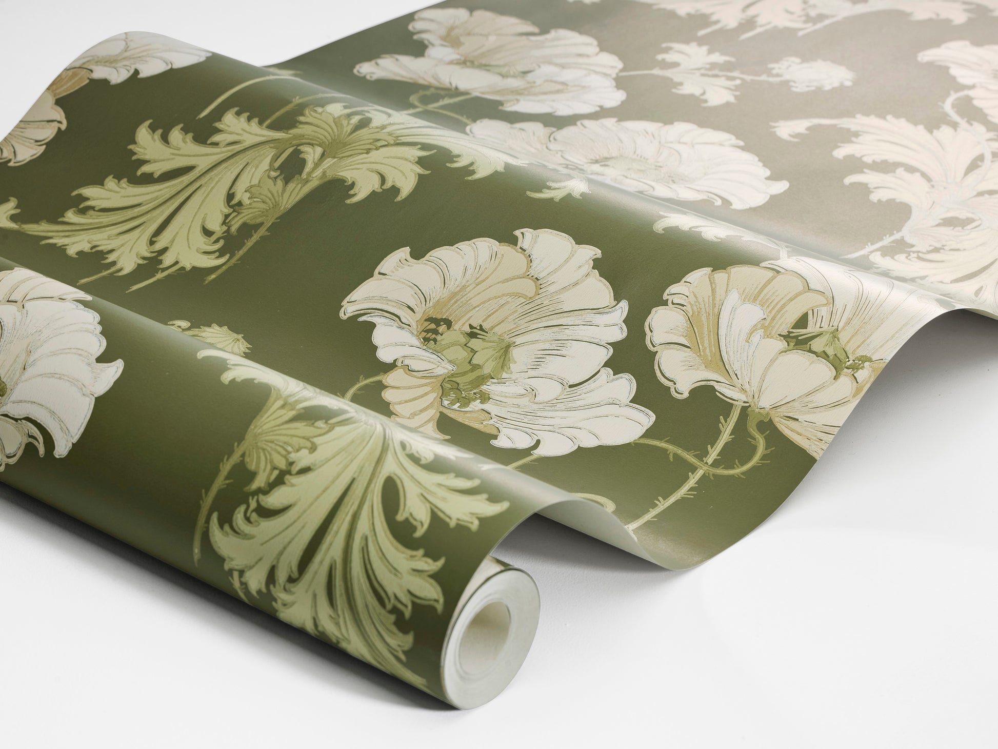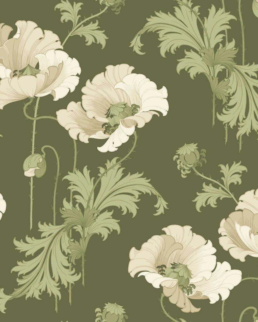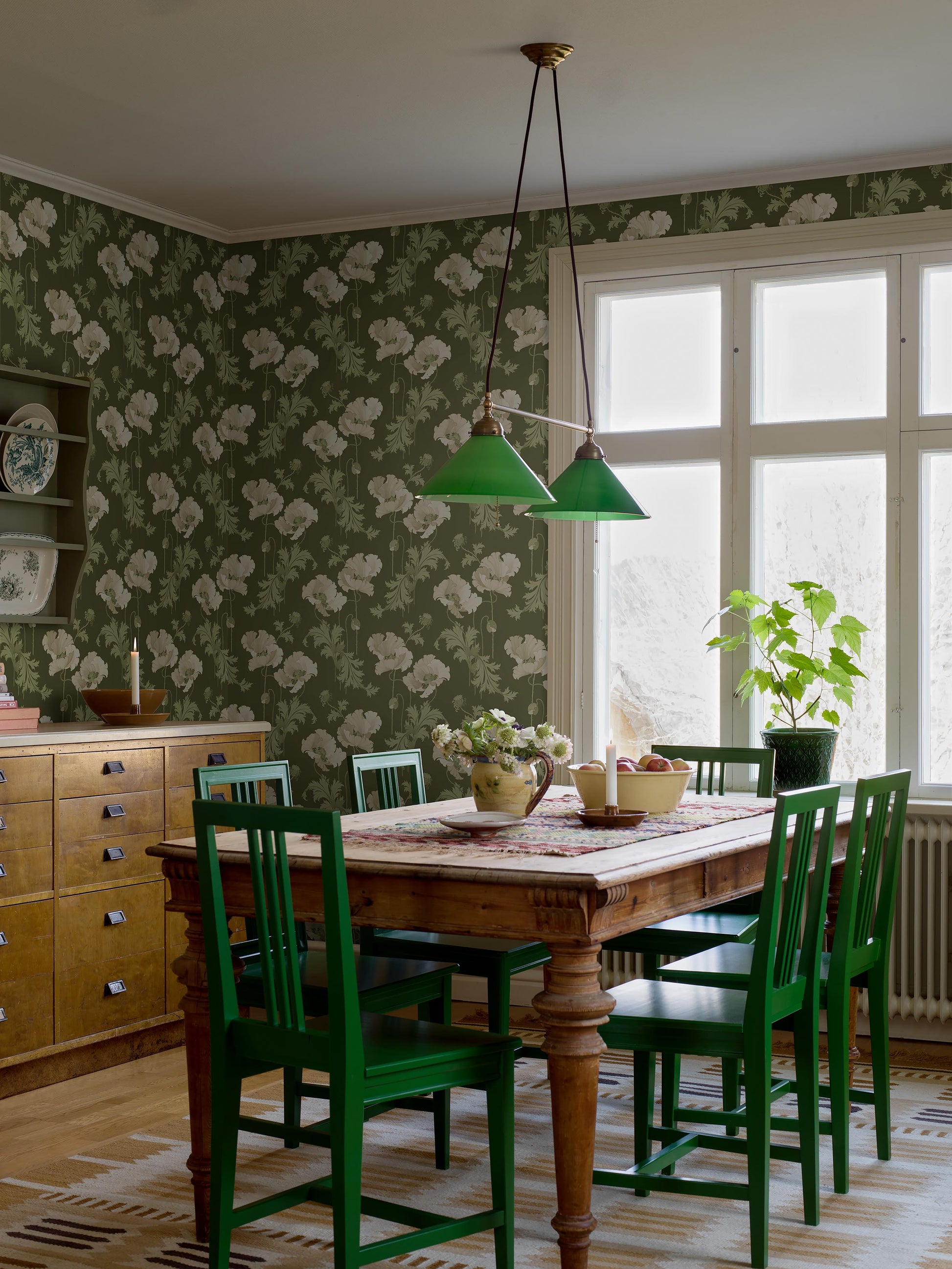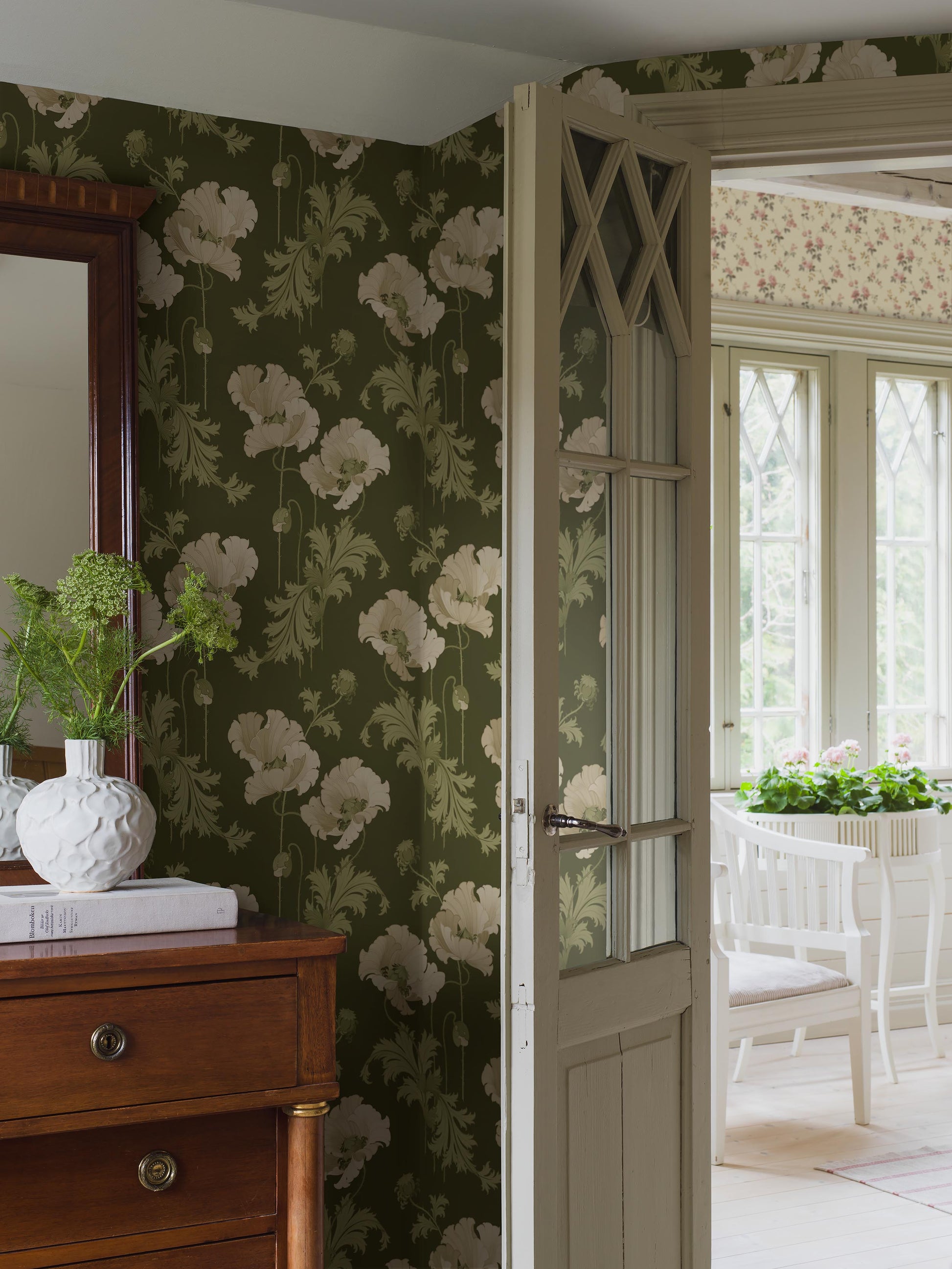Suurikukkainen Vallmo on upea jugendtapetti, jossa on yksityiskohtaisia unikkoja kukan kaikissa kauniissa vaiheissa: nuppuina, kukkina ja siemenkotina.Kuosi on peräisin 1900-luvun alkupuolelta ja tuotu nykyaikaan modernilla värimaailmalla, jossa on hentoja lämpimän valkoisia kukkia ja raikkaan vihreitä lehtiä syvän tummanvihreällä pohjalla. Liimapainatus antaa tapetille eloisan pinnan ja upeaa luonnetta.